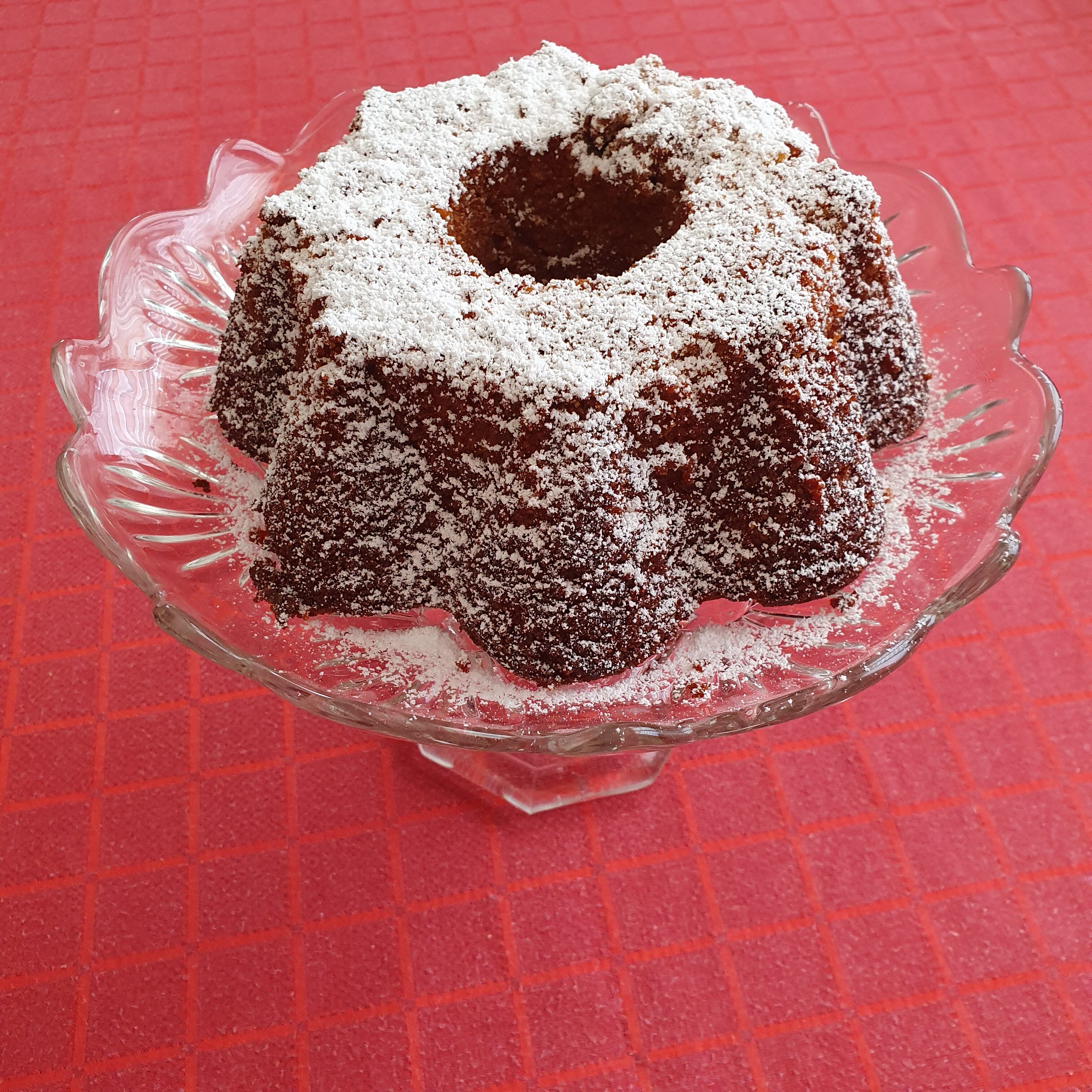 Обърнете кекса върху чиния за сервиране и поръсете с пудра захар, след което сервирайте.