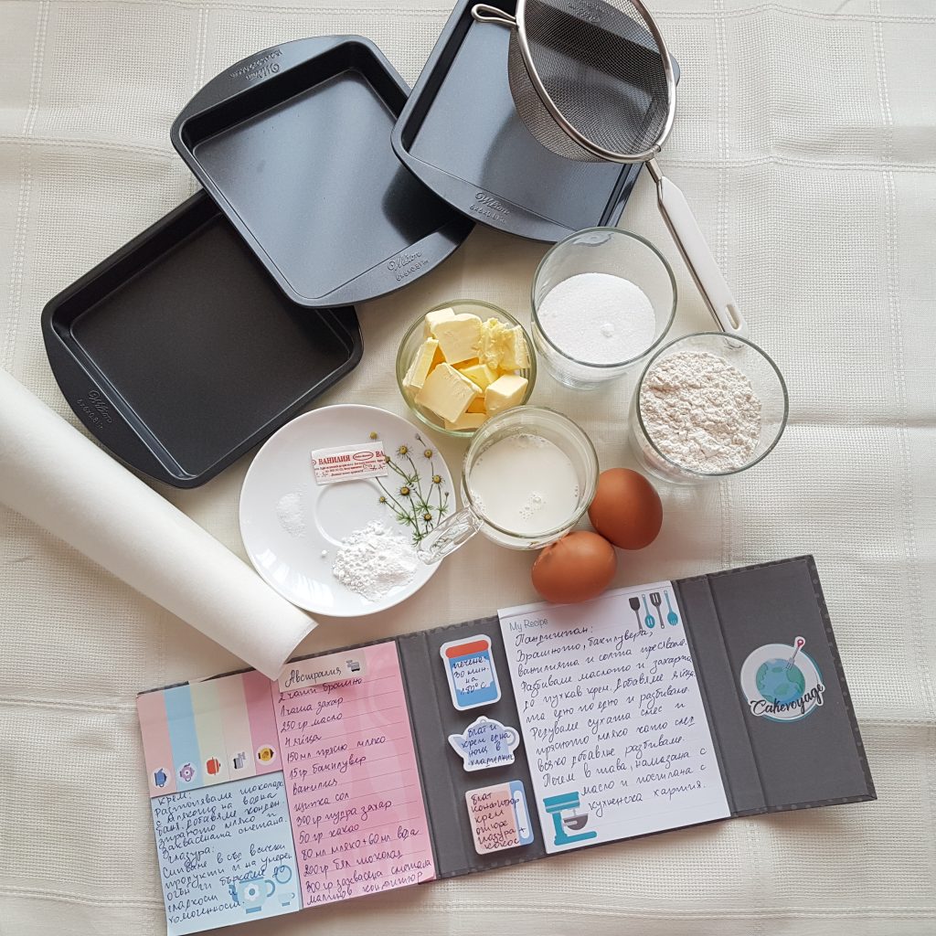 I’m starting with the batter for the sponge cake. The oven is heated to 180 degrees. The tray is covered with baking paper and the tray sides are oiled with a little grease in order to avoid the batter from sticking to the sides. In general, I do not sift the flour because I do not have such a habit, but in this case it’s absolutely necessary to sift the dry ingredients (flour, along with baking powder, vanilla and a pinch of salt) to properly raise the sponge cake. In a bowl, beat to a fluffy mixture, the softened butter and sugar with a mixer. Then add the eggs to this mixture one by one and after each egg is being added, beat the mixture until smooth. Finally, add in turns the milk and the dry mixture and mix with an egg beater. Make a very thick mixture that is after poured into the tray and flatten well with a spatula. Then bake for about 30 minutes at 180 degrees (or to a dry stick). Remove the cake from the oven and allow it to cool slightly in the tray. Then lay it on a baking grid, separate it from the baking paper and wait for it to cool. Wrap it well (but not too tightly) in fresh foil and leave it on a suitable tray in the fridge for 1 night. It is necessary to cool down well in order to cut it easier into small pieces later.