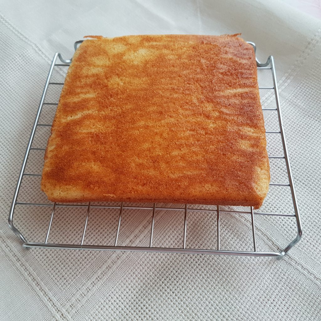 Because I wanted to make a small cake – a jewel, I used half of the products in the recipe. I baked three sponge cakes of 15.2×15.2 cm. I arranged two of them with jam and cream and finally added fresh raspberries. I finished with a third layer to resemble the shape of a box with a latch.