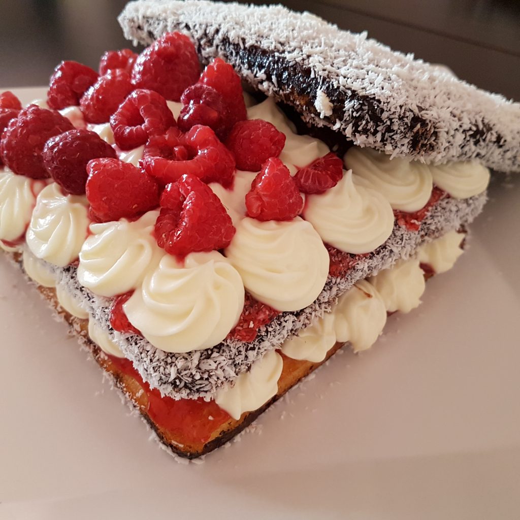 Welcome to station Australia. I decided to prepare and present you a “Lamington” cake. This is a traditional Australian dessert that enjoys great popularity in its home country and beyond. It’s widely enjoyed in the United States, and in the Western Balkans (Serbia, Macedonia, Croatia), the little pastries are known as “crap”.