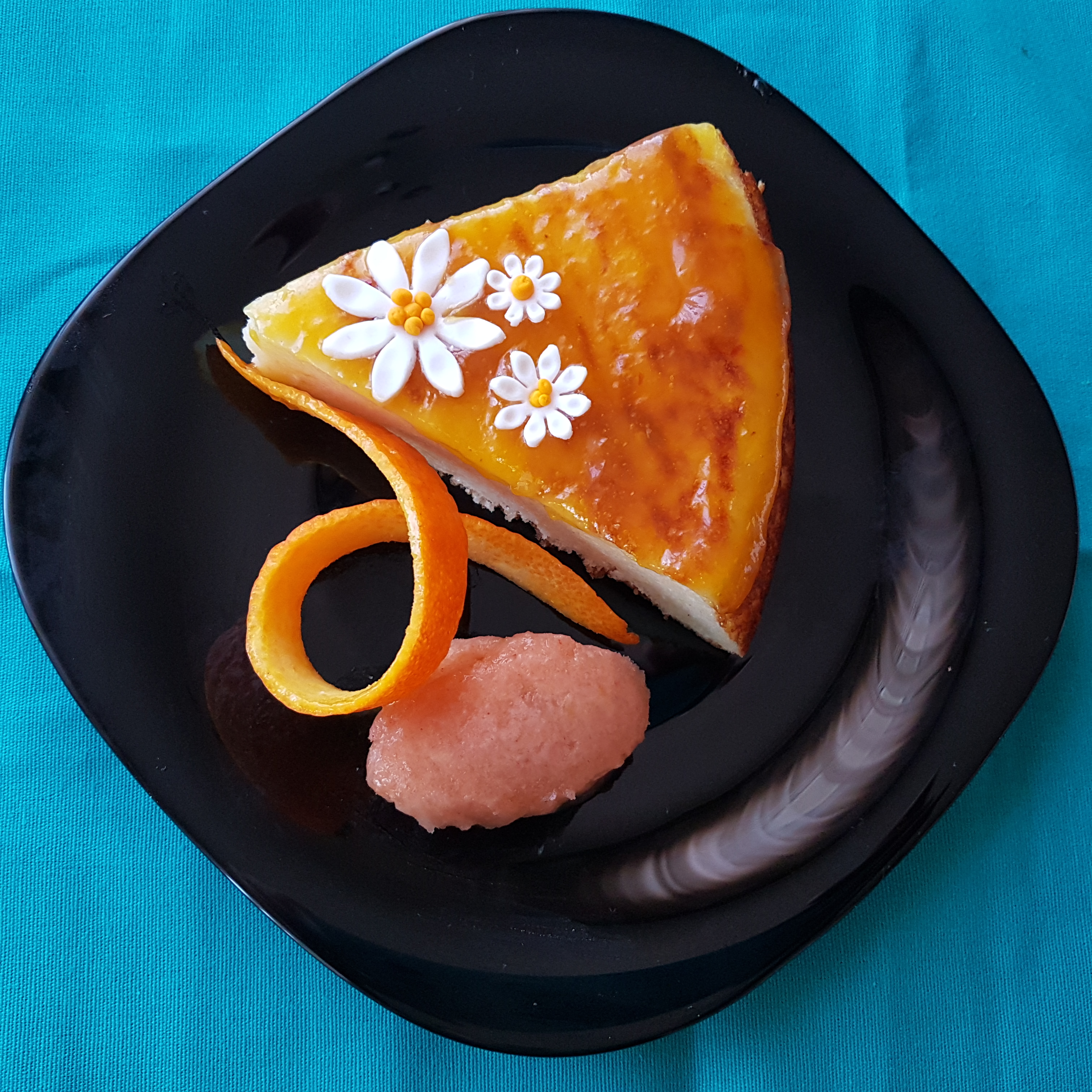Serve the pastry topped with honey, slightly warm jam or caramel. I chose to put jam with mango, orange and chili. Yes, chili! A slightly spicy taste was obtained. For splendor and mood I made some decorations of fondant and orange peel. Plate and serve this cake with the orange – banana sorbet. The tastes combine divinely. And this sorbet won a spot in the shortlist for frequent preparation during the coming summer months.