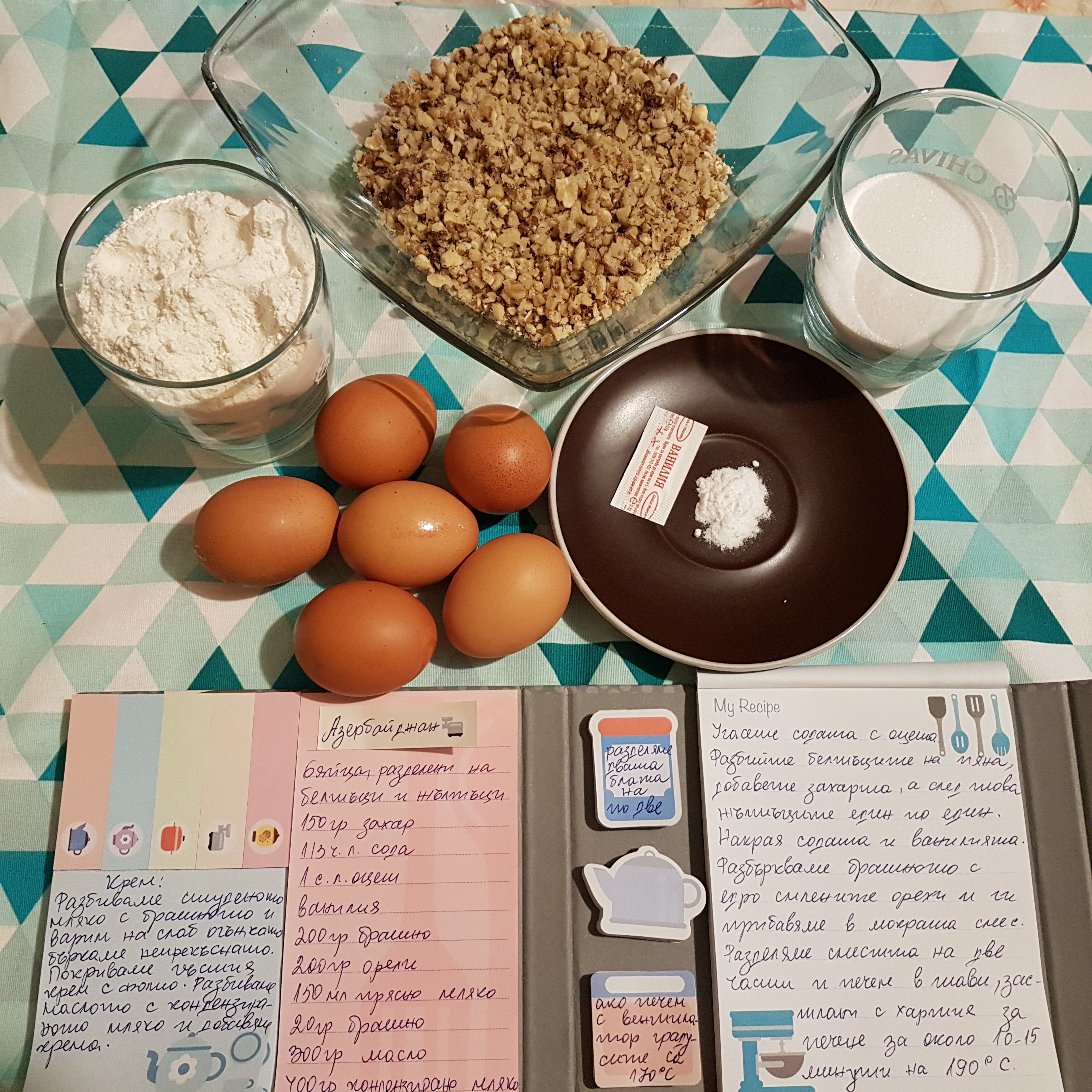 Extinguish the soda in the vinegar. We break down the proteins until they become stiff or when they stop running out of the mixer stirrers. Without interrupting stirring, we add sugar, egg yolks (one by one), vinegar and soda and vanilla solutions. Stir to homogeneity the mixture. Flour and walnuts are mixed and added 2-3 times to the dough. Mixing here is done with a wooden spoon or spatula without being too vigorous to get all the air out of the mix. We divide the resulting dough into 2 parts. Each of them is baked in a 26 cm diameter pan which is covered with baking paper and the walls are greased with oil or butter. Bake in a preheated 190 ° C (170 ° C fan) oven for about 10-15 minutes. The battered blazes remain bright in color. Let them cool completely.