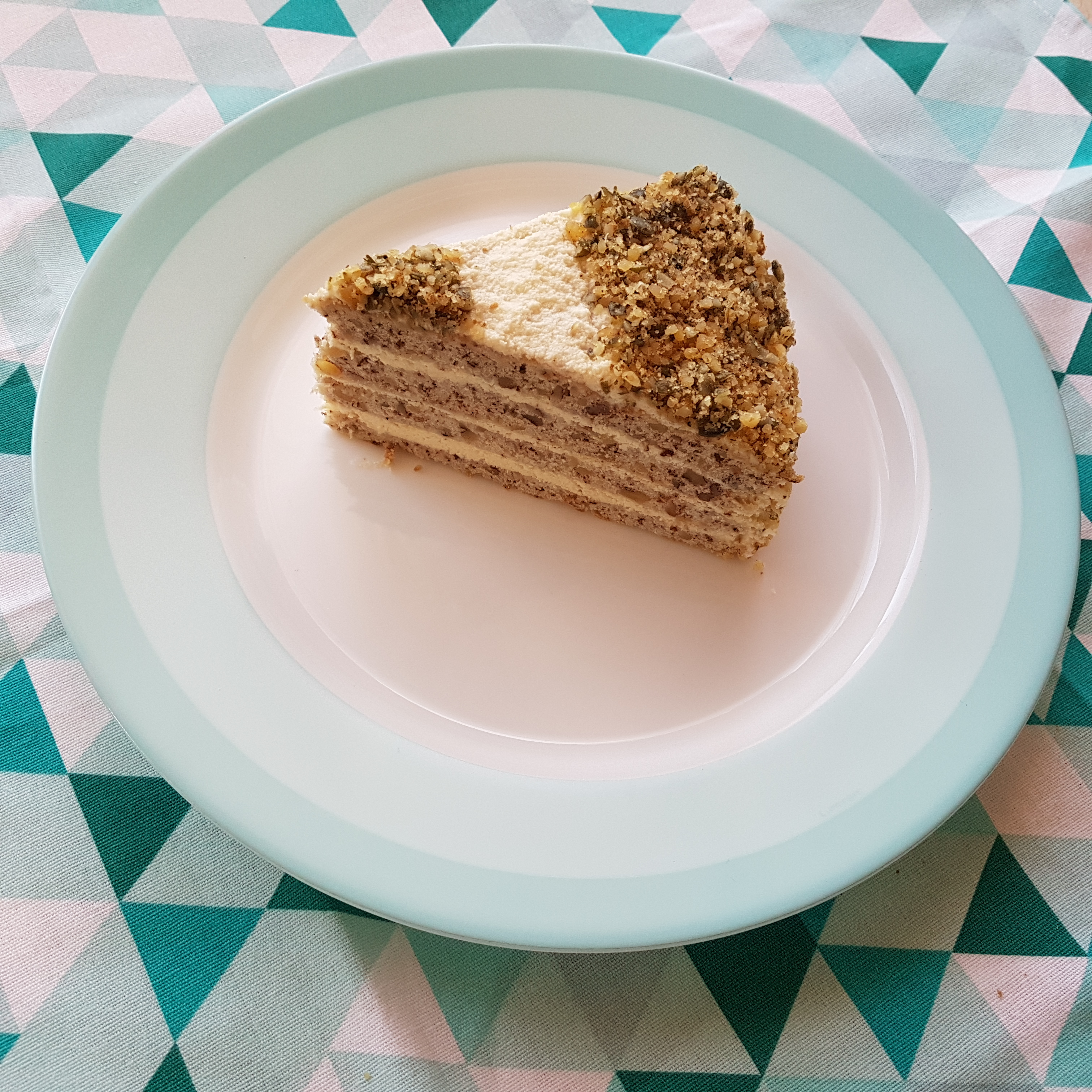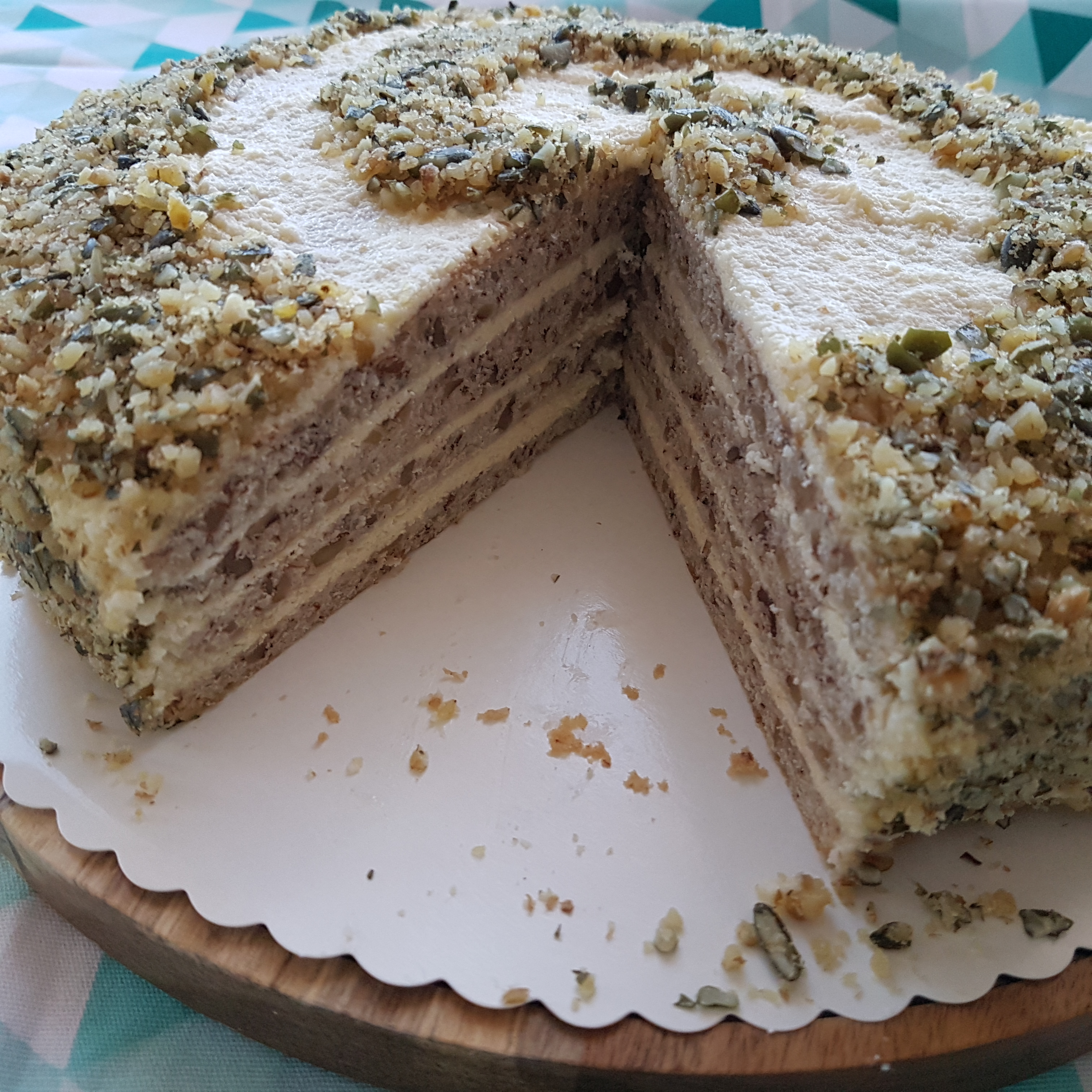Horizontally cut into 2 parts each of the baked, cooled ponds. Using a ring, we begin to rotate blade and cream until it is exhausted, but leave a little of the cream on a cake board. For decoration I used a mixture of walnuts and a few pumpkin seeds (as for color). Leave the cake in the refrigerator for several hours, and best for one night. The next day, we remove the ring and smear the walls of the cake with the rest of the cream. I added from the mixture of walnuts and pears, but you can have imagination and decorate whatever you like, like chocolate. I wanted to dominate the walnut taste and bet on a simple decoration.