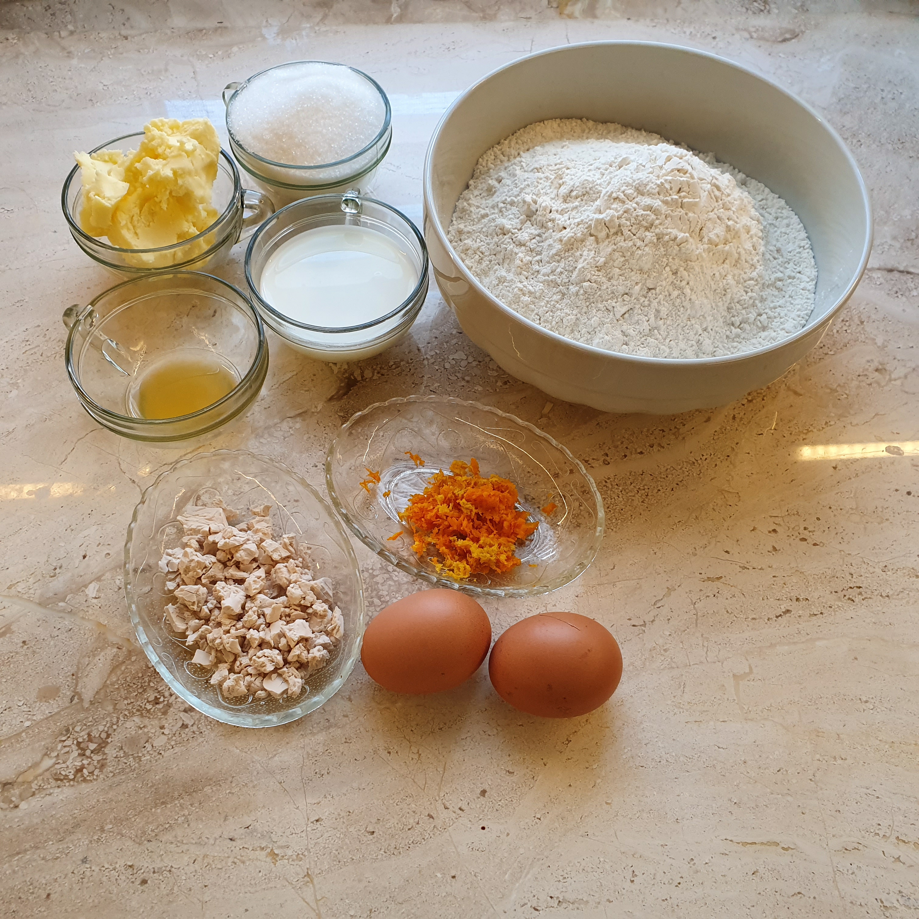 Warm the milk so that by dipping finger into it is warm but not hot and add the yeast in it to dissolve. Blend into the blender lemon and orange peels and sugar. Beat the eggs that are at room temperature together with the sugar while doubling their volume. Add the milk and yeast, orange juice, butter, salt and flour and mix for at least 10 minutes the dough.