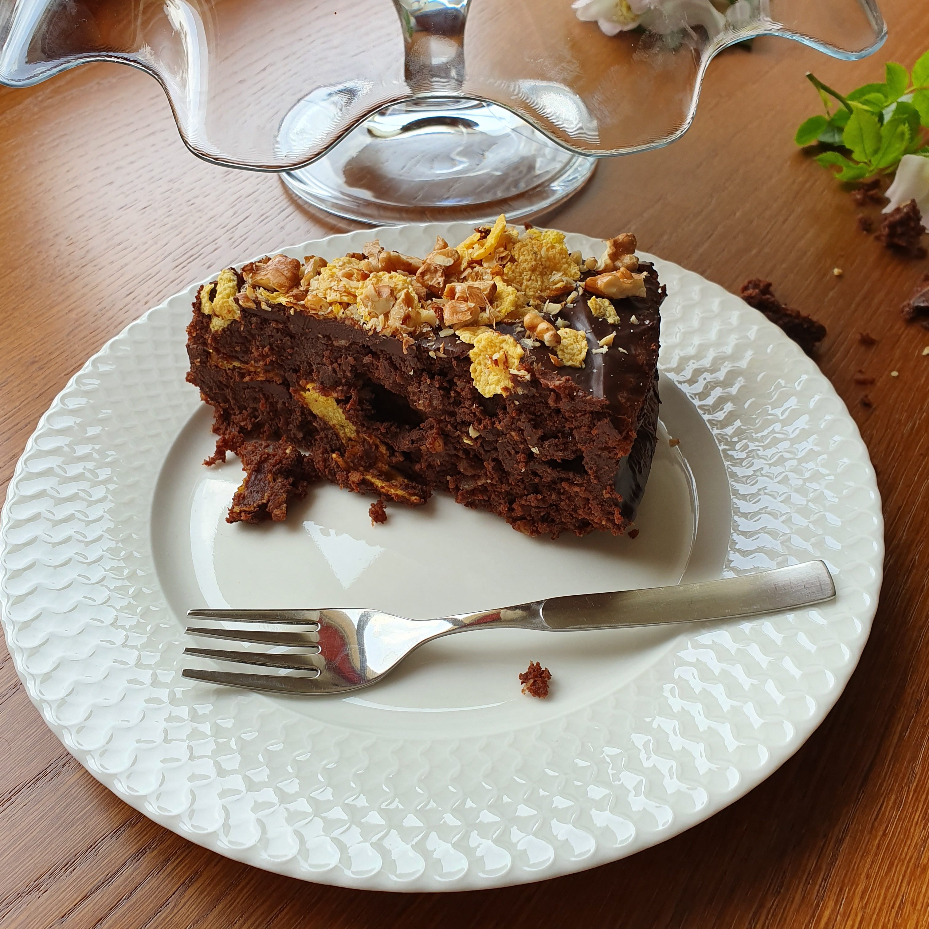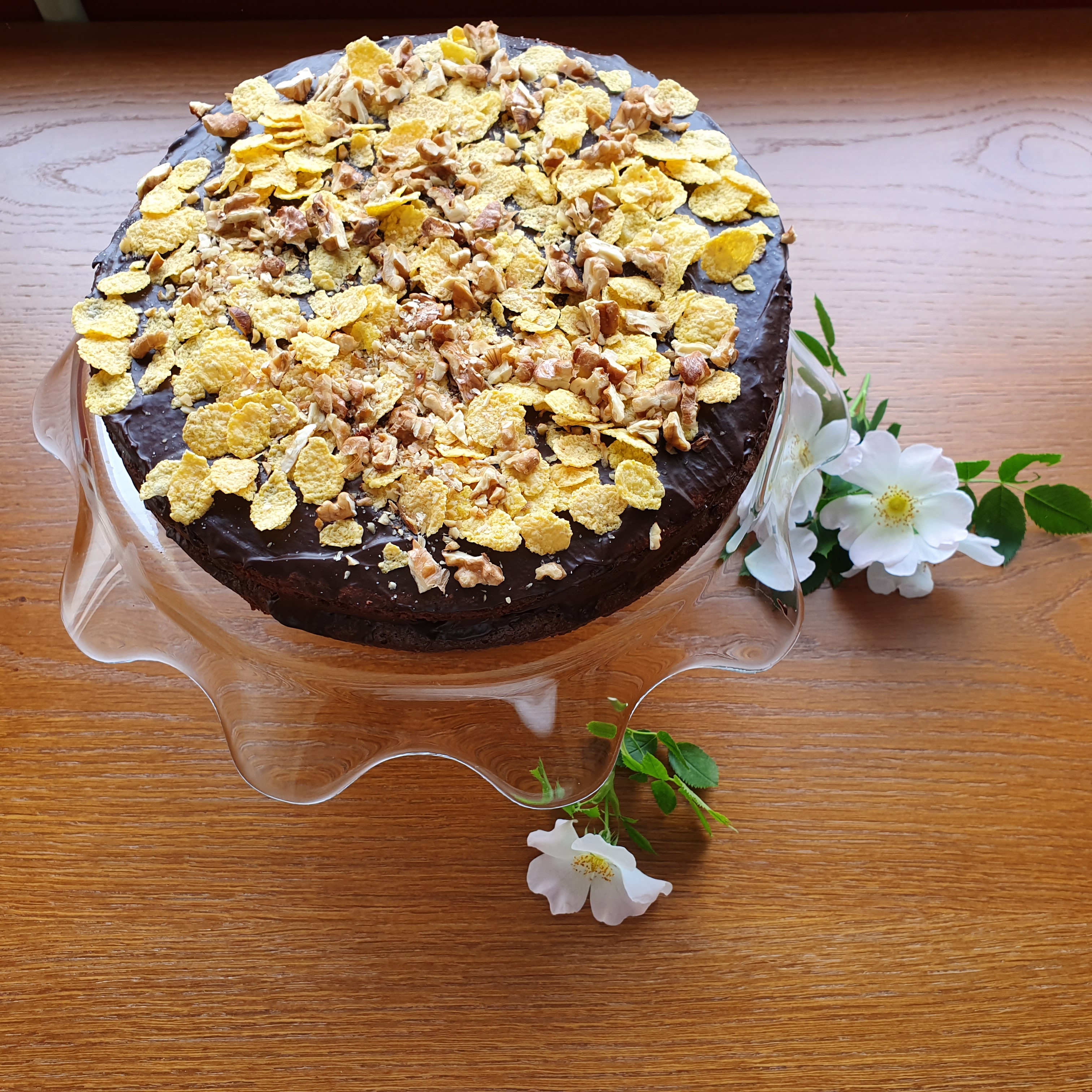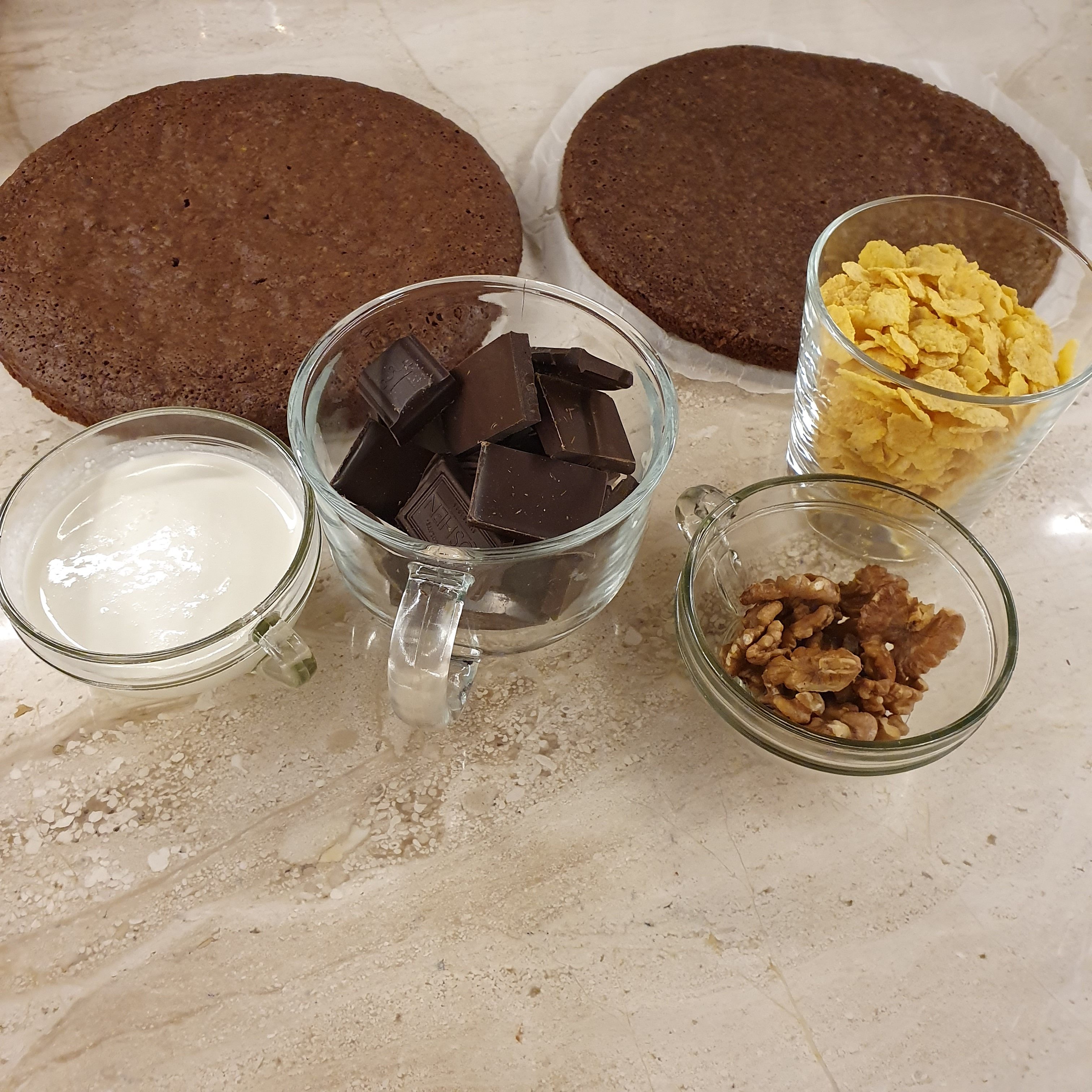 When it’s cooled, it’s time to assemble the cake. On first cake, pour half the ganash, and half of the corn flakes on it. Put the second cake, and on it again, you also put ganash and cornflakes. Add roasted walnuts and salt to flakes.