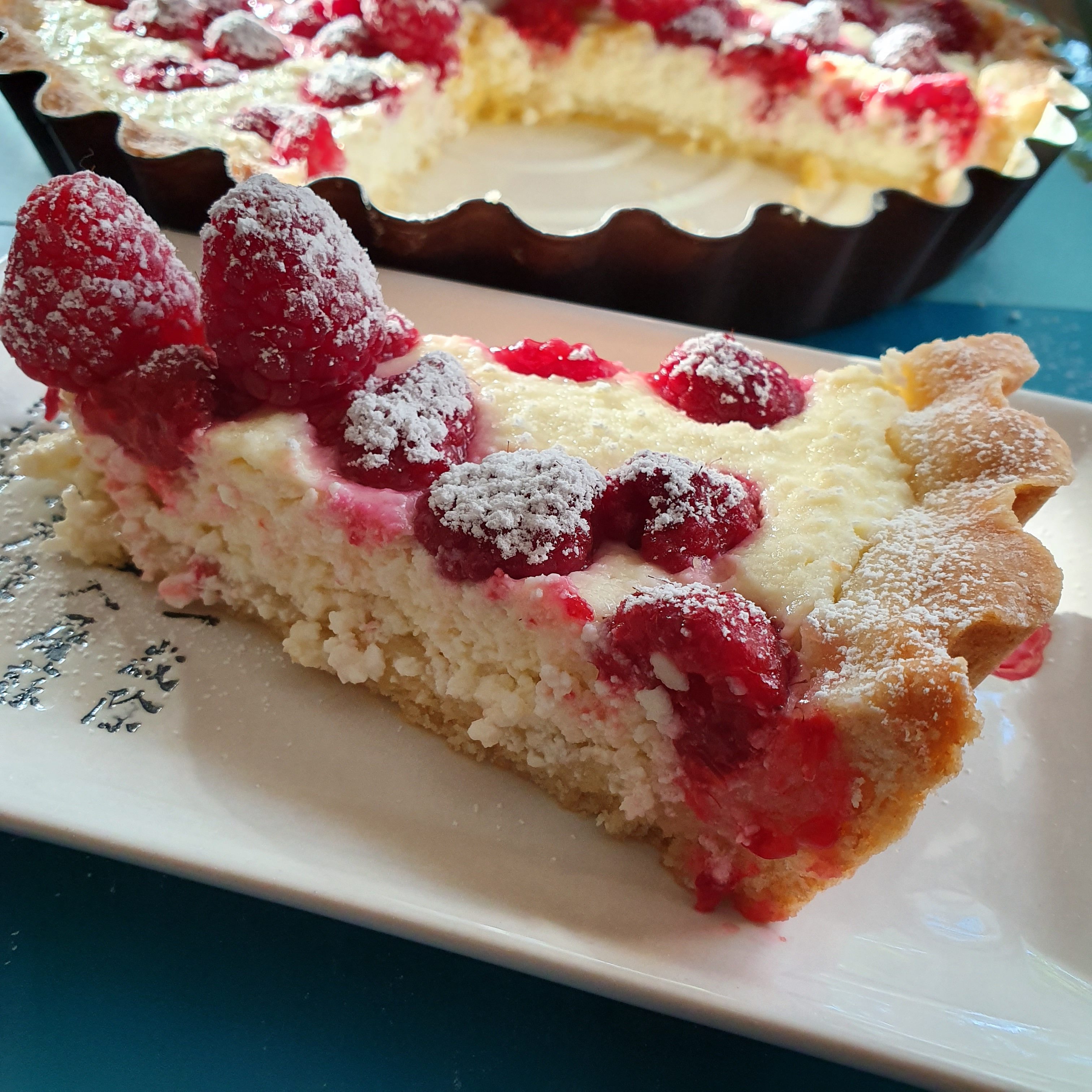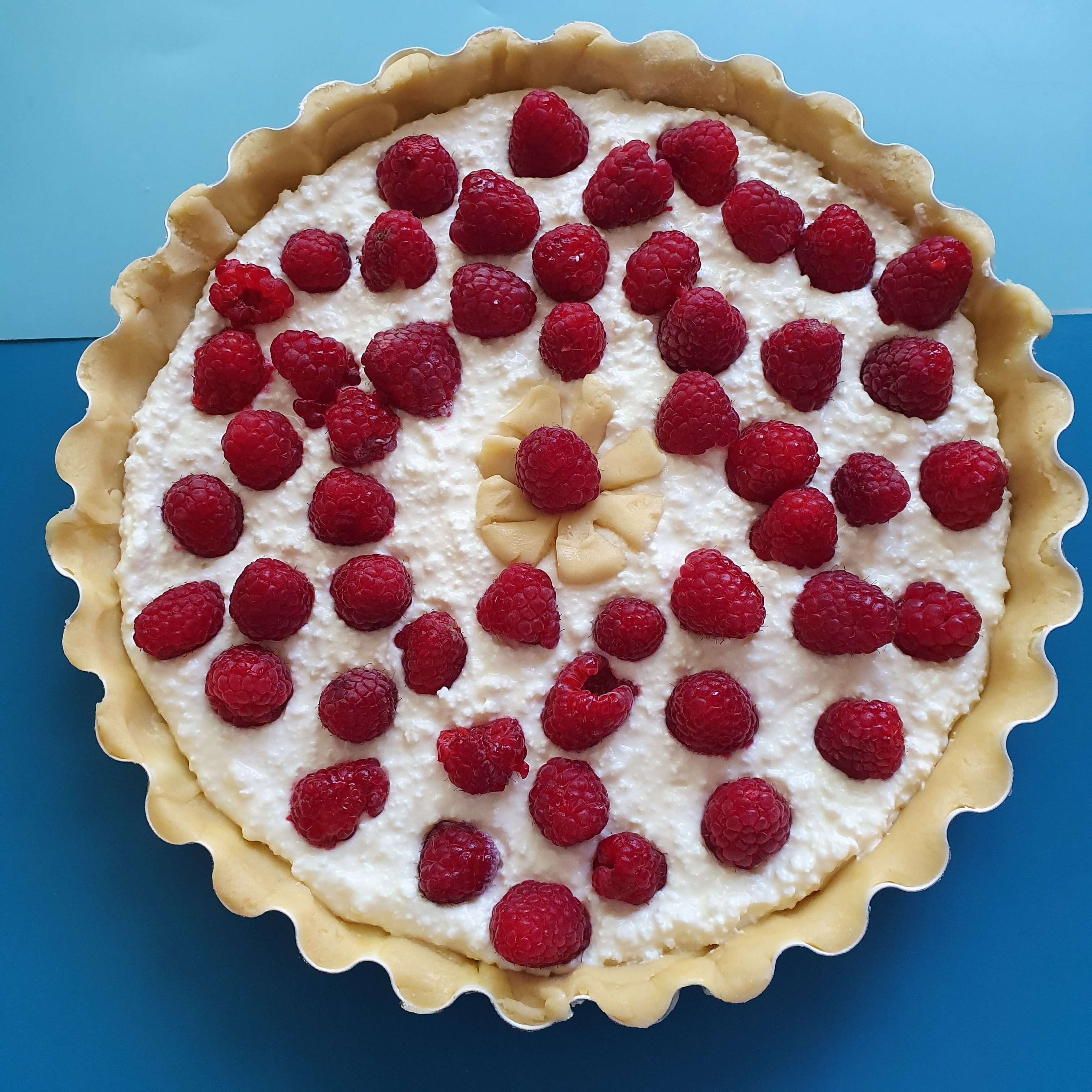 Flour is sieved with baking powder. Cut the butter into pieces with a knife and add it to the flour so that crumbs are obtained. Mix the egg with the sugar, add the flour with the butter and mix the dough. Leave it in the refrigerator for half an hour. The curd is crushed with a mixer. Mix the eggs, sugar, vanilla and cream and add to the cottage cheese. Put the dough in a greased dough pan, and the edges are formed on the walls. Place the stuffing on the dough, spread the raspberries on top.