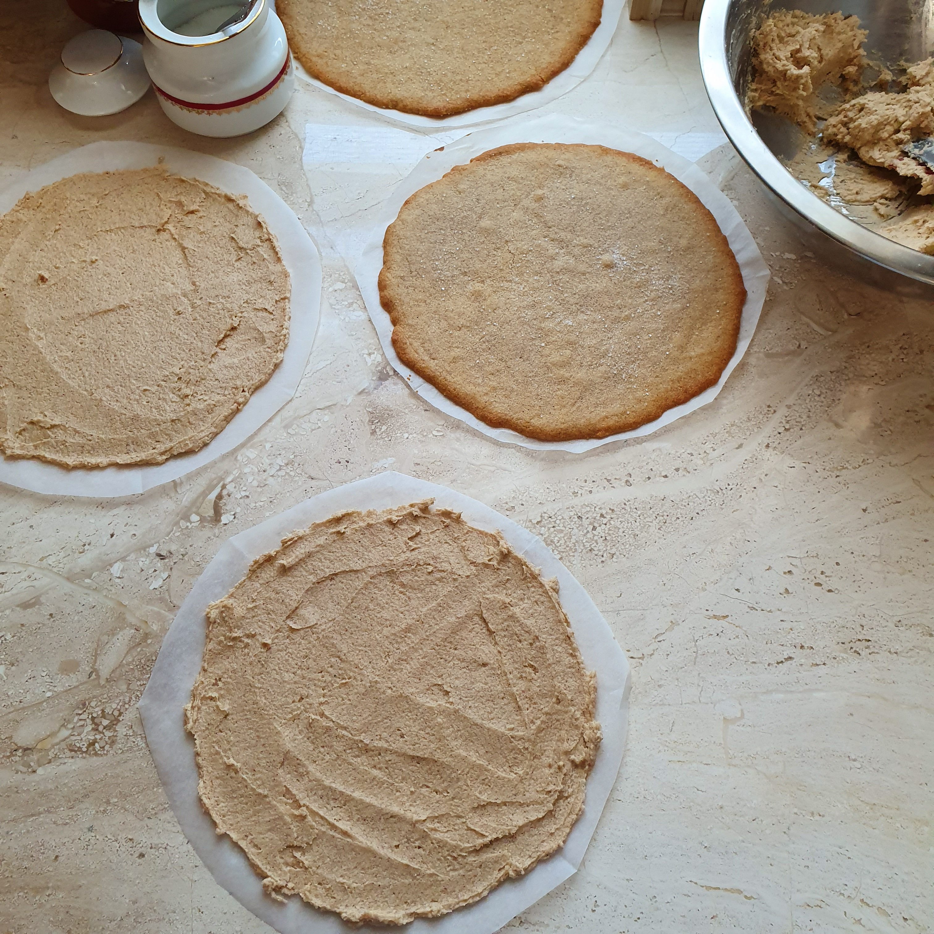 Beat the butter with sugar to fluffy cream. Add the eggs sequentially and stir until homogeneous. Sift the cinnamon with the flour and add it to the butter mixture. Stir until well mixed. Outline 10 circles 25 cm in diameter on baking paper. Using a spatula, shape the mixture into thin circles on the circles.