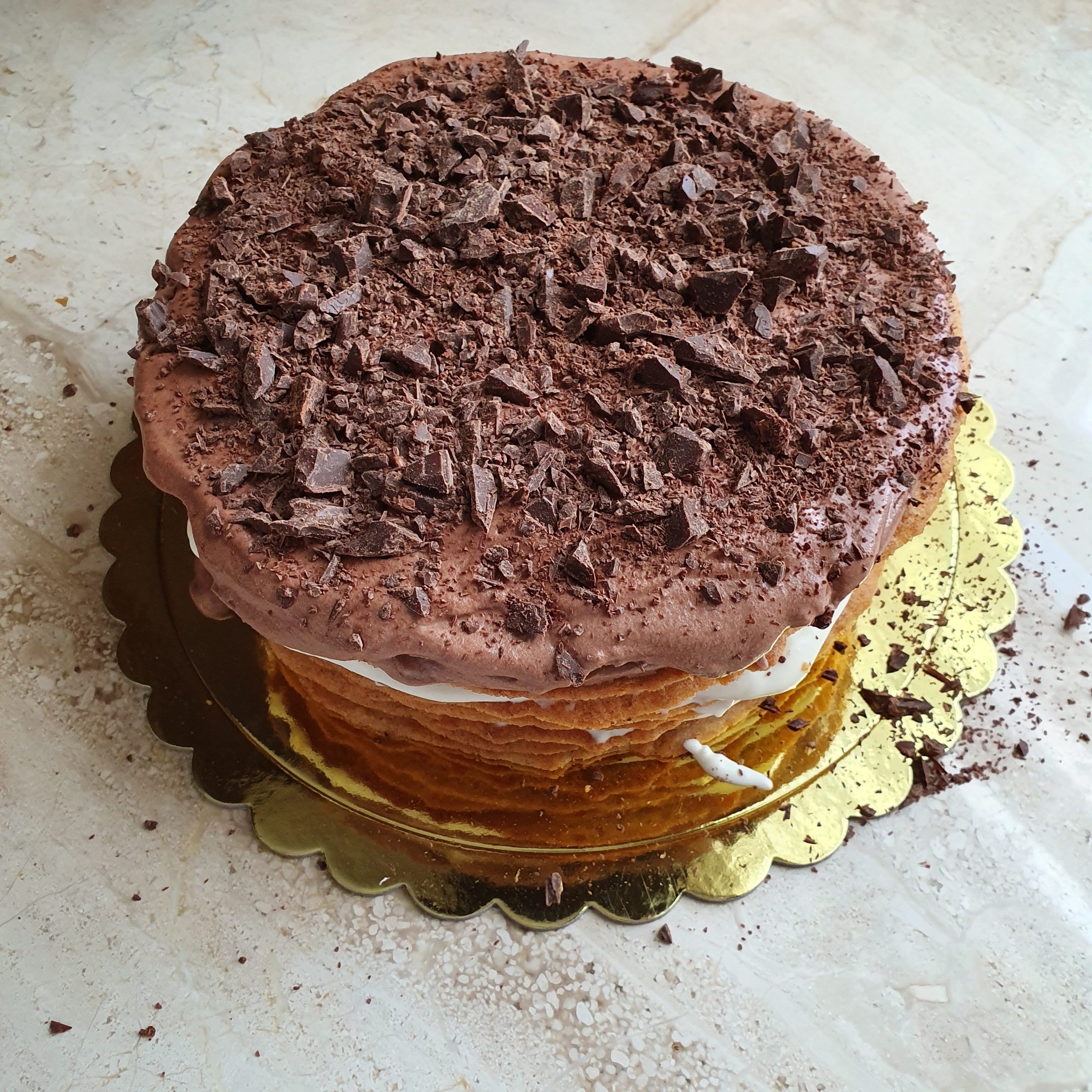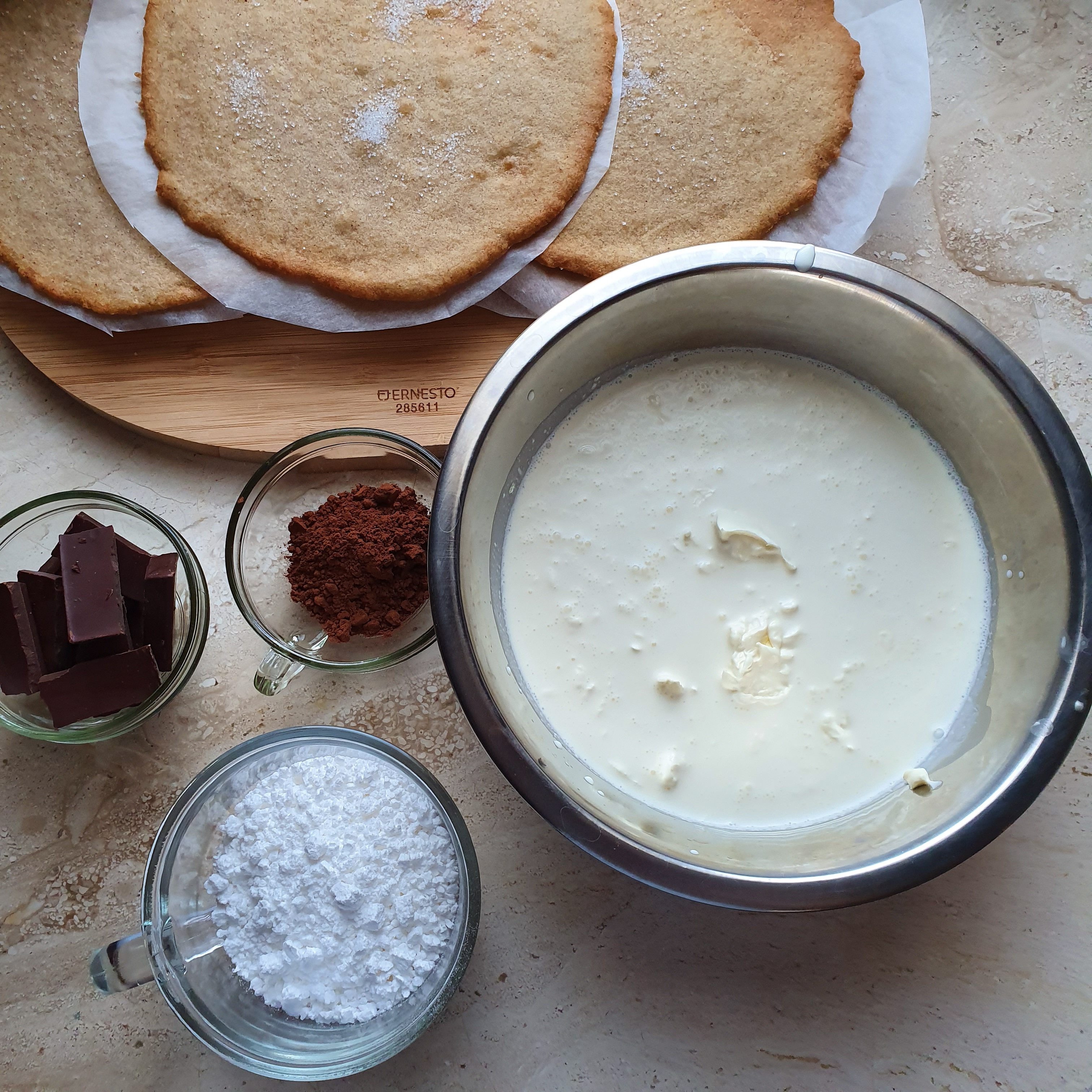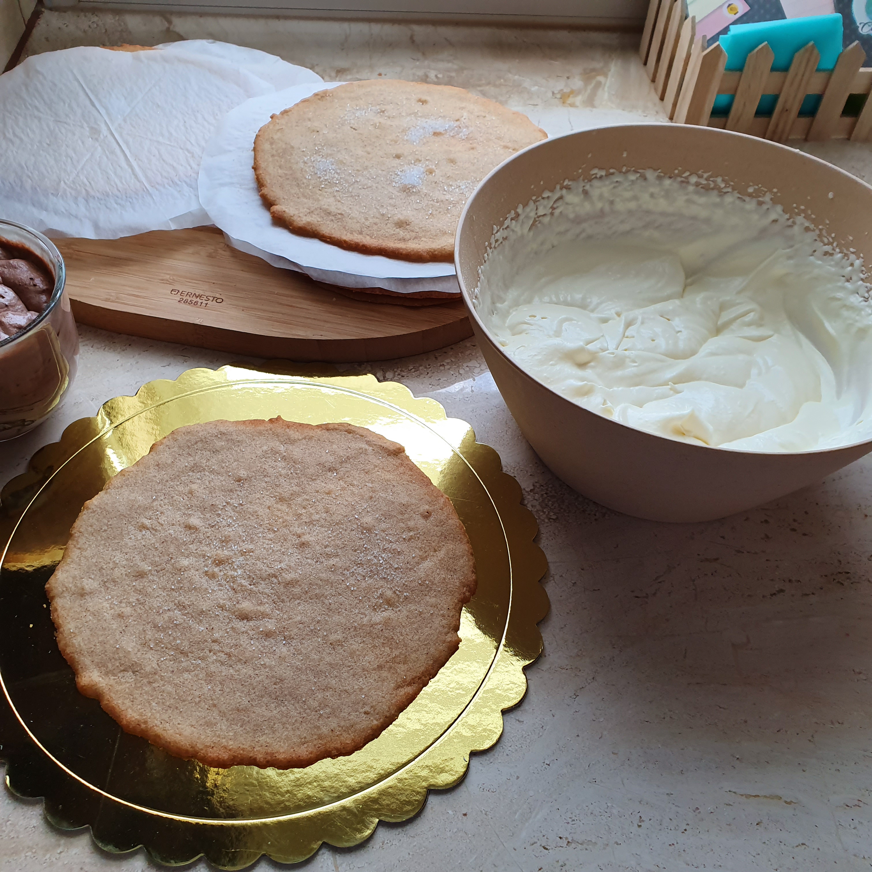 To assemble the cake, all the swamps must be cooled, because while they are warm they are very brittle. Beat cream to soft peaks with powdered sugar. Separate some of the mixture and mix with cocoa. Start assembling by alternating swamps and cream, and top with cocoa cream. Grind the chocolate on top and allow the cake in the fridge to soften and to toughen.