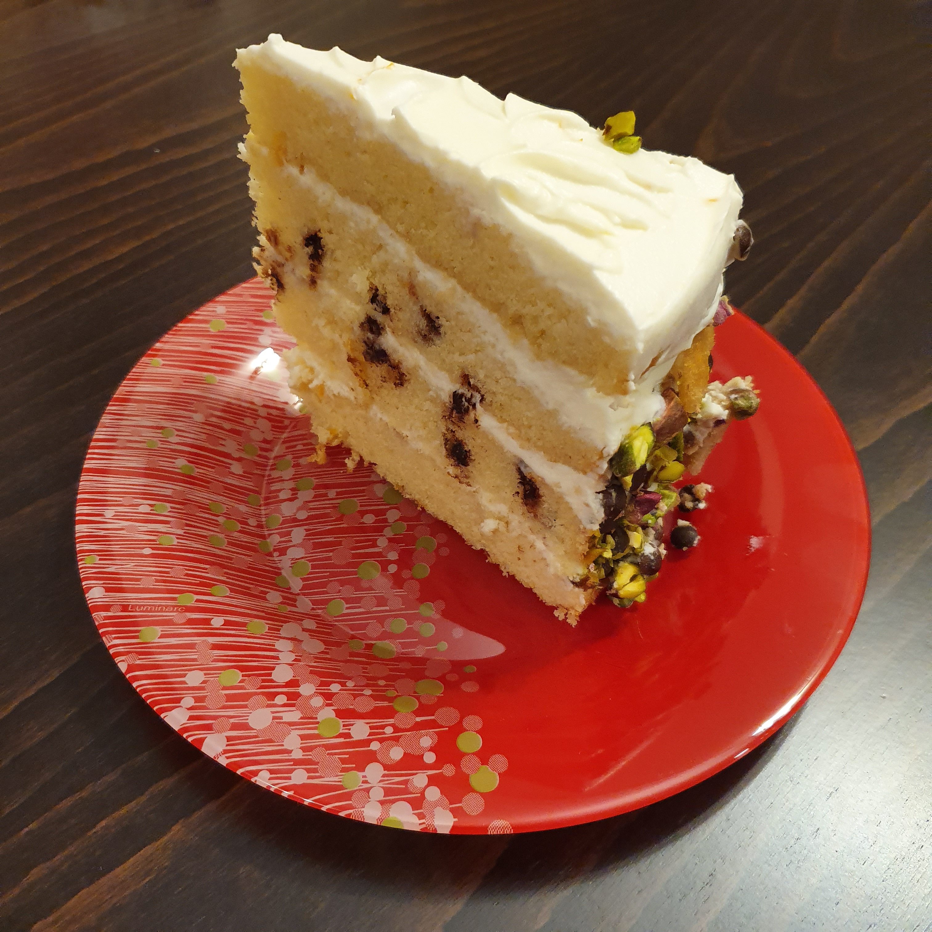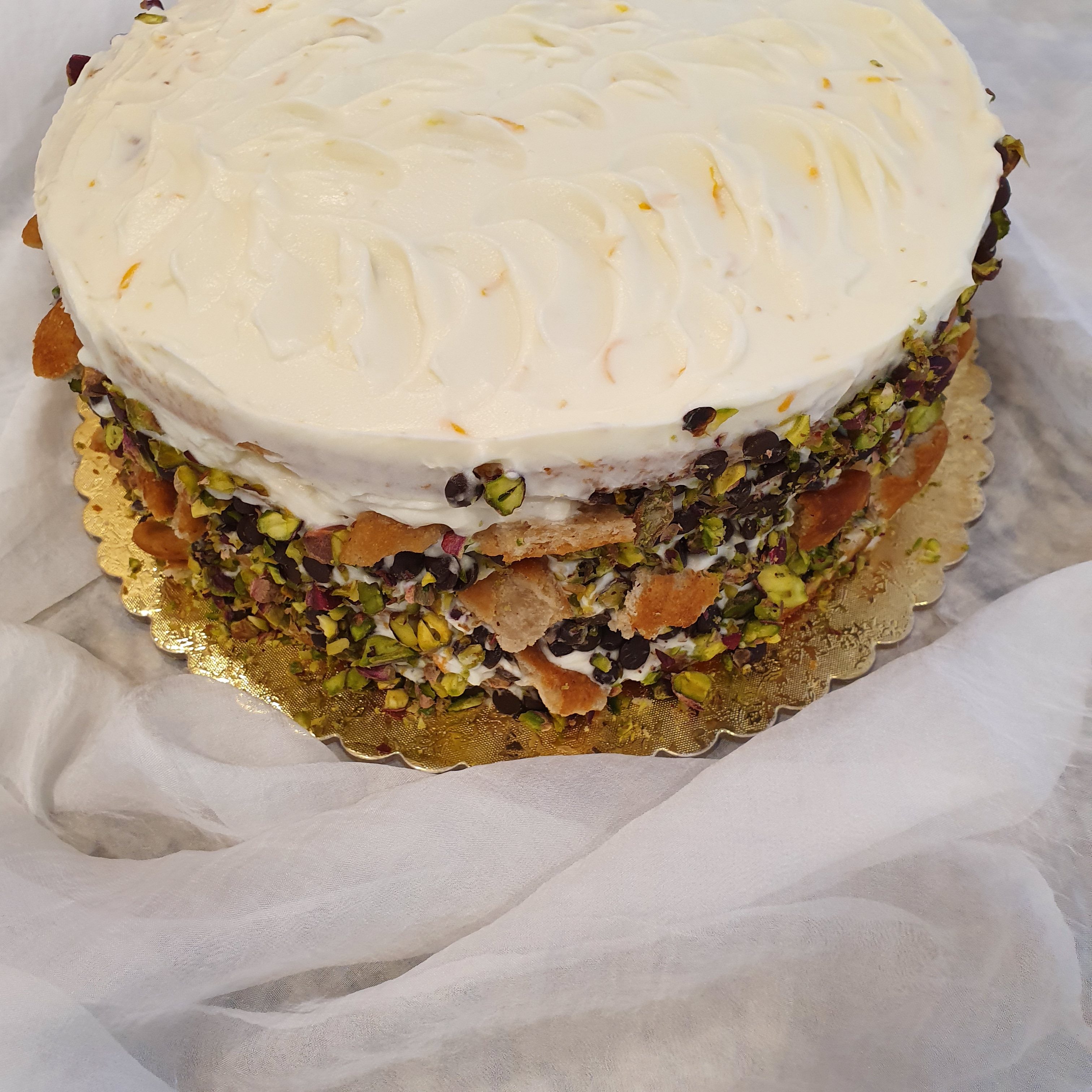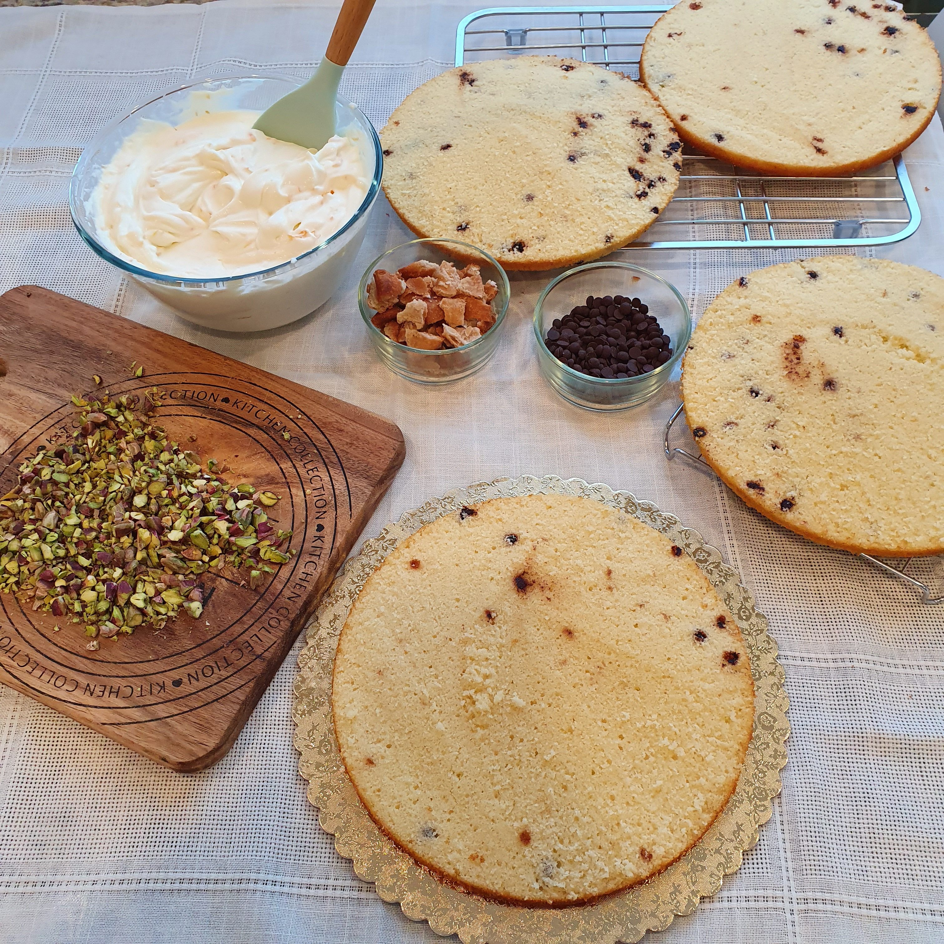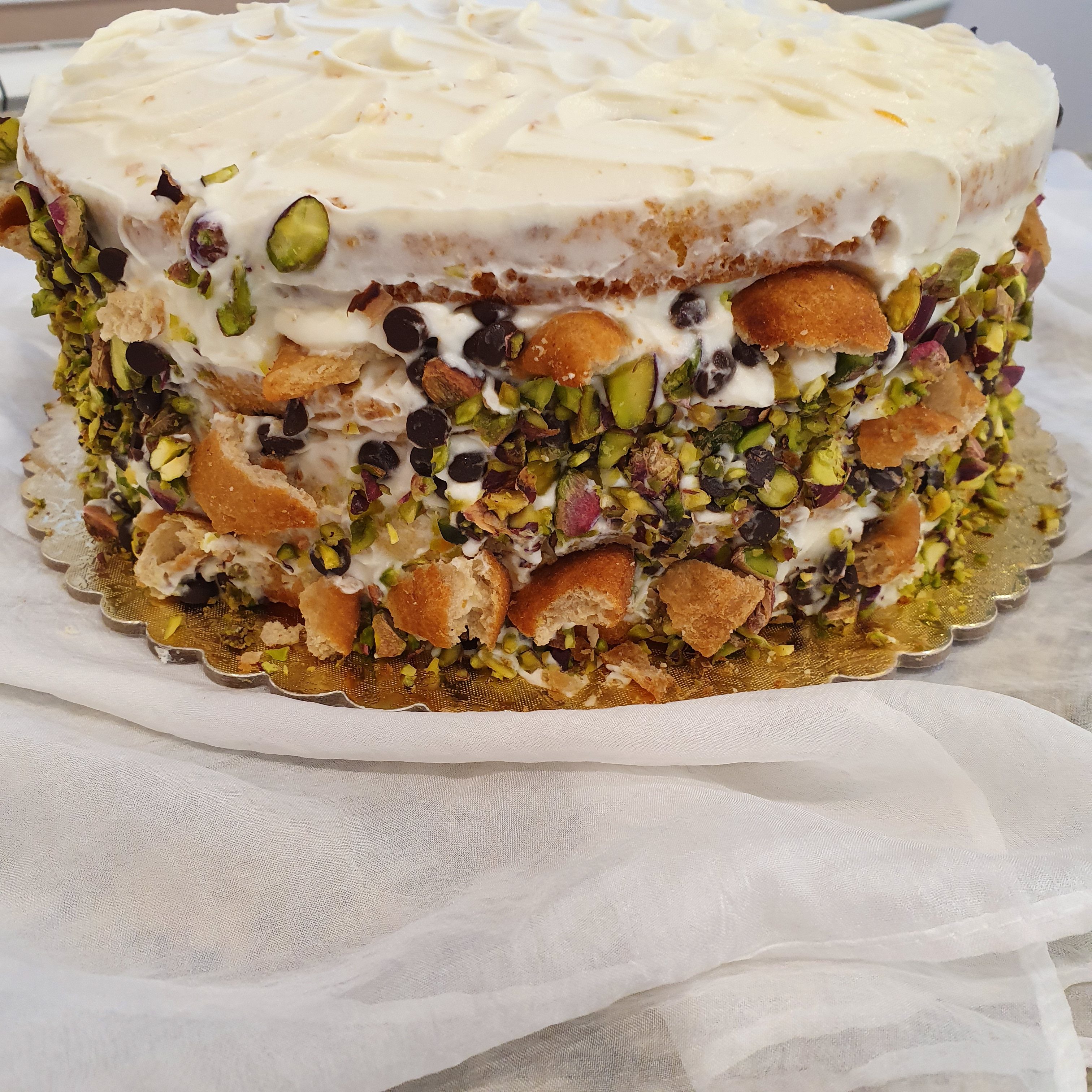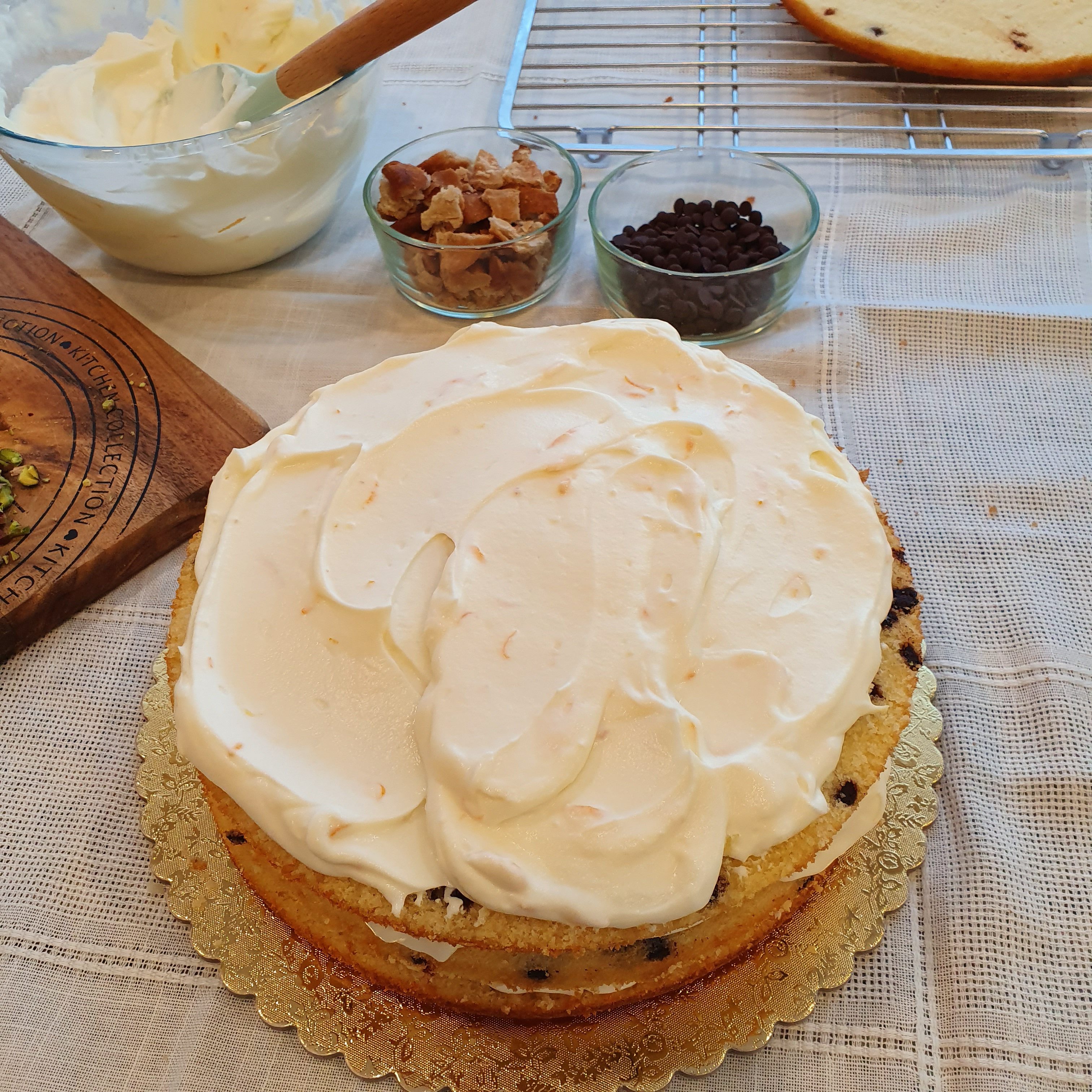 Cut the two cakes in halves lengthwise. Start assembling the cake by alternating cakes and cream. Finally, garnish with crushed pistachio, chocolate chips and broken cannoli on the board. Leave in the refrigerator for at least 2 hours before serving.