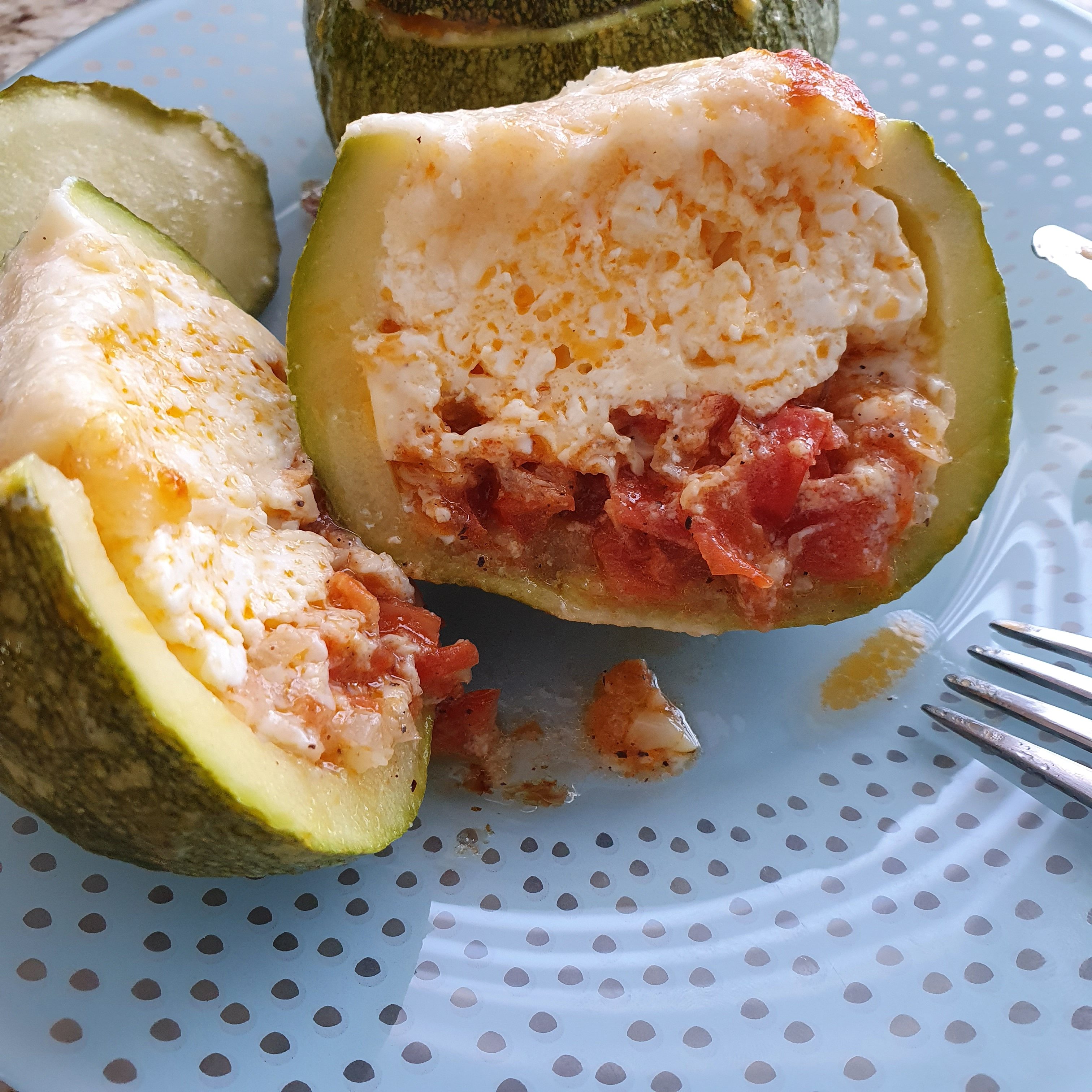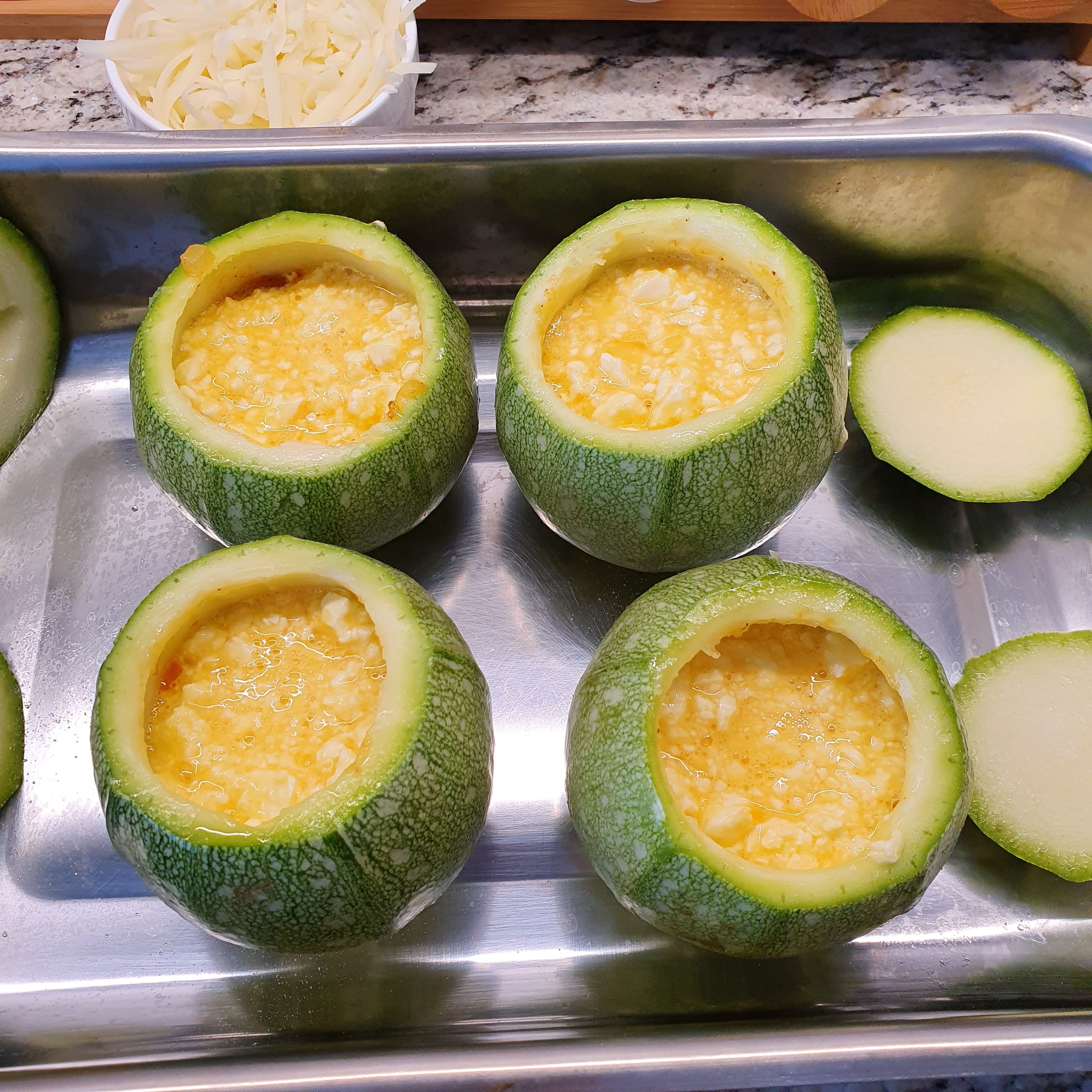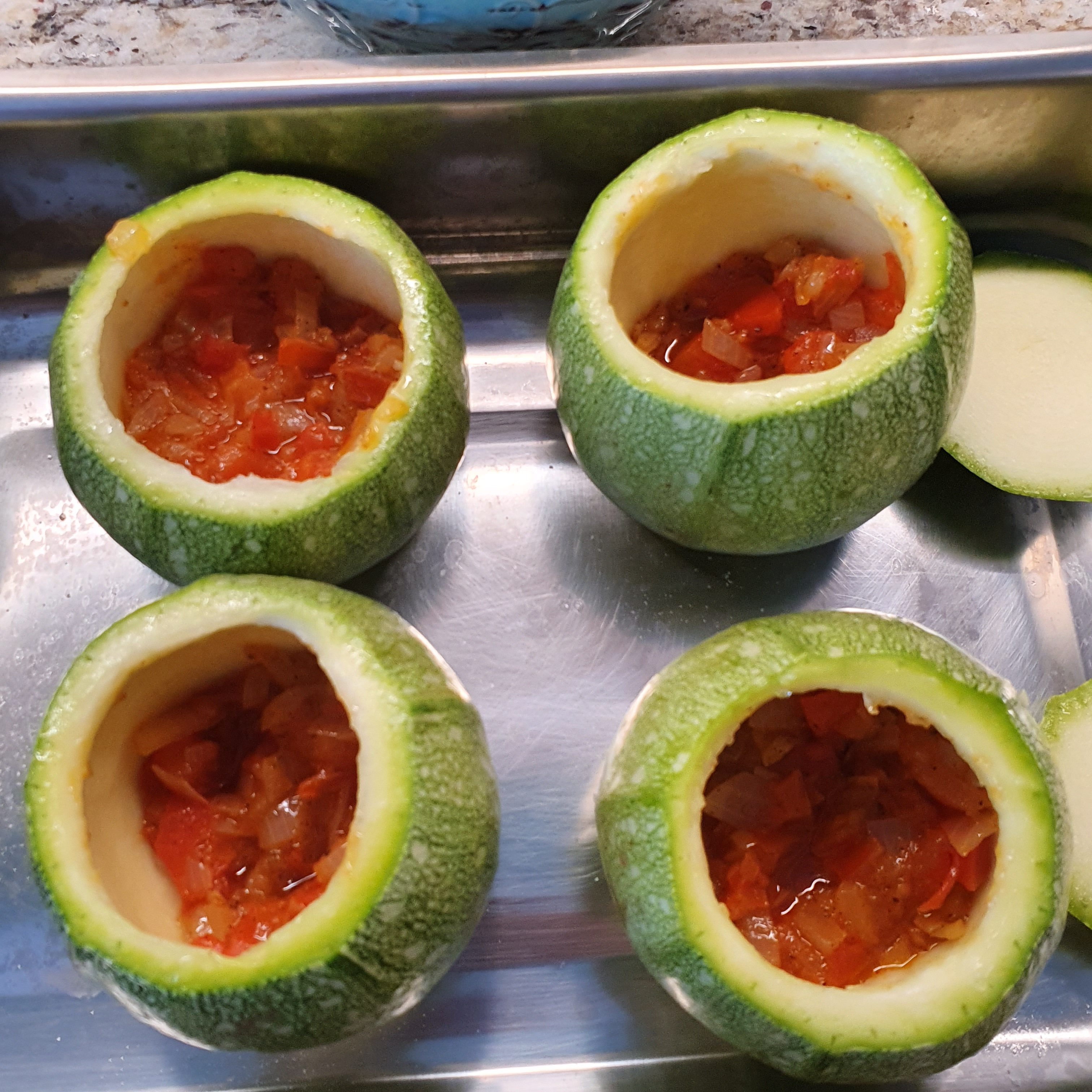Put the zucchini in a pan. In about 1/3 of the filling place put the mixture with tomatoes.