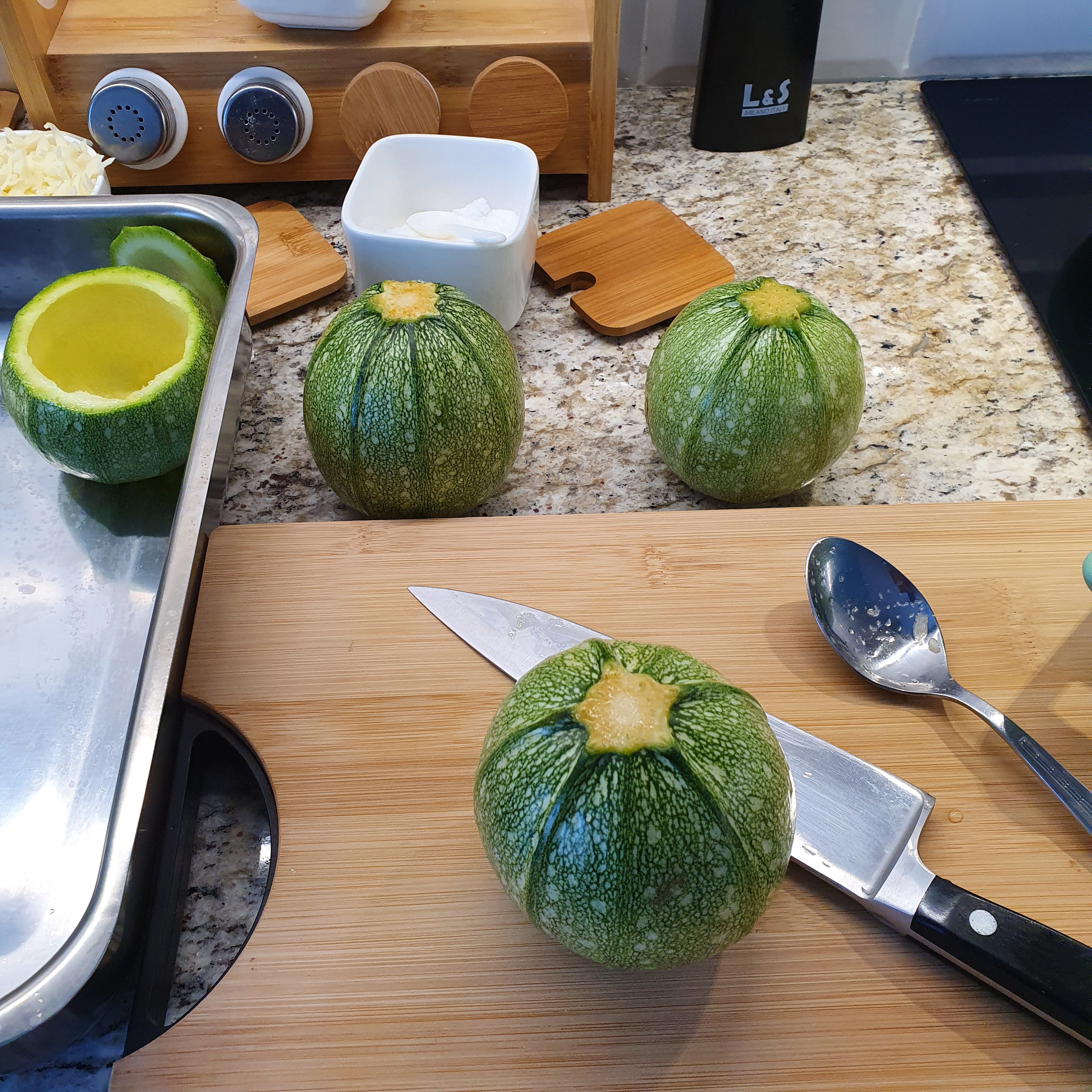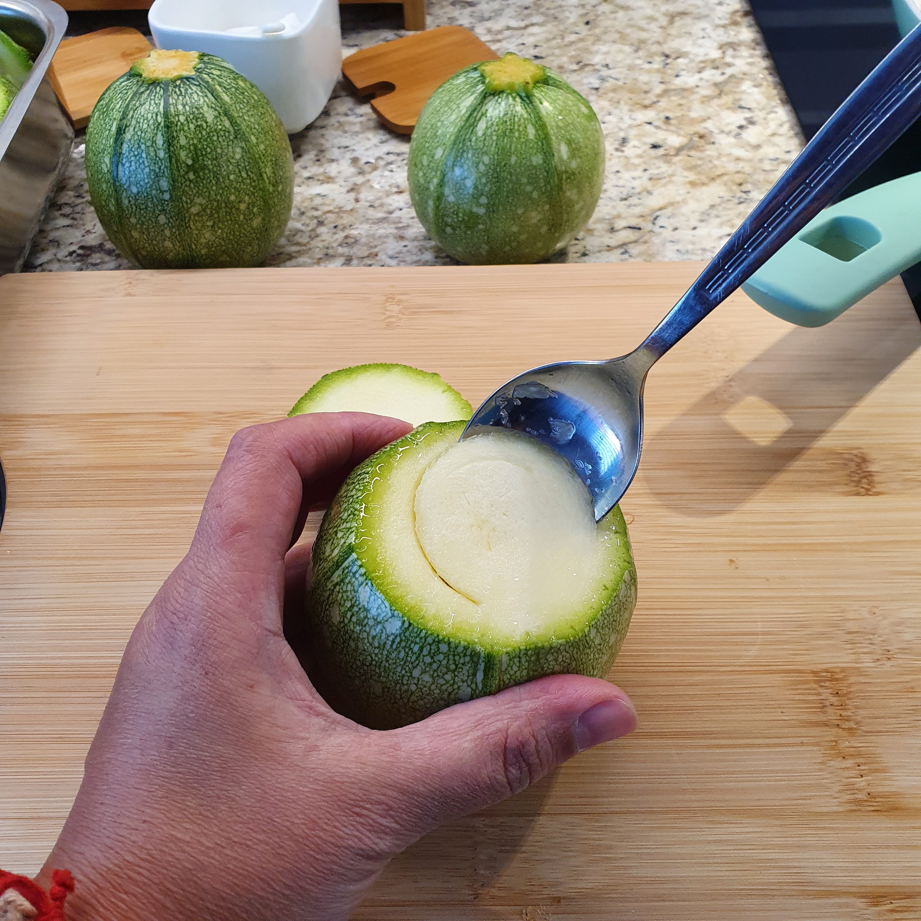 Wash the zucchini very well. If they are like mine, cut a lid around the handle and carve with a spoon. If you have ordinary zucchini, you have two options – to cut them in half and shape them like boats or to cut them into several pieces and form like stumps.