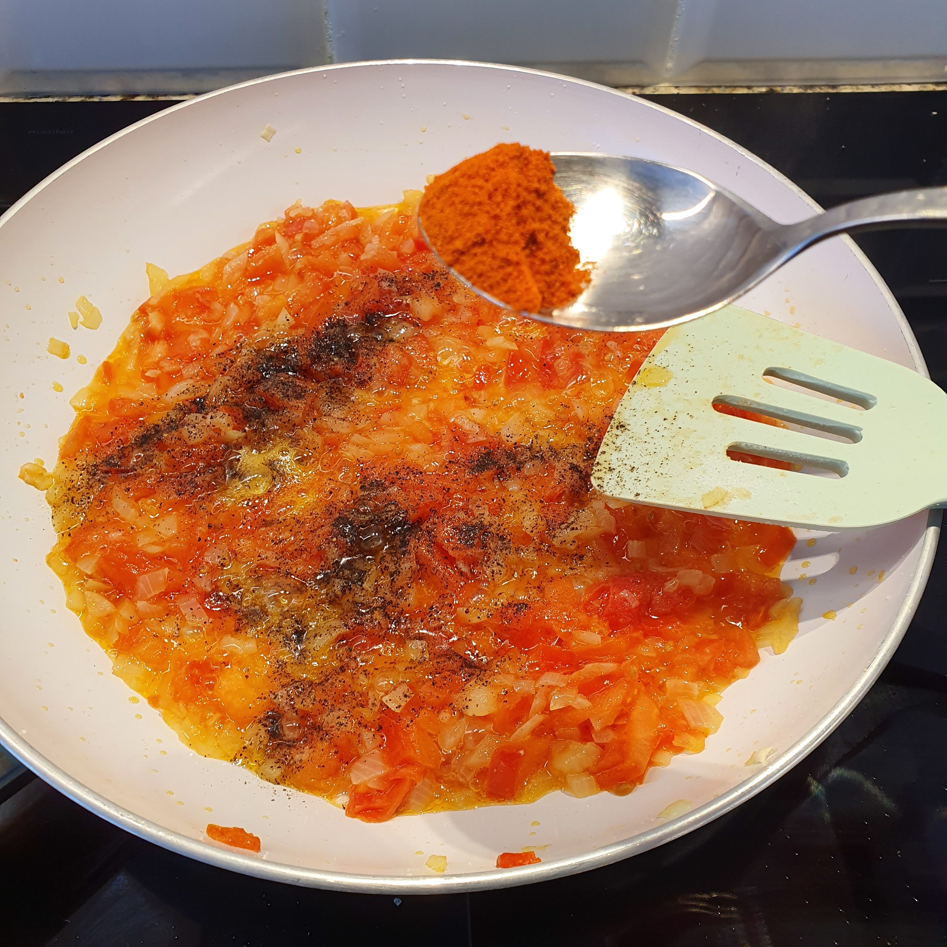 spices – I think I use a little chili and black pepper; oregano would go, but I don’t have it at the moment