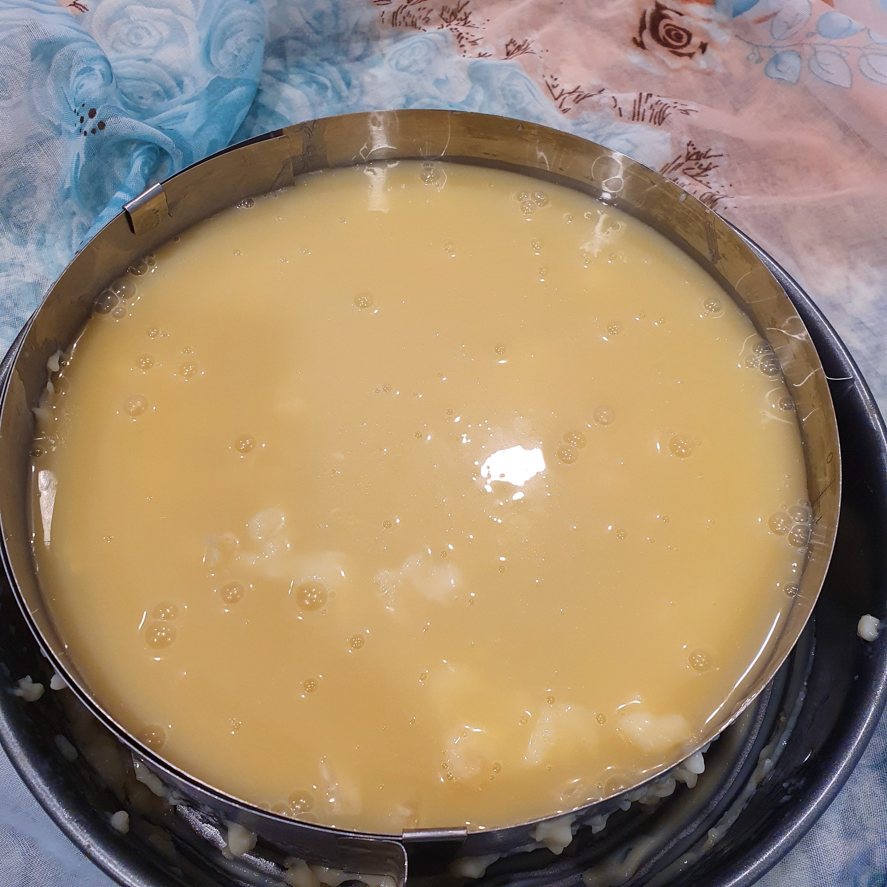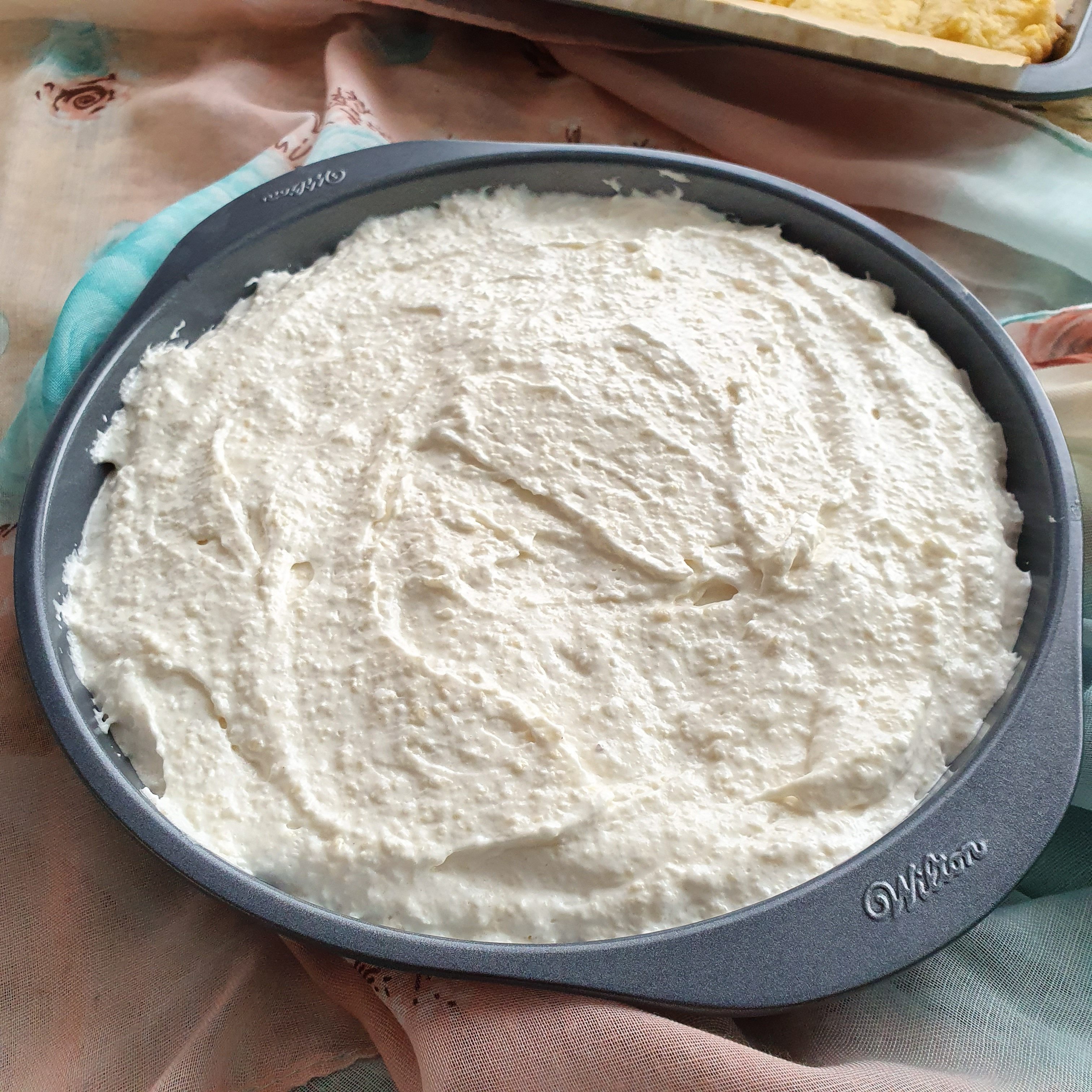 When the cream has cooled, take the cake out of the fridge and pour it on top. We return again to cool and tighten.