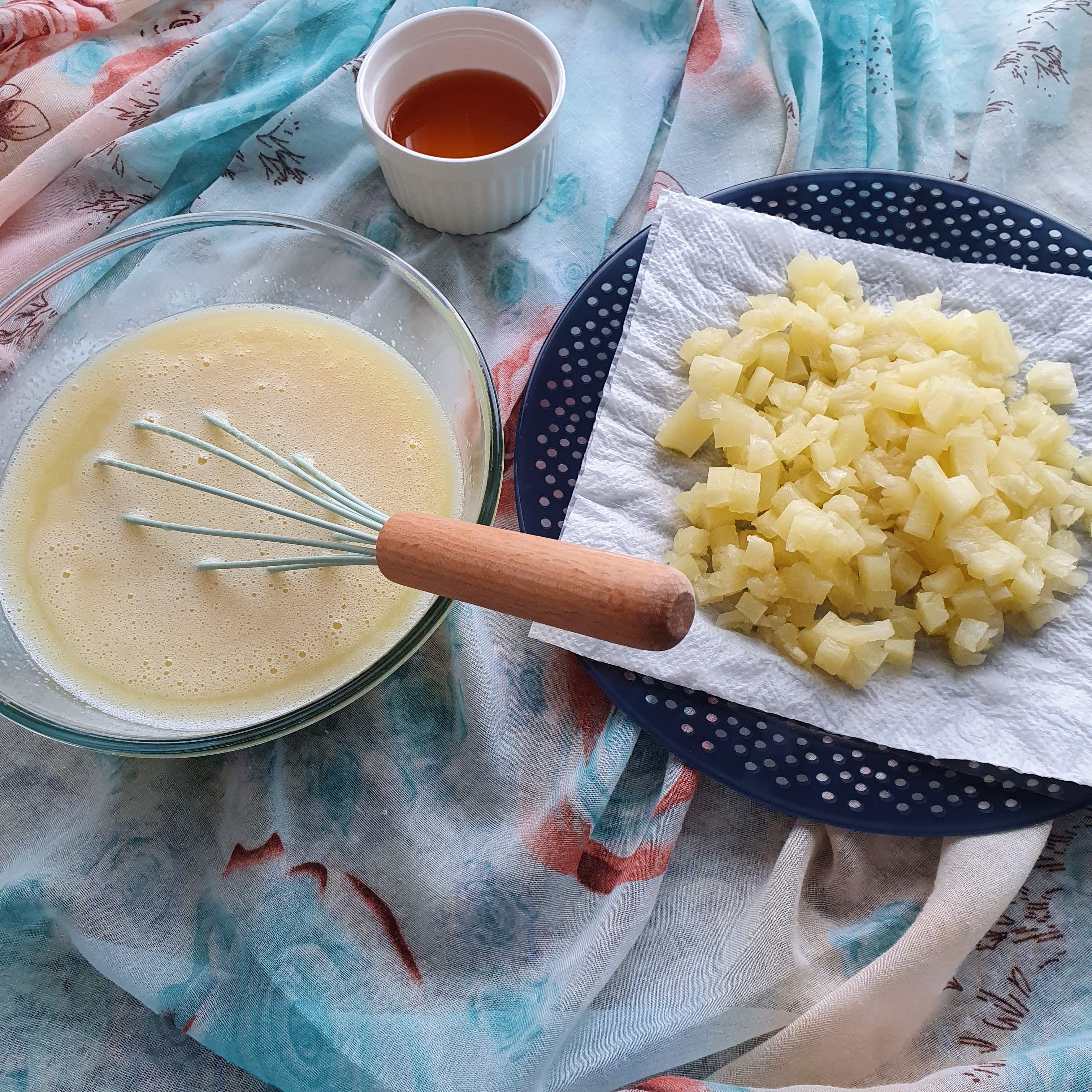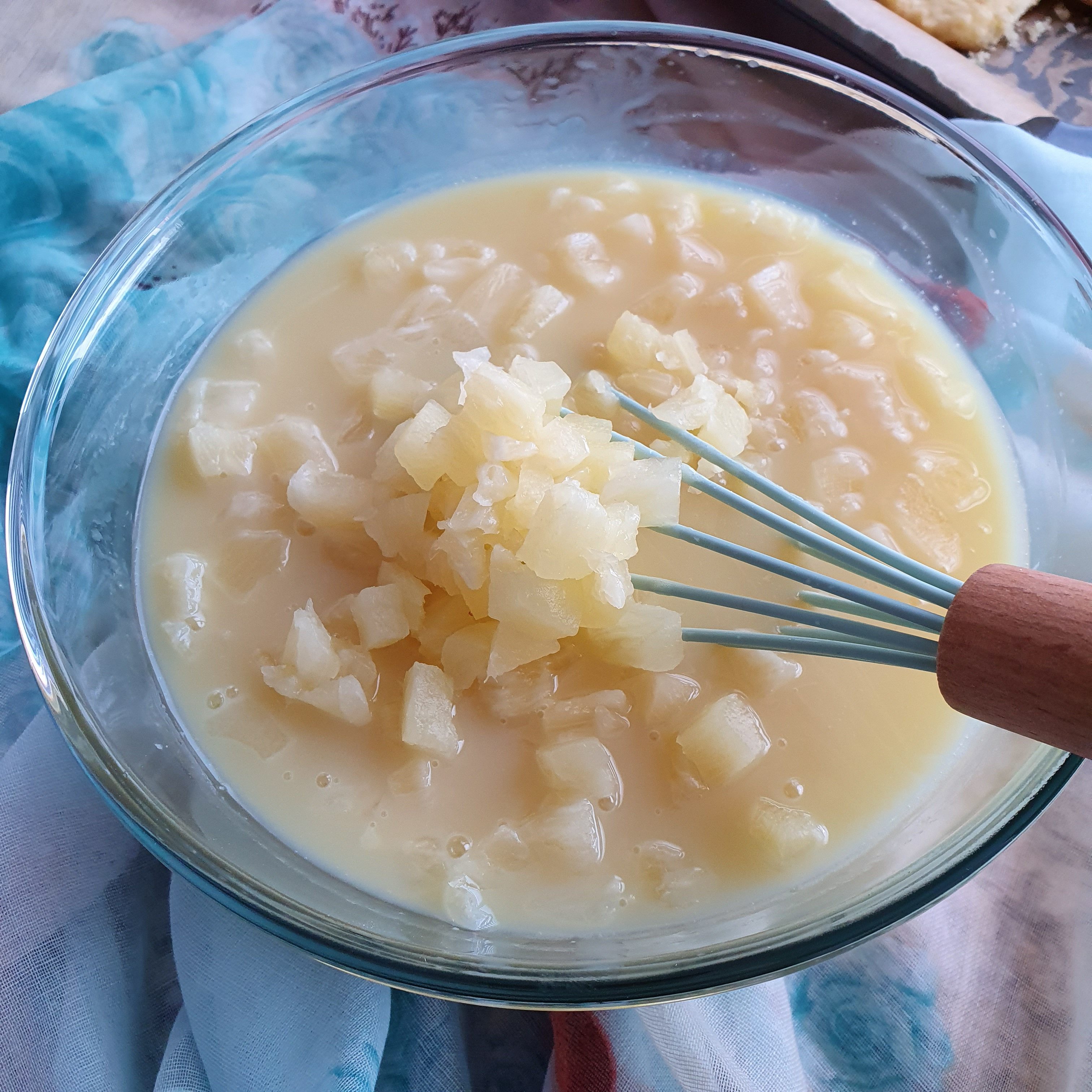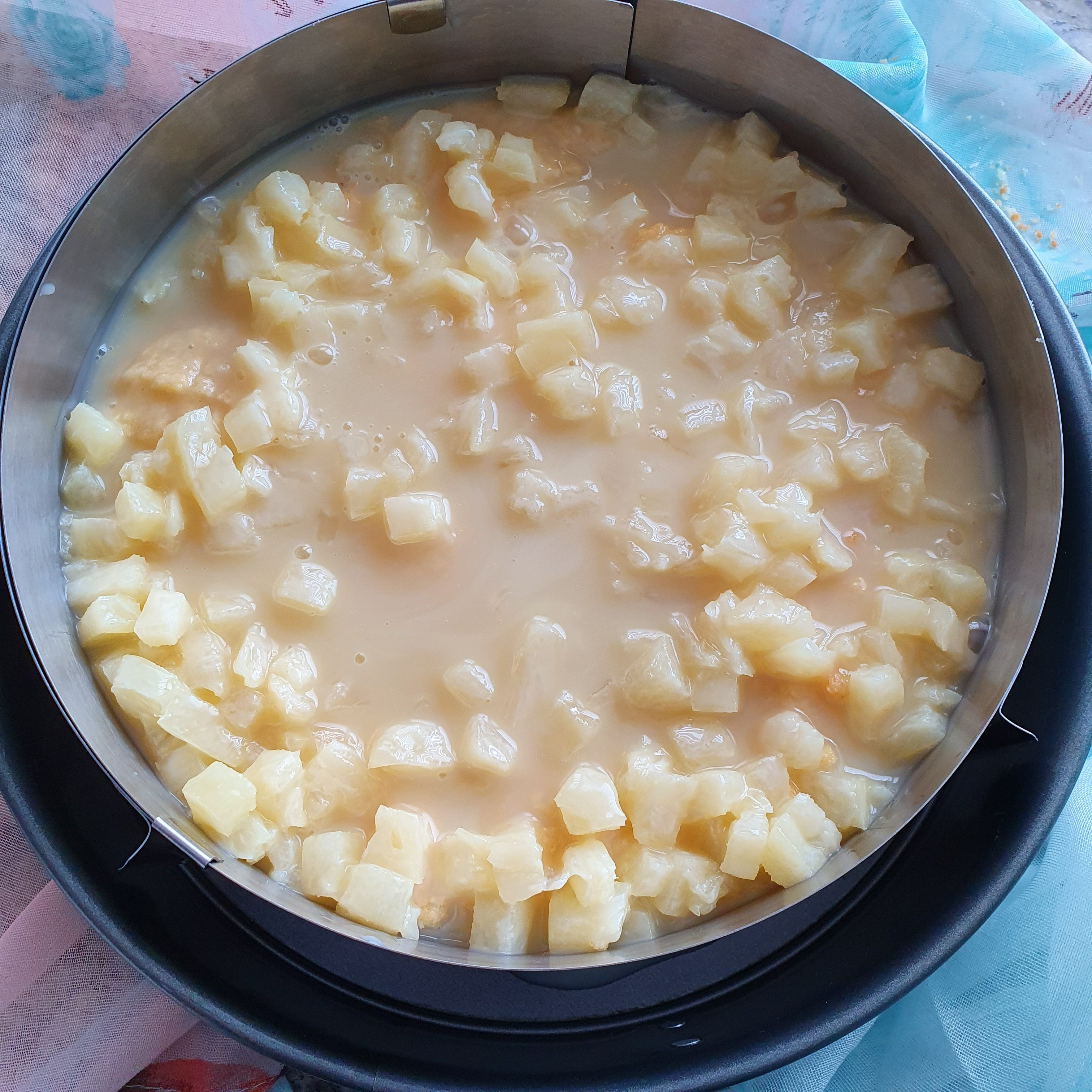 When the temperature of the panna cotta reaches 25 degrees, add diced pineapple, which we have left on kitchen paper to remove moisture.