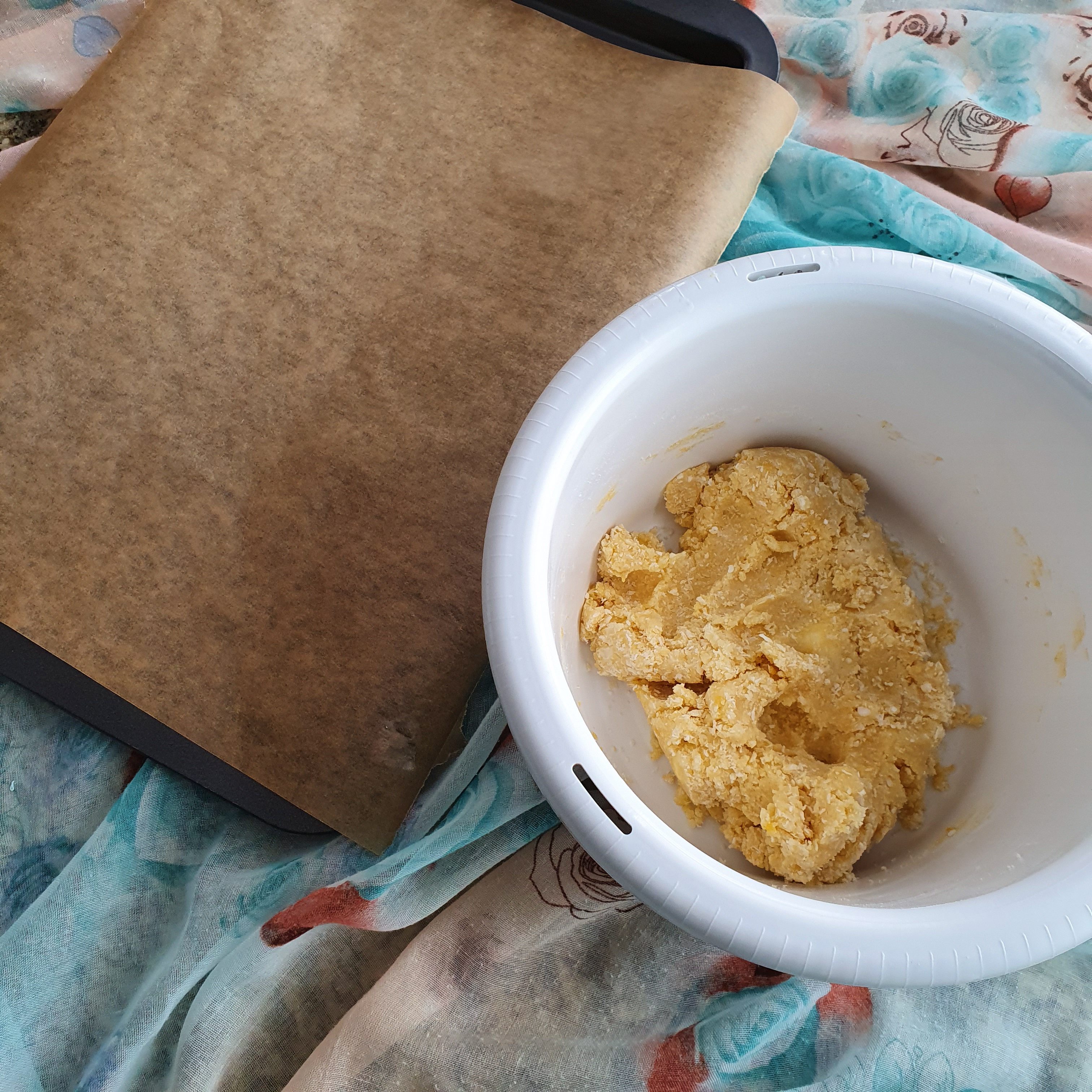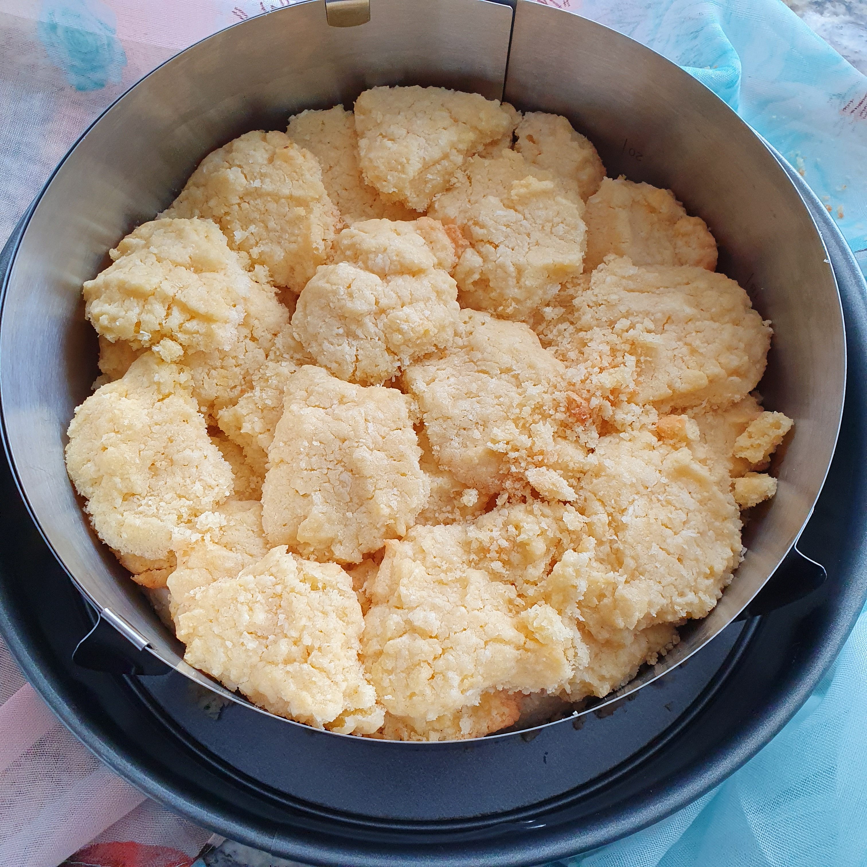 We start preparing the coconut butter crumbs separately. Beat the cold butter (cow’s and coconut) together with the dry ingredients with a mixer and finally add the yolks. Do not stir for a long time, because the butter will melt. Just enough to collect the dough. In a tray lined with baking paper, place balls of equal size with an irregular shape of the dough. Bake at 170 degrees for about 5 minutes.