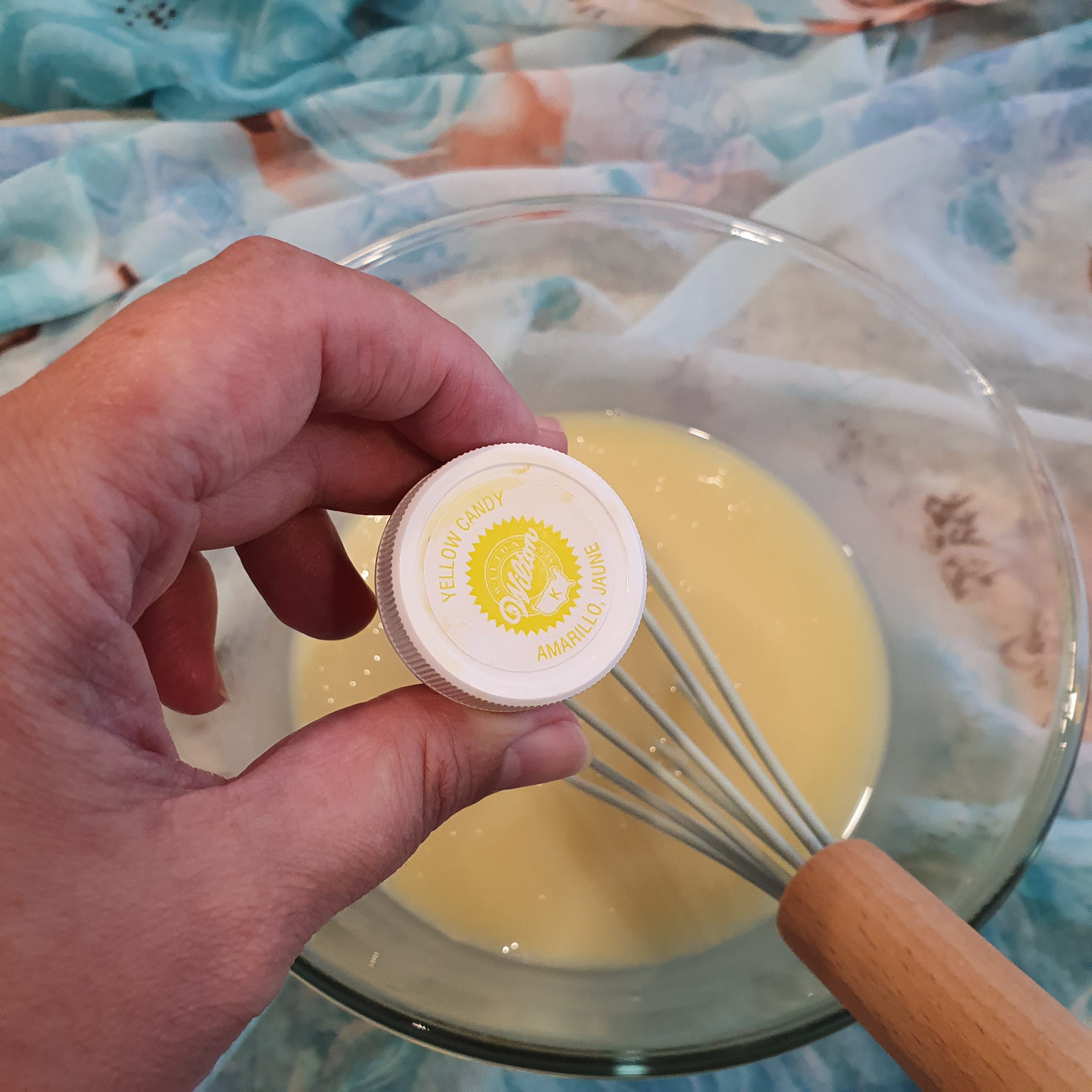 Add the confectionery paint and stir again. Allow to cool until the mixture reaches a temperature of 30 degrees.