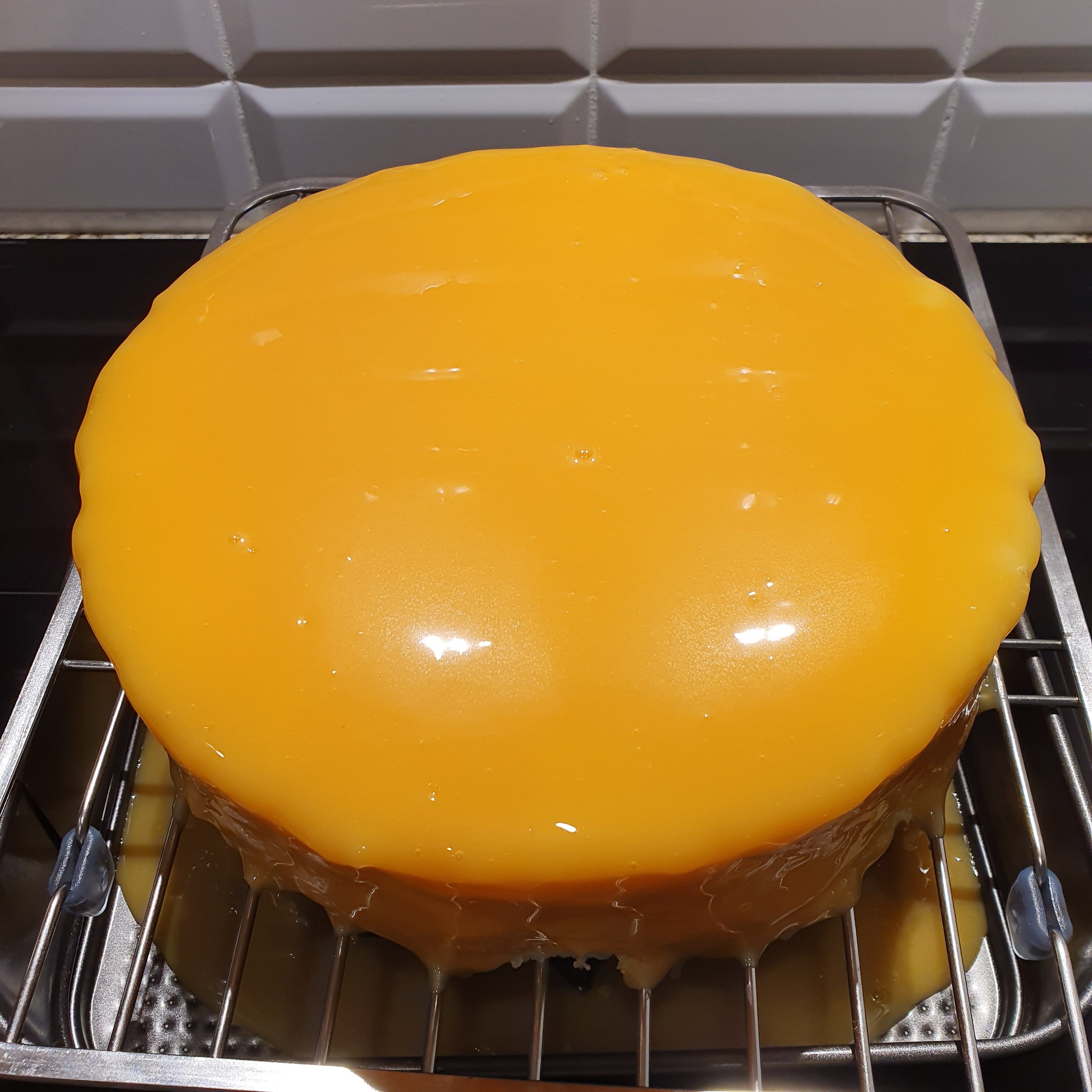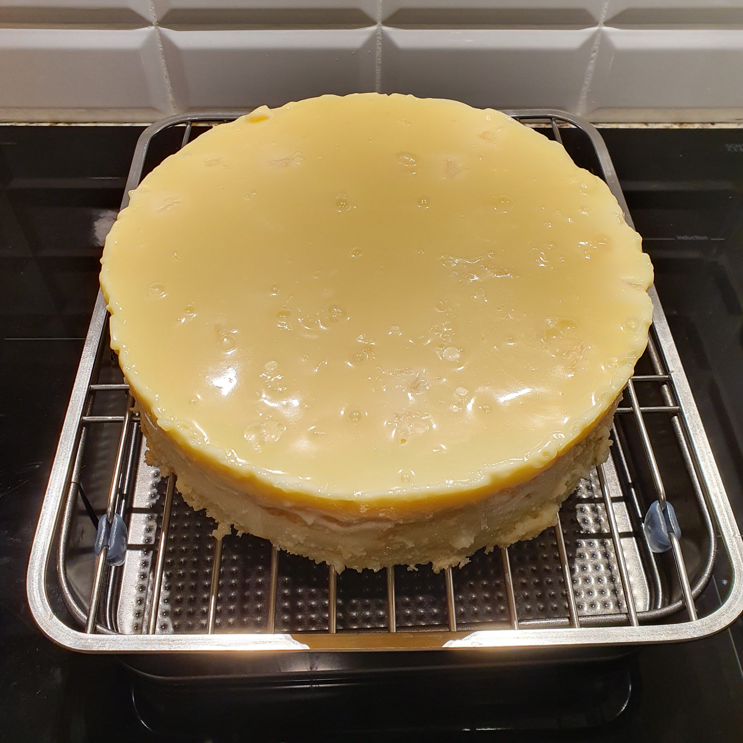 Take the cake out of the fridge and release it from the ring. Place it on a wire rack on pan.
