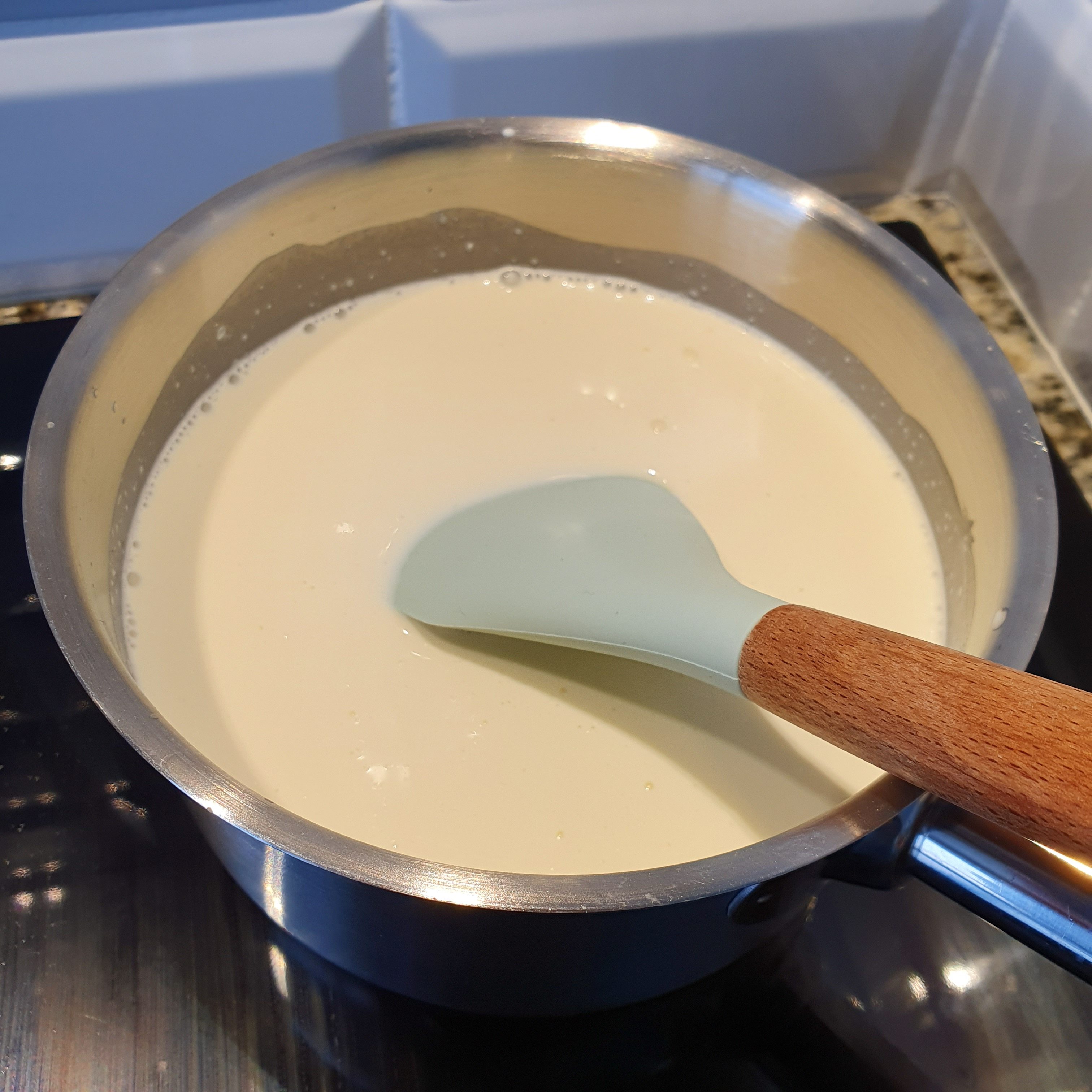 We start with one panna cotta cream first, because it needs time to cool down a bit. Heat the cream and sugar on the stove until boils.
