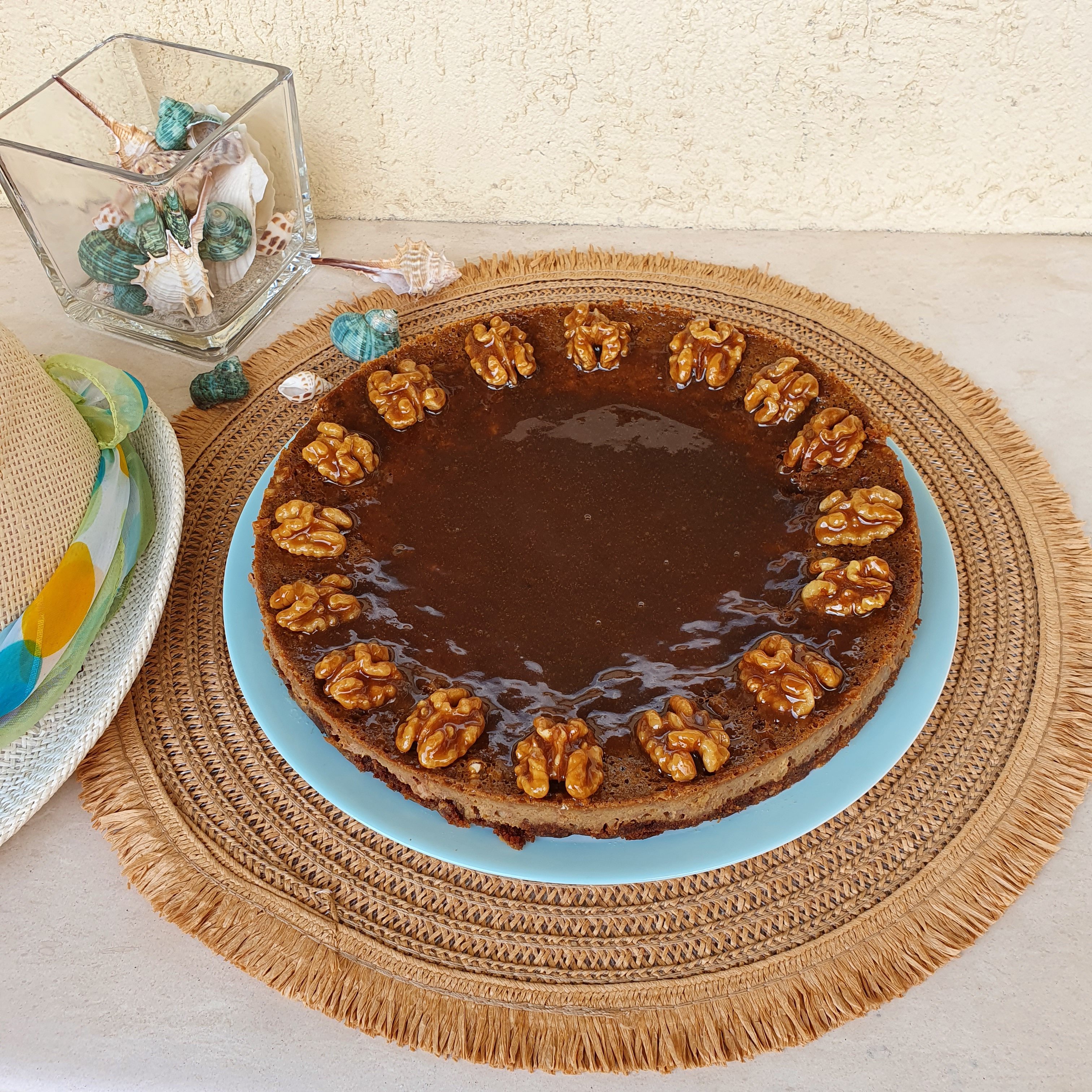 Arrange the nuts on the cake as we like and pour the glaze on the top. Well, that’s it. We’re ready. Return cake to the refrigerator to cool.