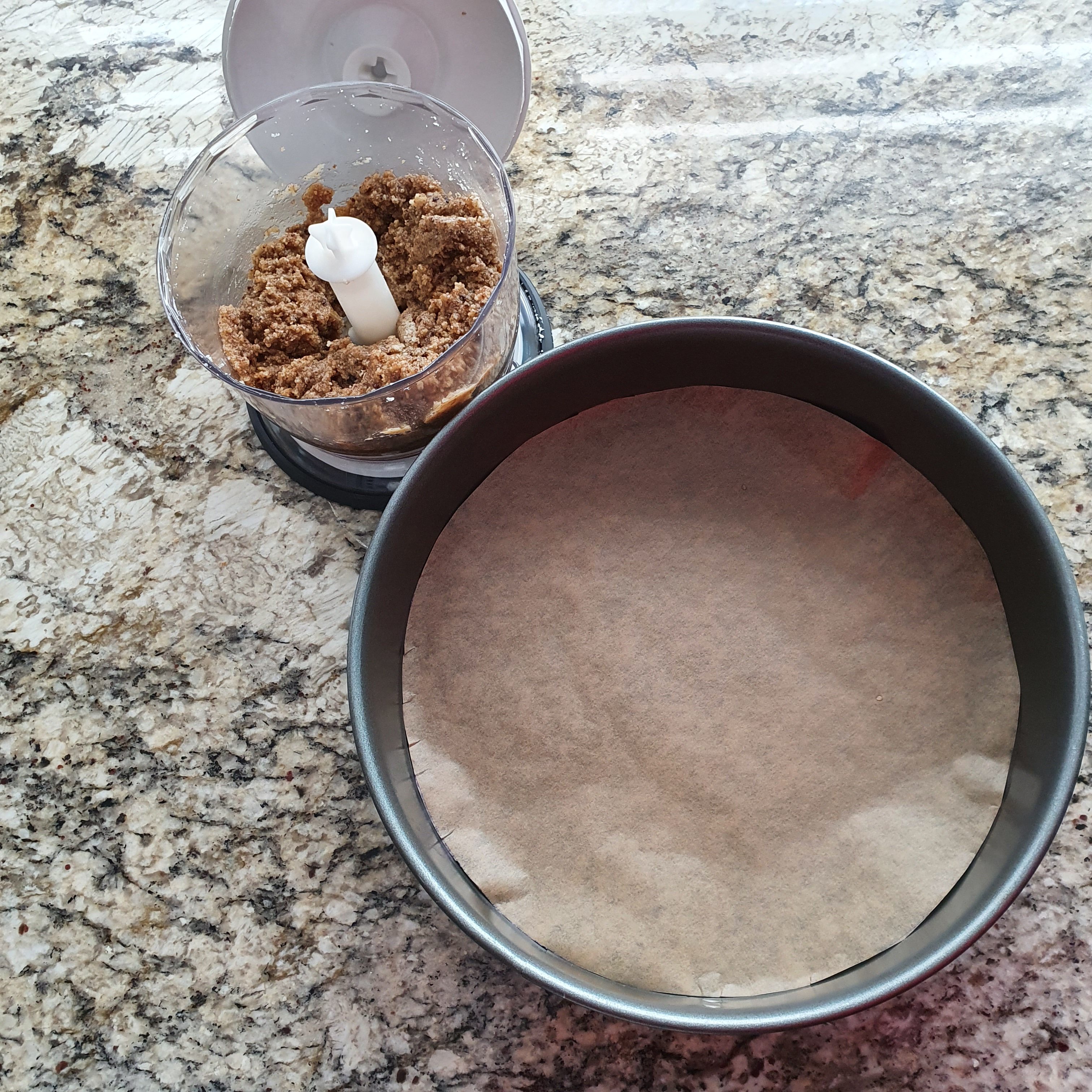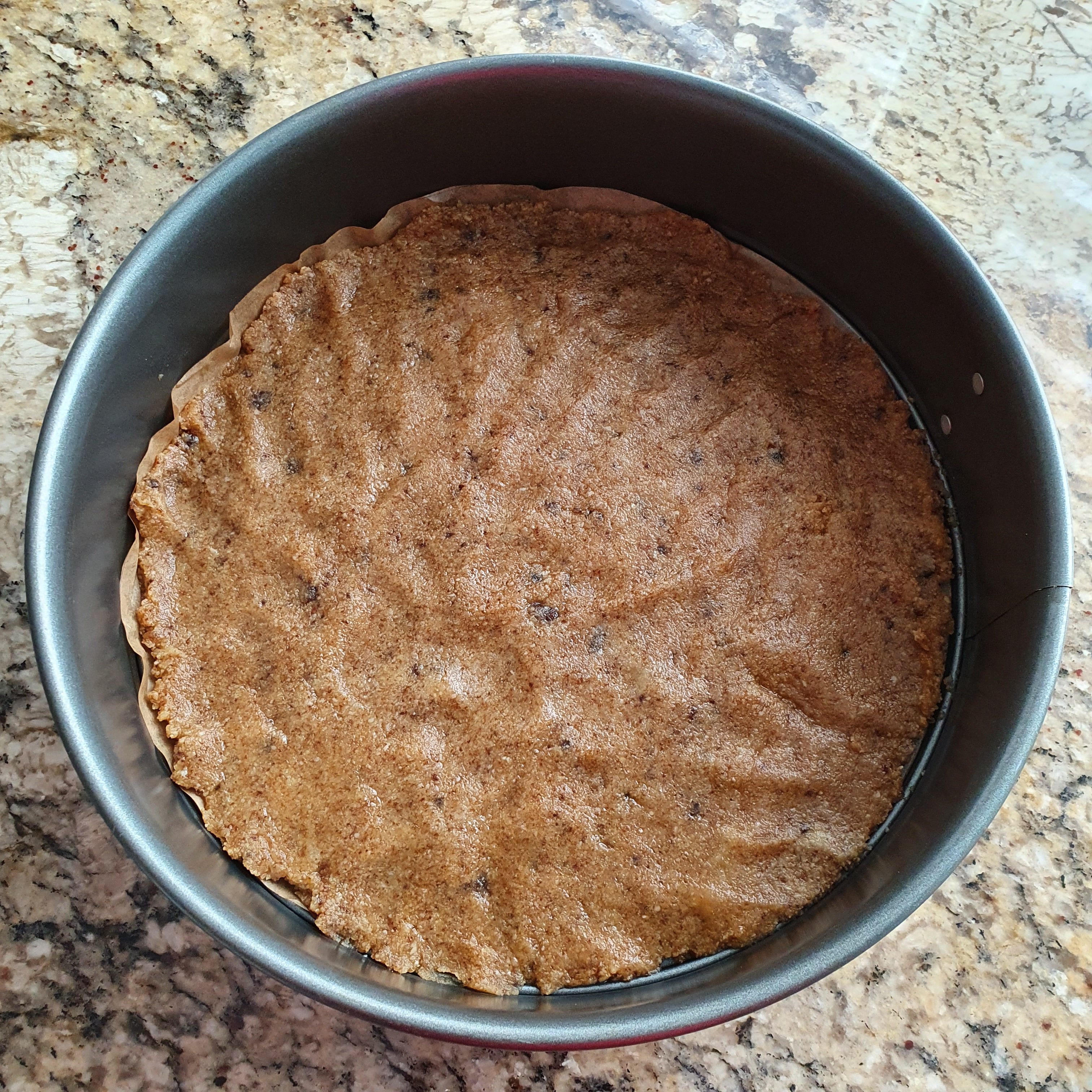 Mix all the dry ingredients for the base in a blender. Finally add the melted butter and mix everything. In a 22 cm diameter tray, place baking paper on the bottom. Pour the mixture and level out.