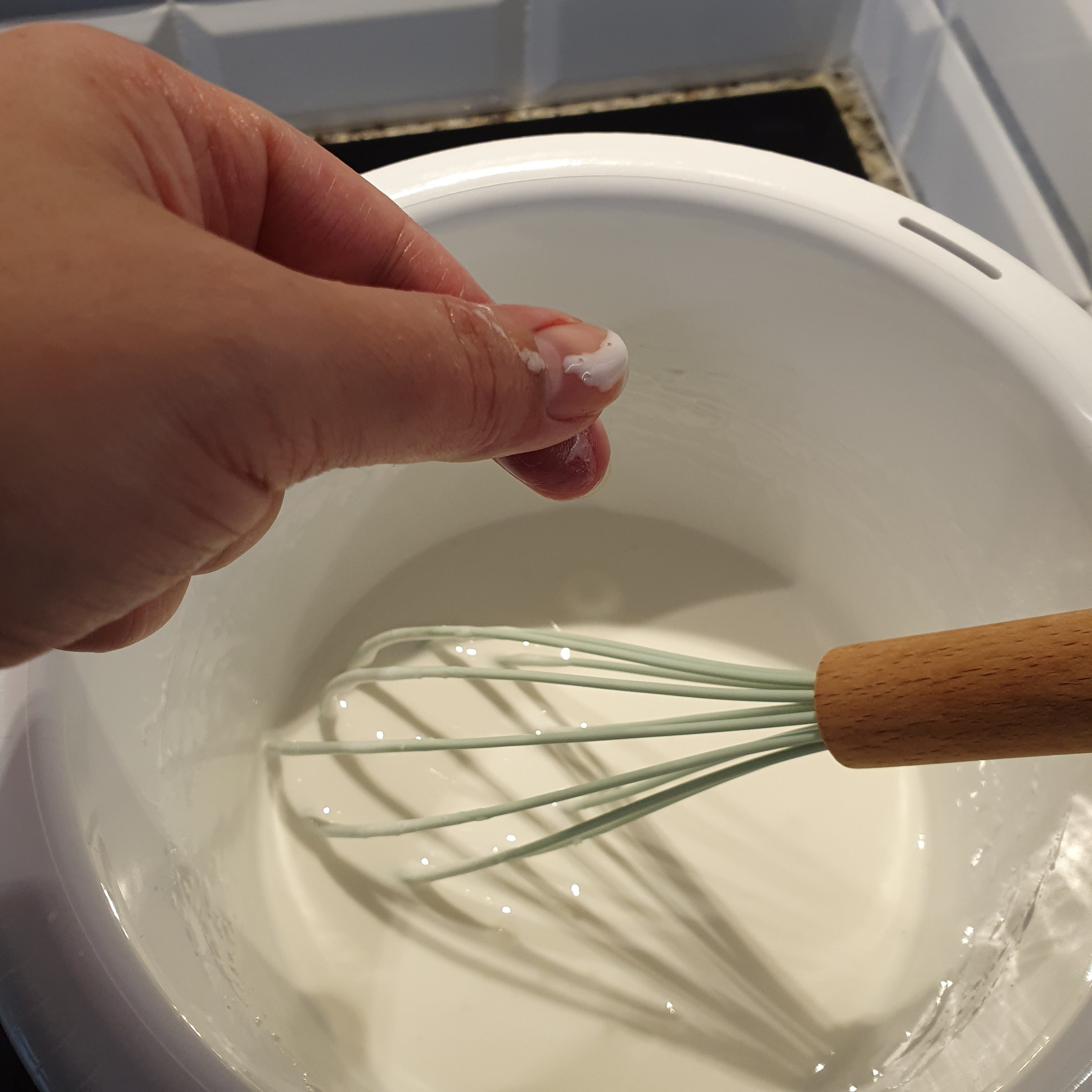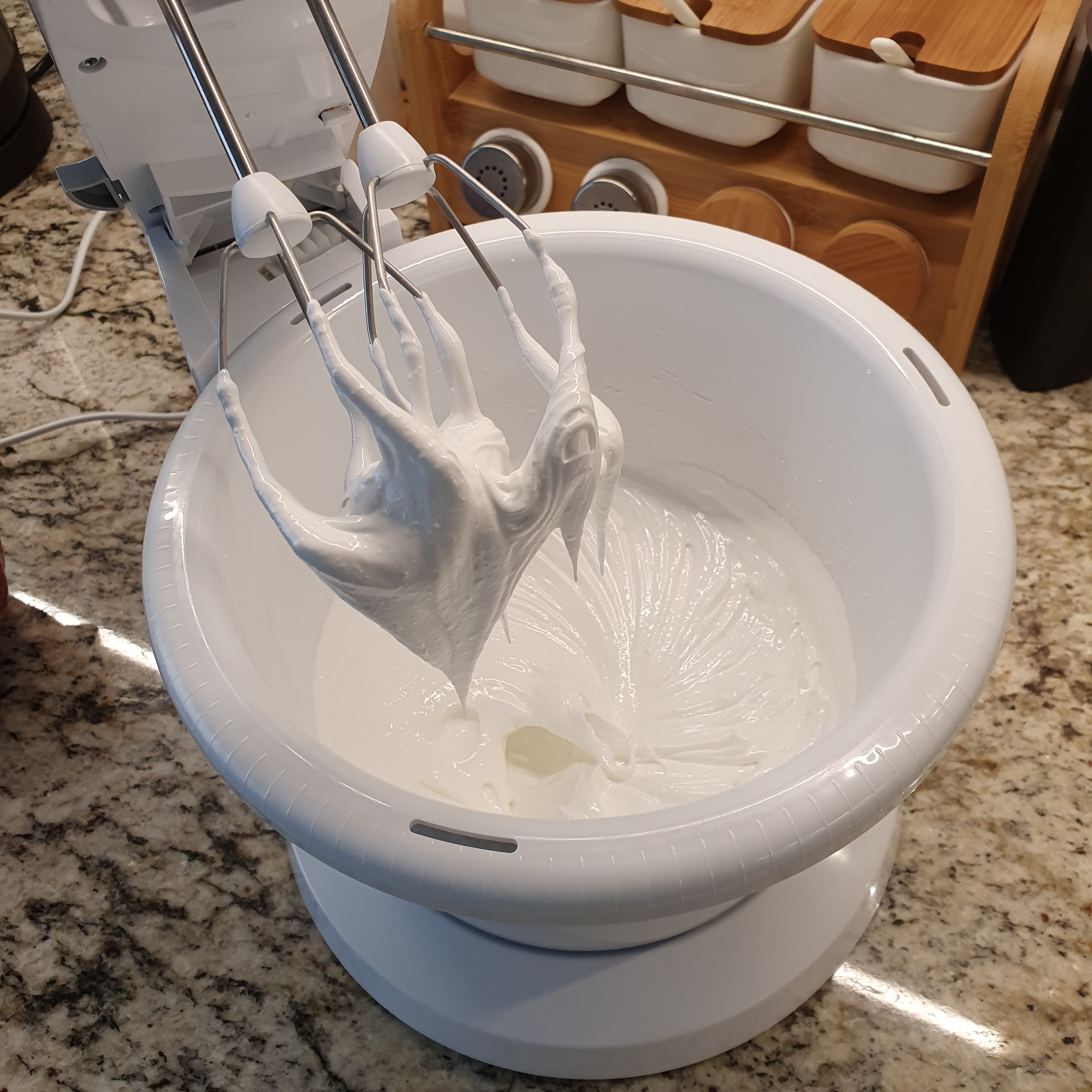 Remove from the heat and beat with a mixer at maximum speed until the mixture becomes thick and shiny. It takes about 10 minutes.