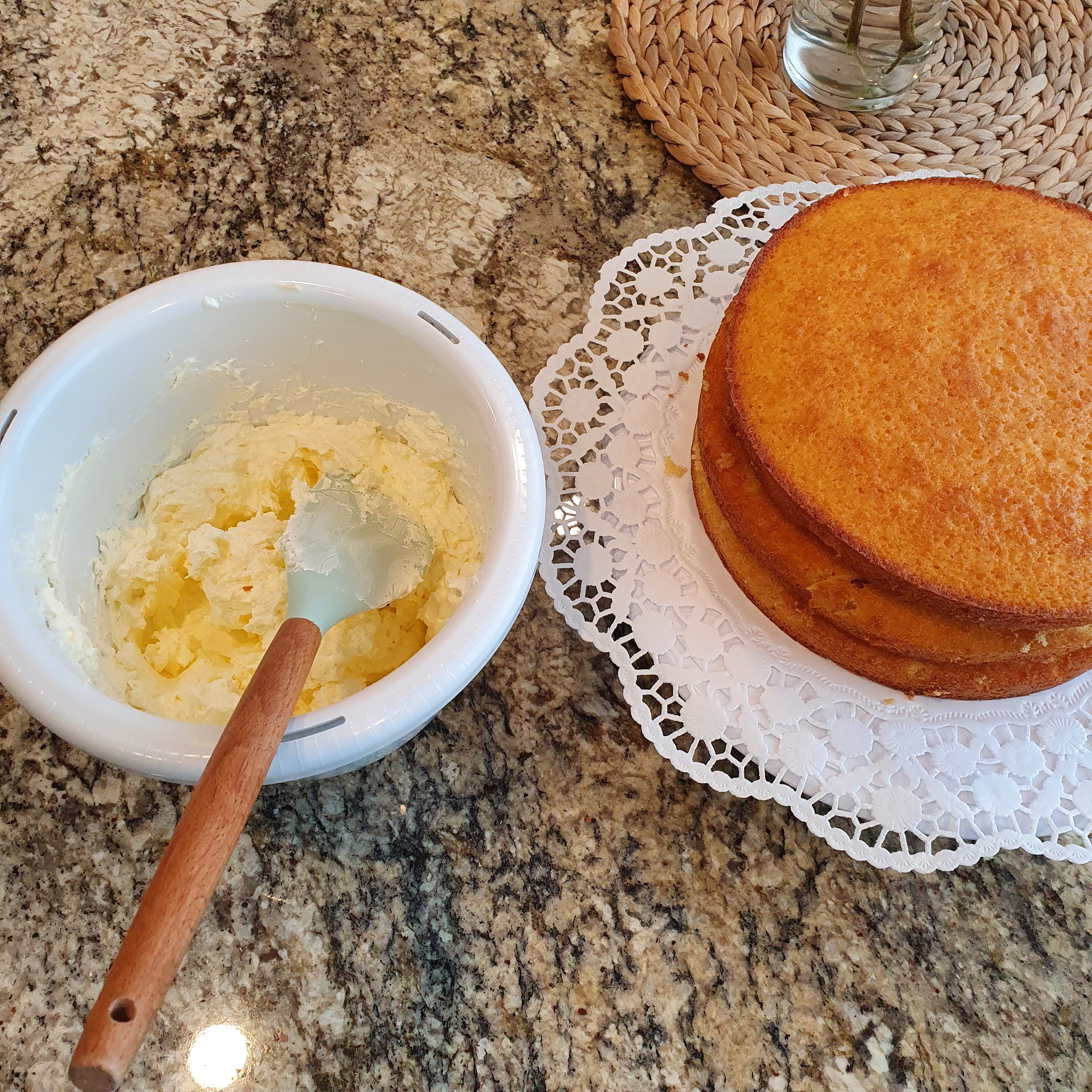 Spread a piece of cream on top and sides of the cake and put cake to cool while we make the decoration.