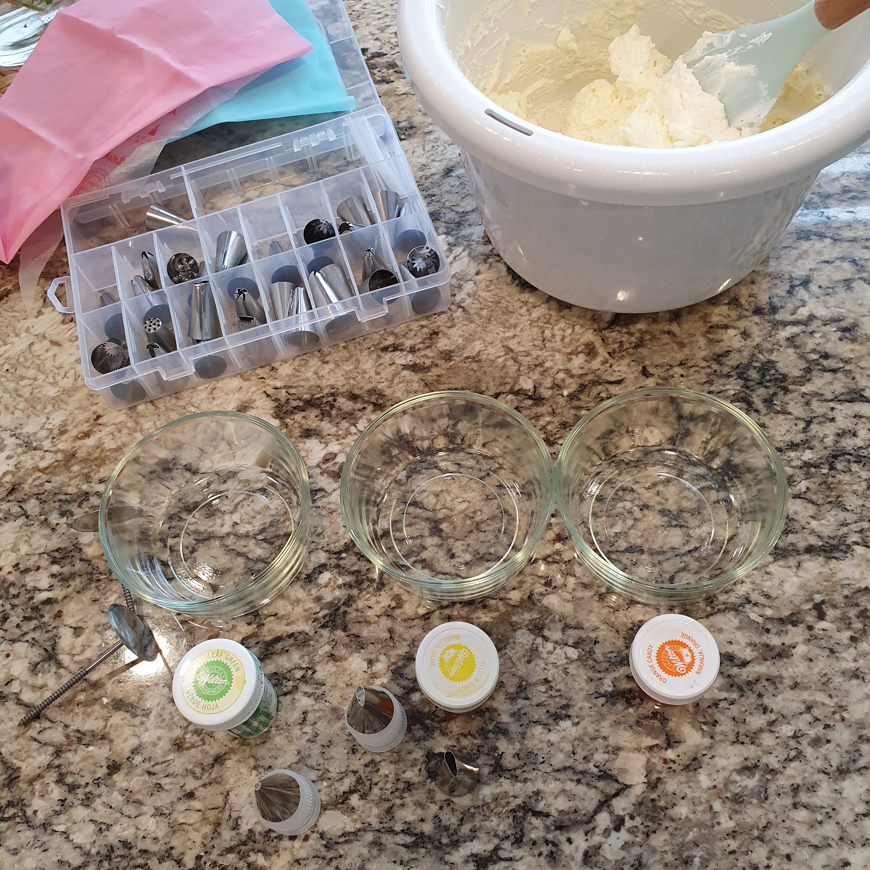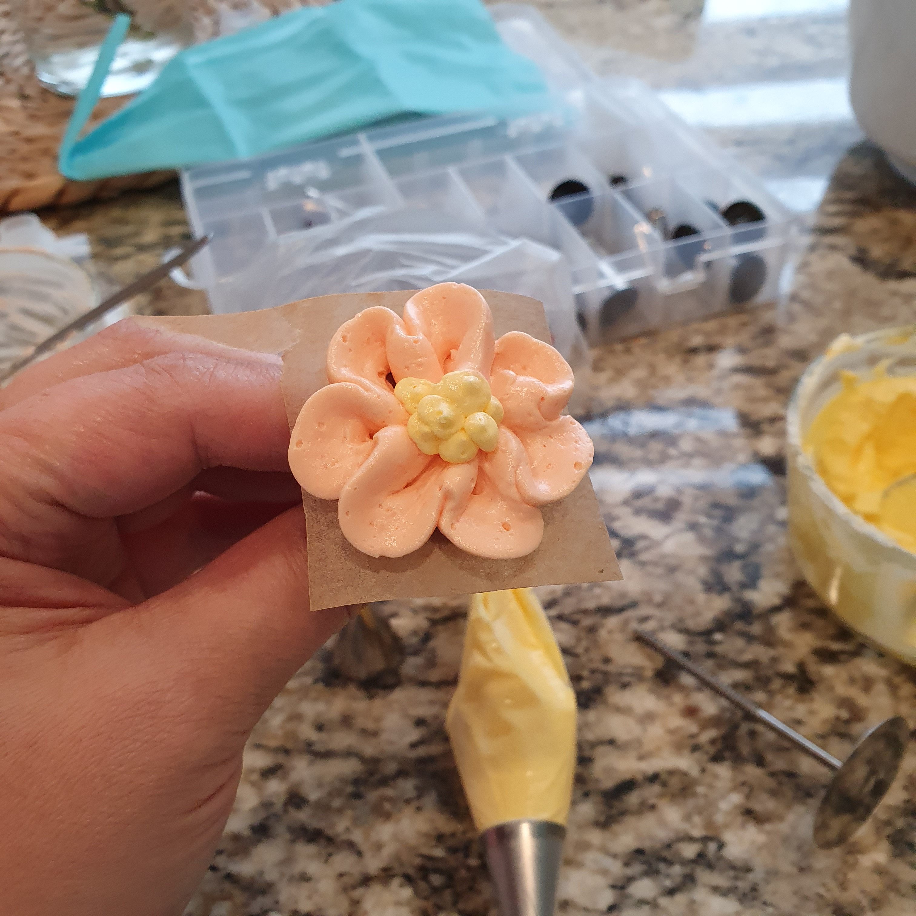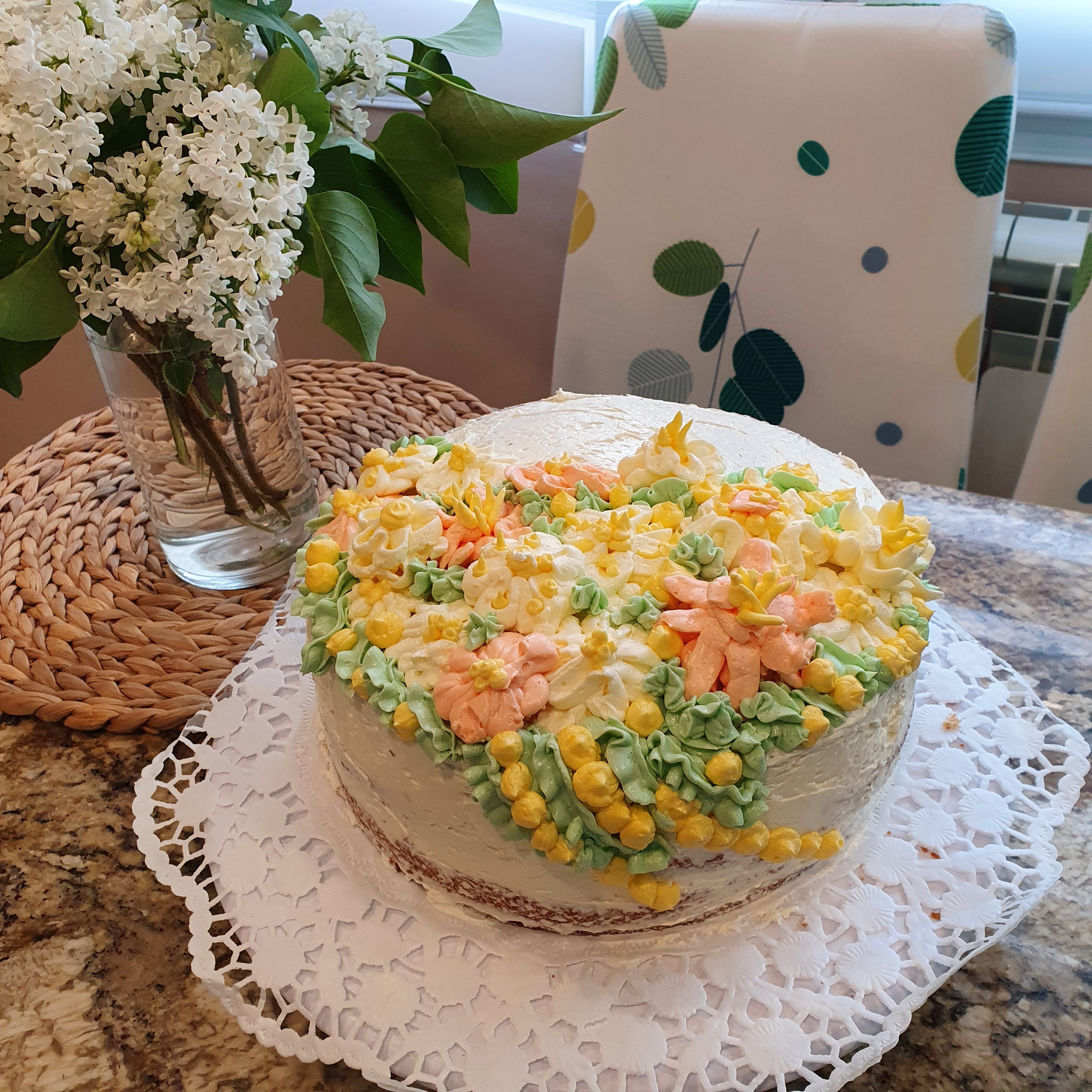 I’ve had a set of nozzles for pastries and pastry nails for a long time, but I hadn’t tried making flowers because I didn’t know which cream was best. Until I discovered the Swiss butter cream. I decided to use four colors – white, peach, yellow and green. I use gel paints for cakes.