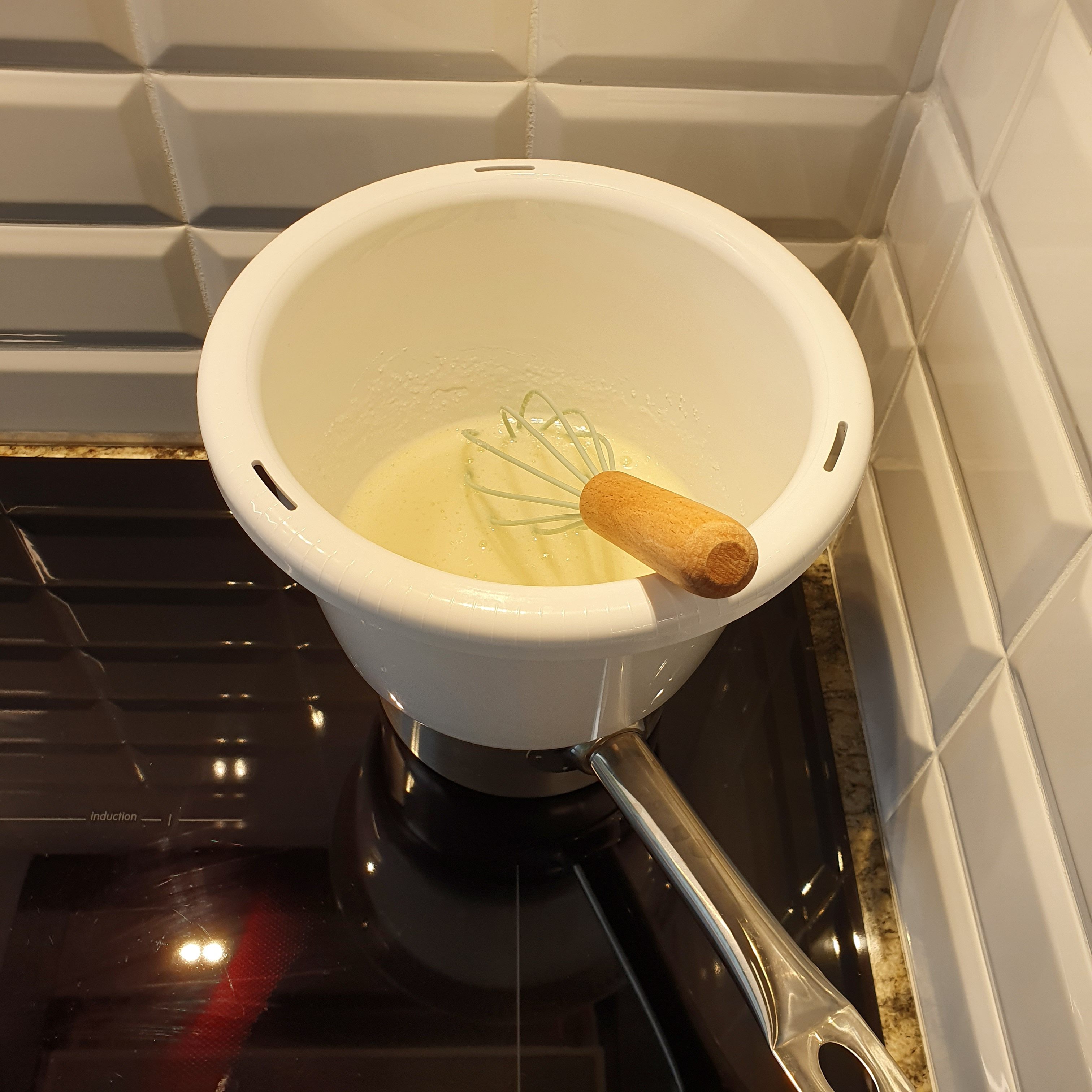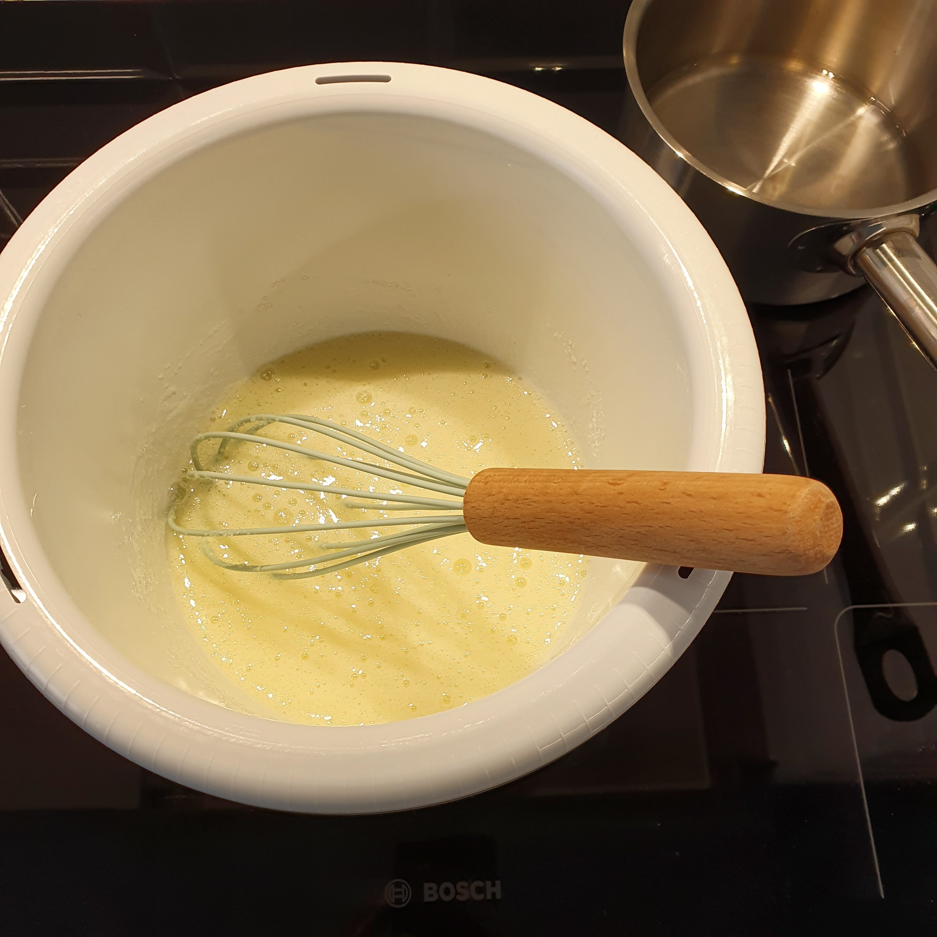 Beat lightly with a mixer and place in a water bath, stirring constantly. The water from the bowl should not touch the bowl with the egg whites, so as not to cook them on an omelet.