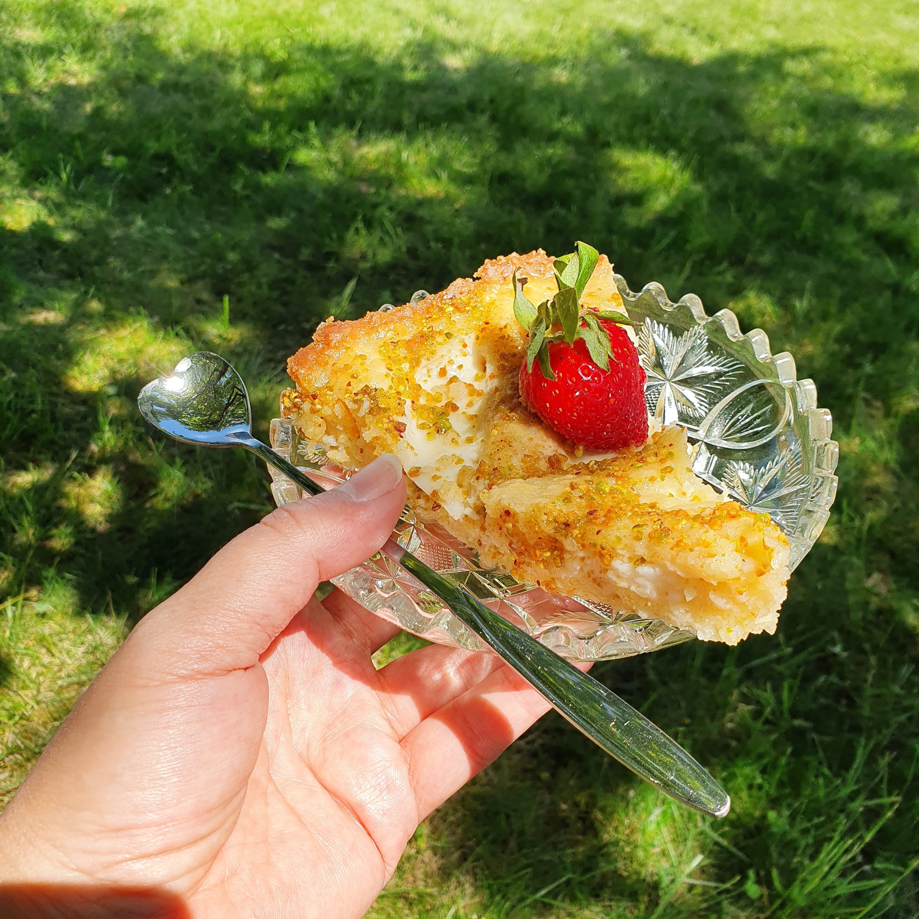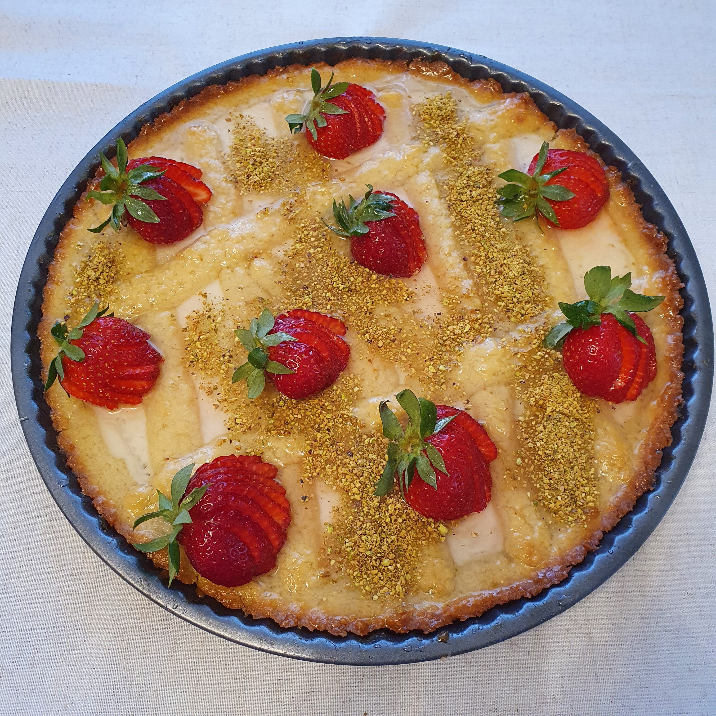 Arrange strawberries / raspberries / cocktail cherries on the cake. According to the original recipe are cocktail cherries. I couldn’t find it and decided to use strawberries as there are plenty of them now. Spread the syrup with a brush, spreading the fruit for shine. Finally, you can garnish with ground pistachios.