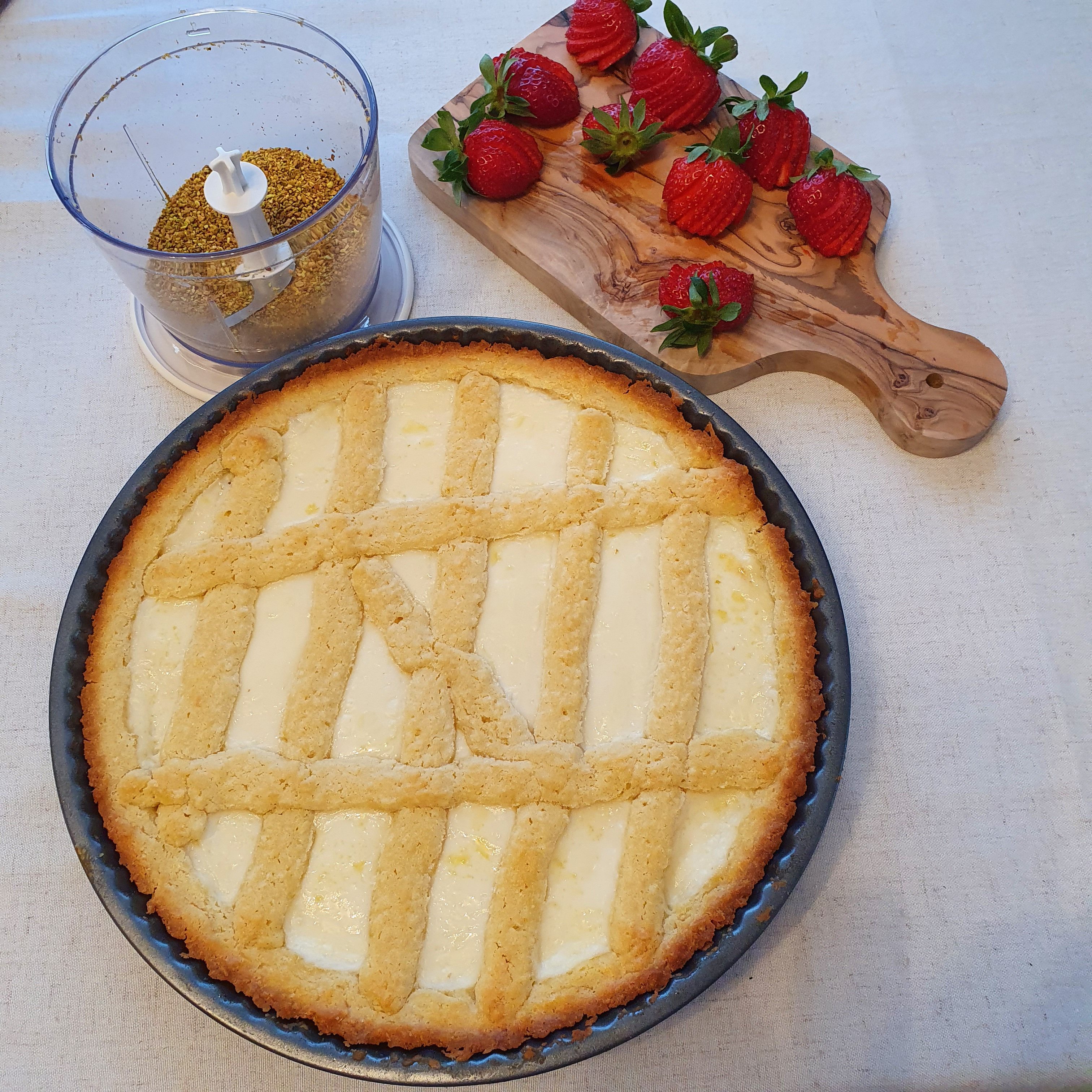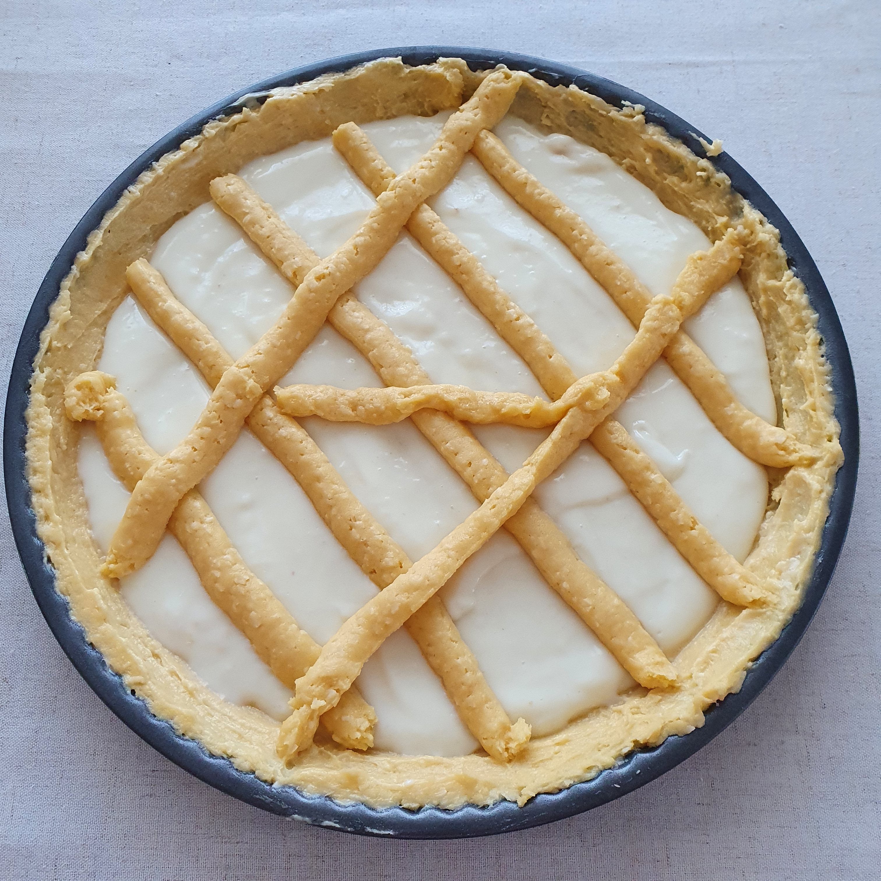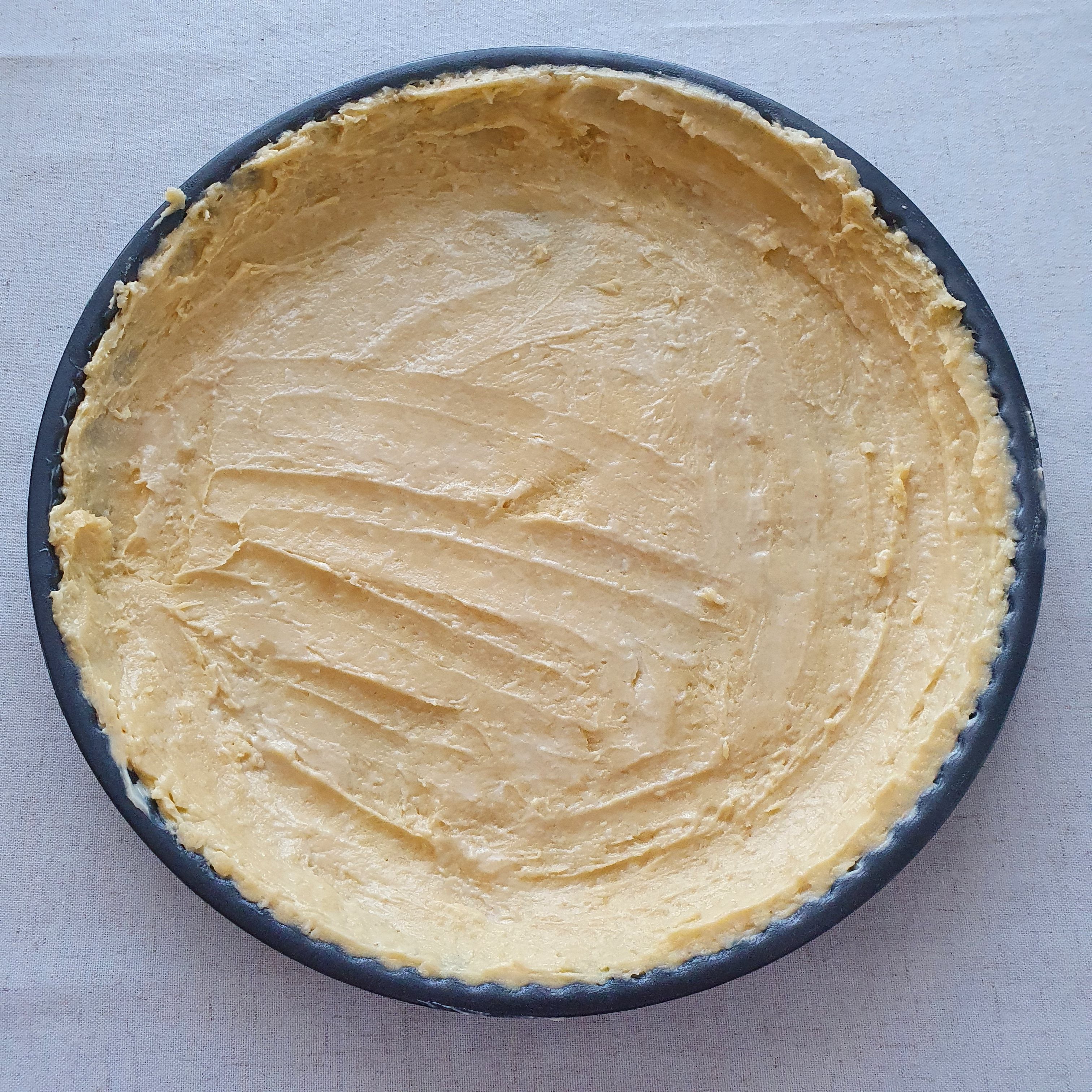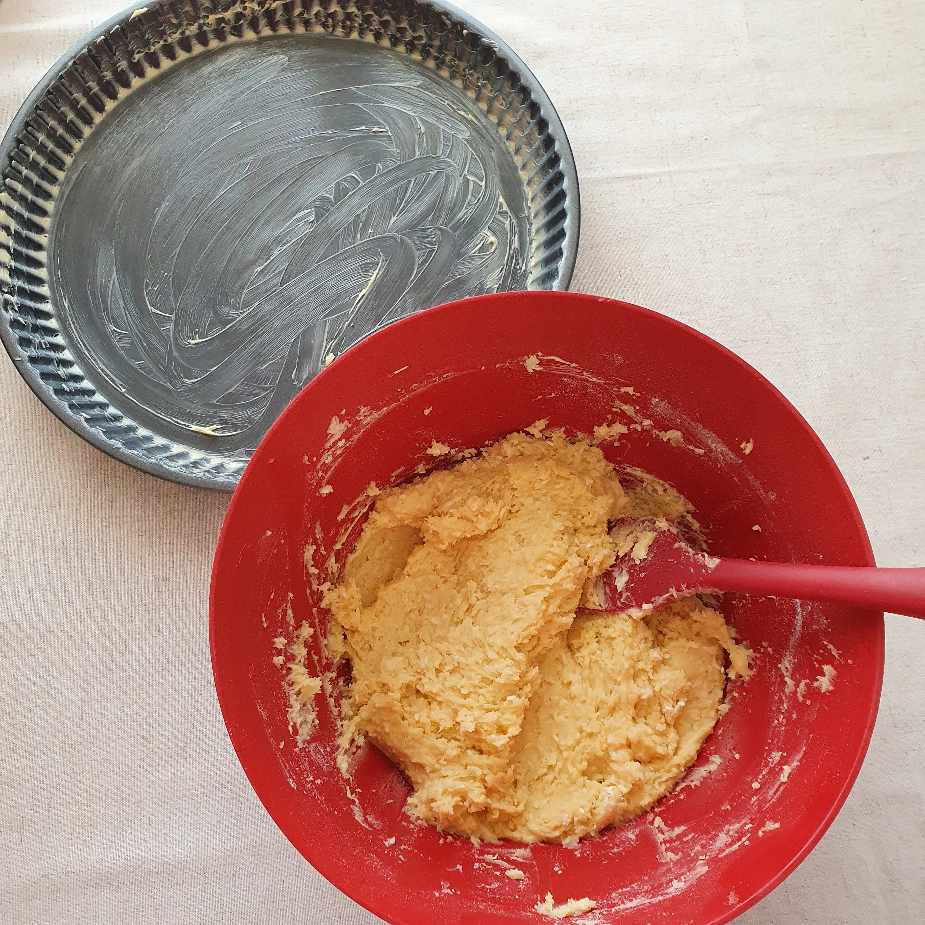 Grease a pie pan with oil. Separate about 2/3 of the mixture or more to make the base of the cake. The mixture is quite sticky, so wet your hands and shape the base. You will even have to wet them a few times because it sticks a lot.