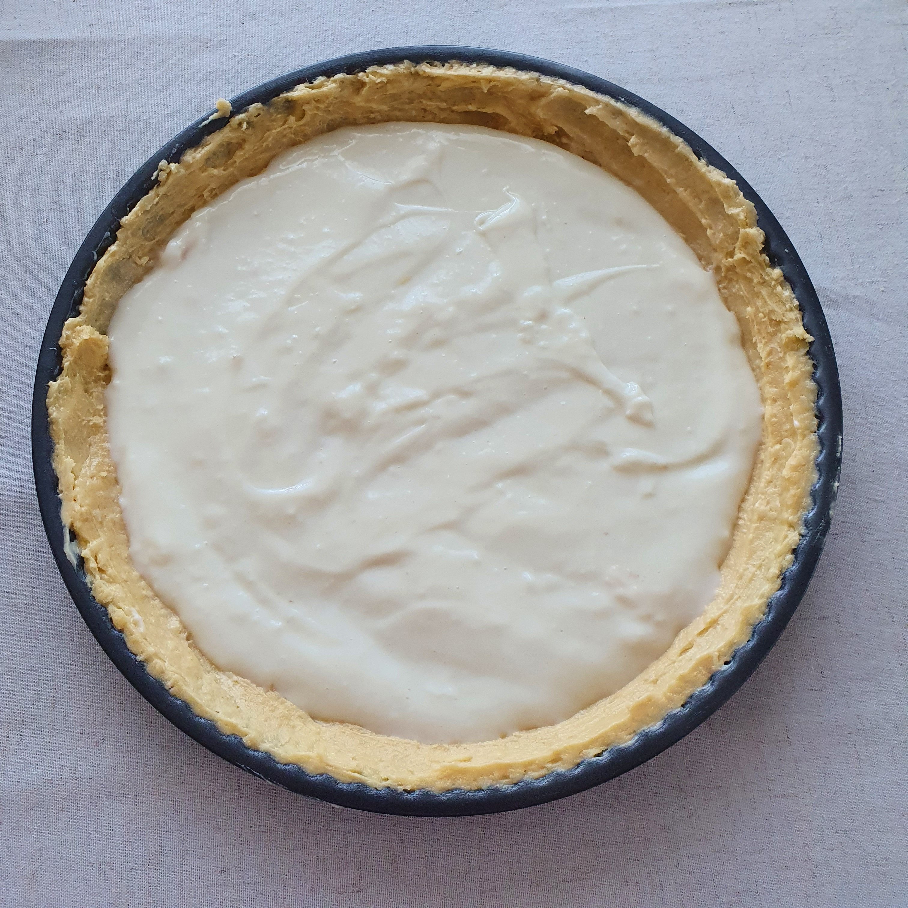 Pour the cooled filling, being careful to keep it under the edge of the base so that it does not burn during baking.