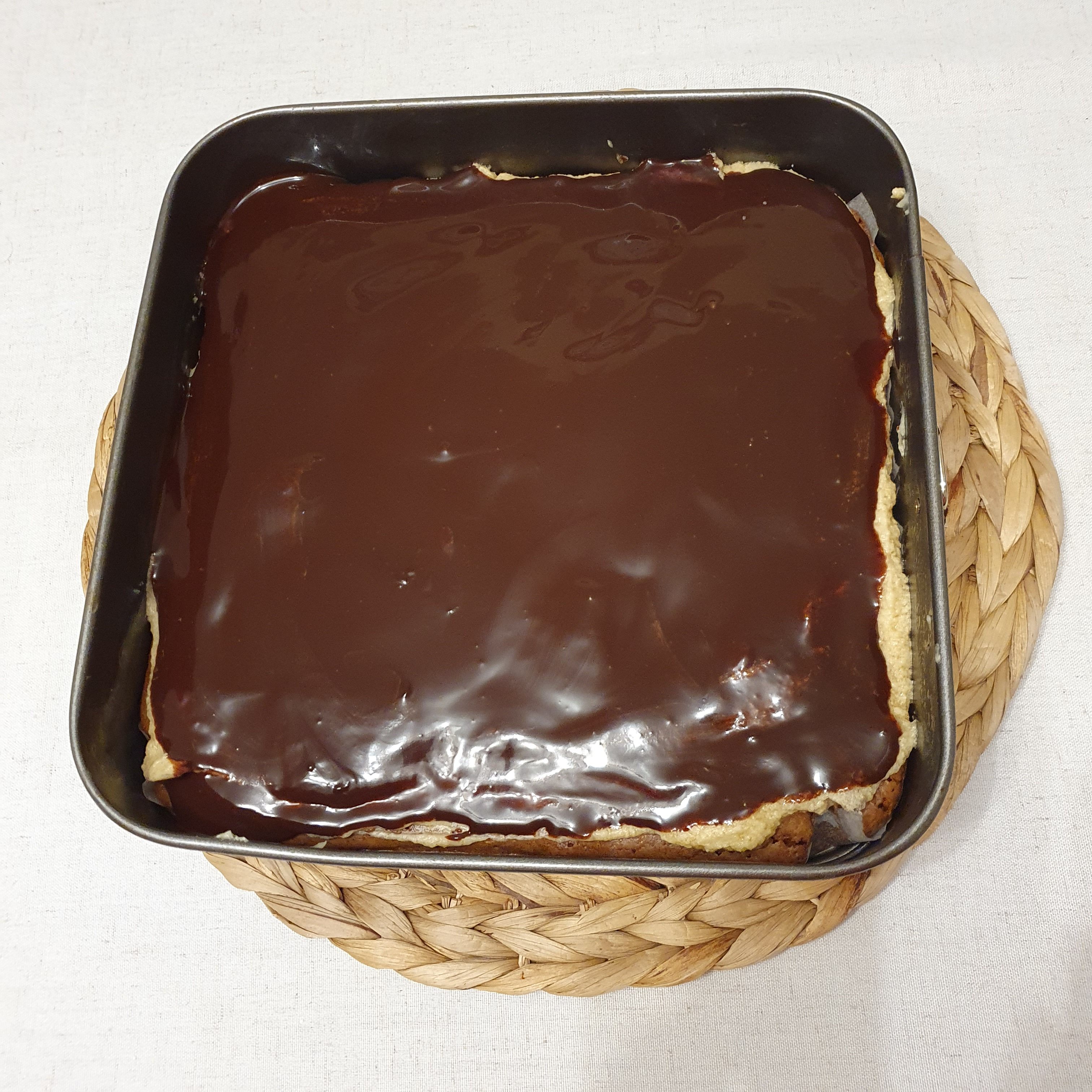Pour the chocolate sauce over the cake and add to the fridge to cool for at least an hour.