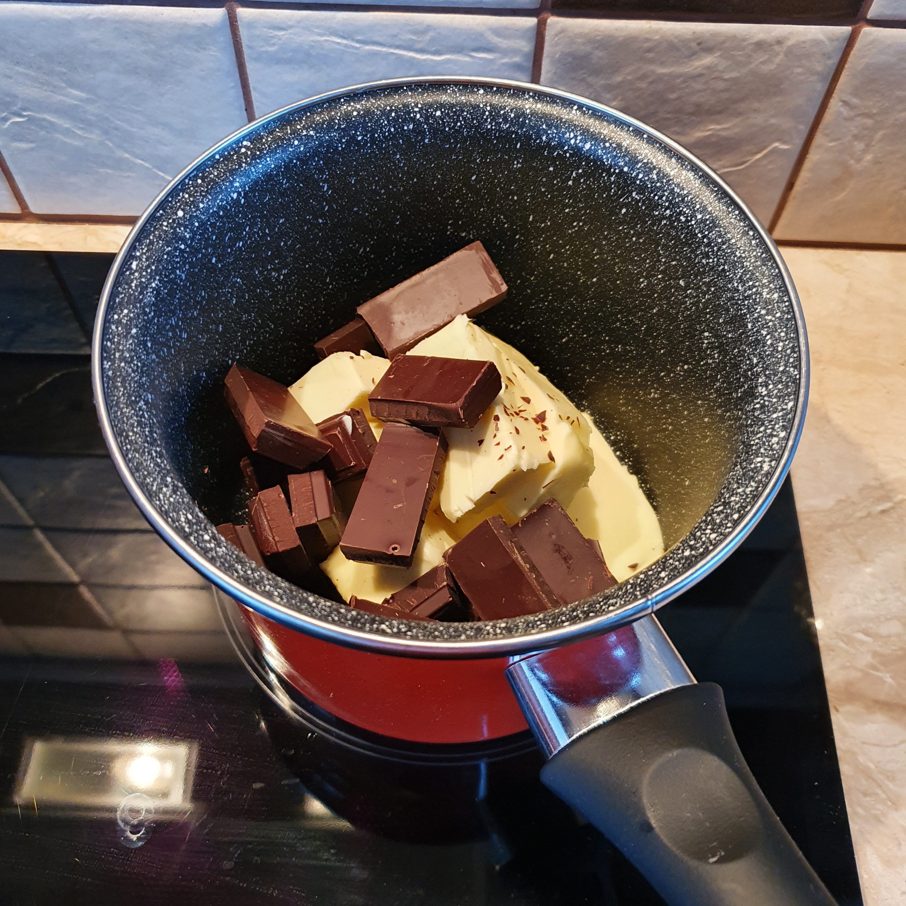 Start by melting the brownies butter and chocolate over low heat. When completely melted, set aside to cool to room temperature.