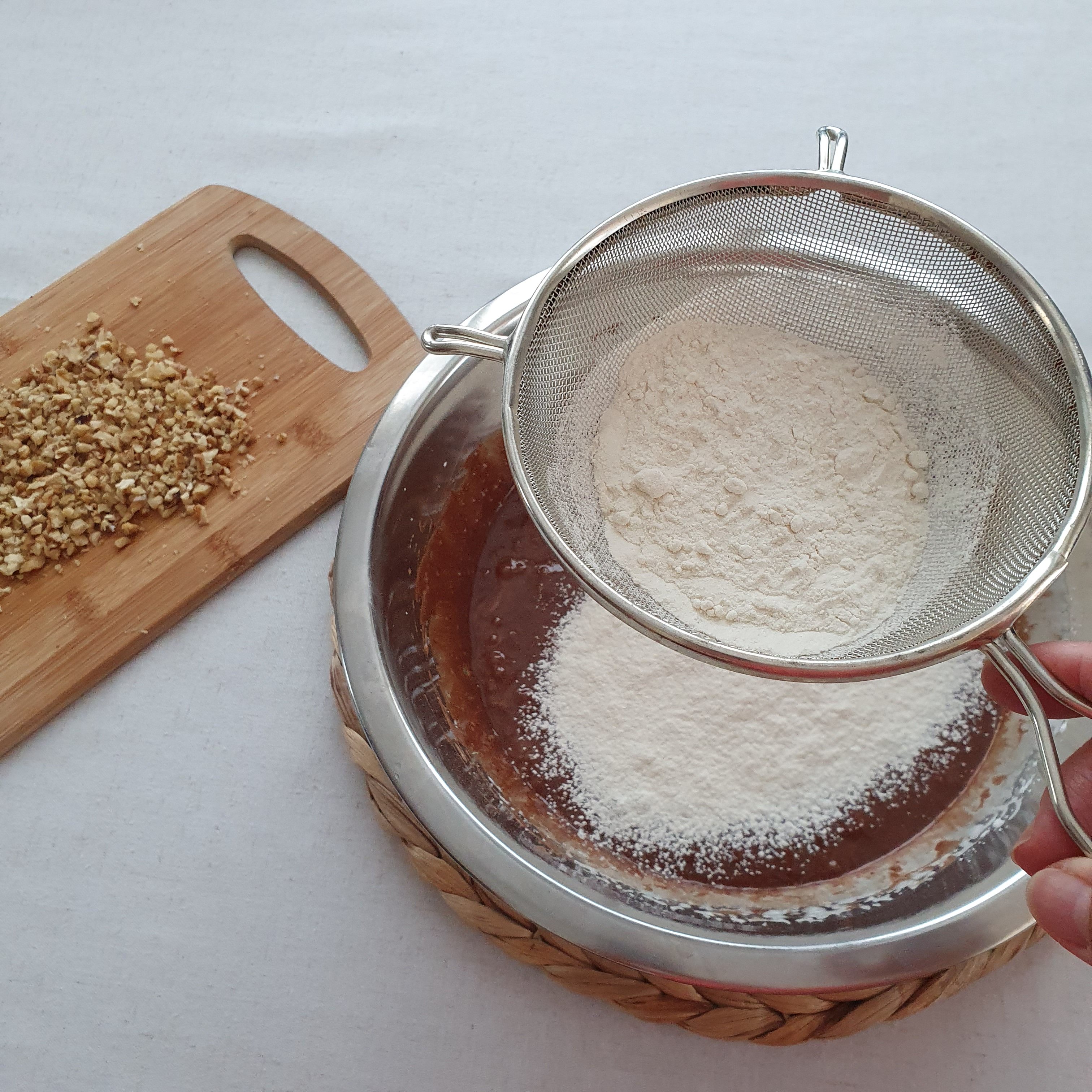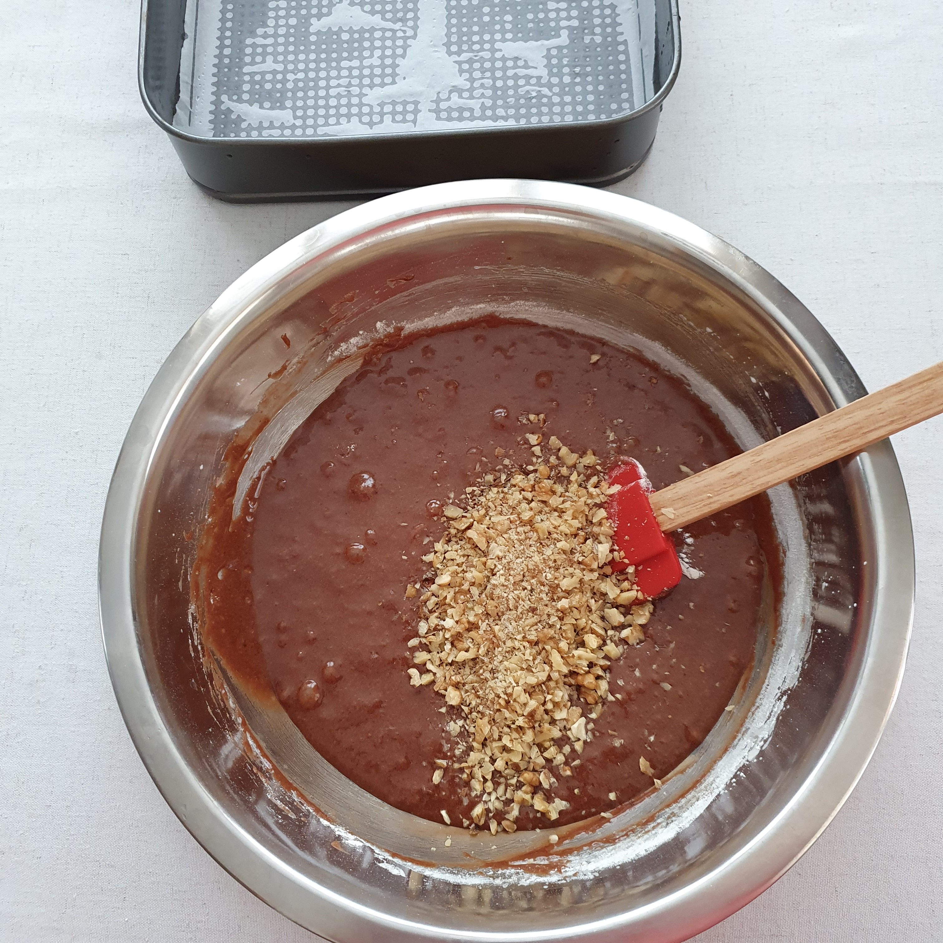 Stir slowly and gently with a spatula from the bottom up so as not to lose the volume of the mixture. Finally add the vanilla and finely chopped walnuts.