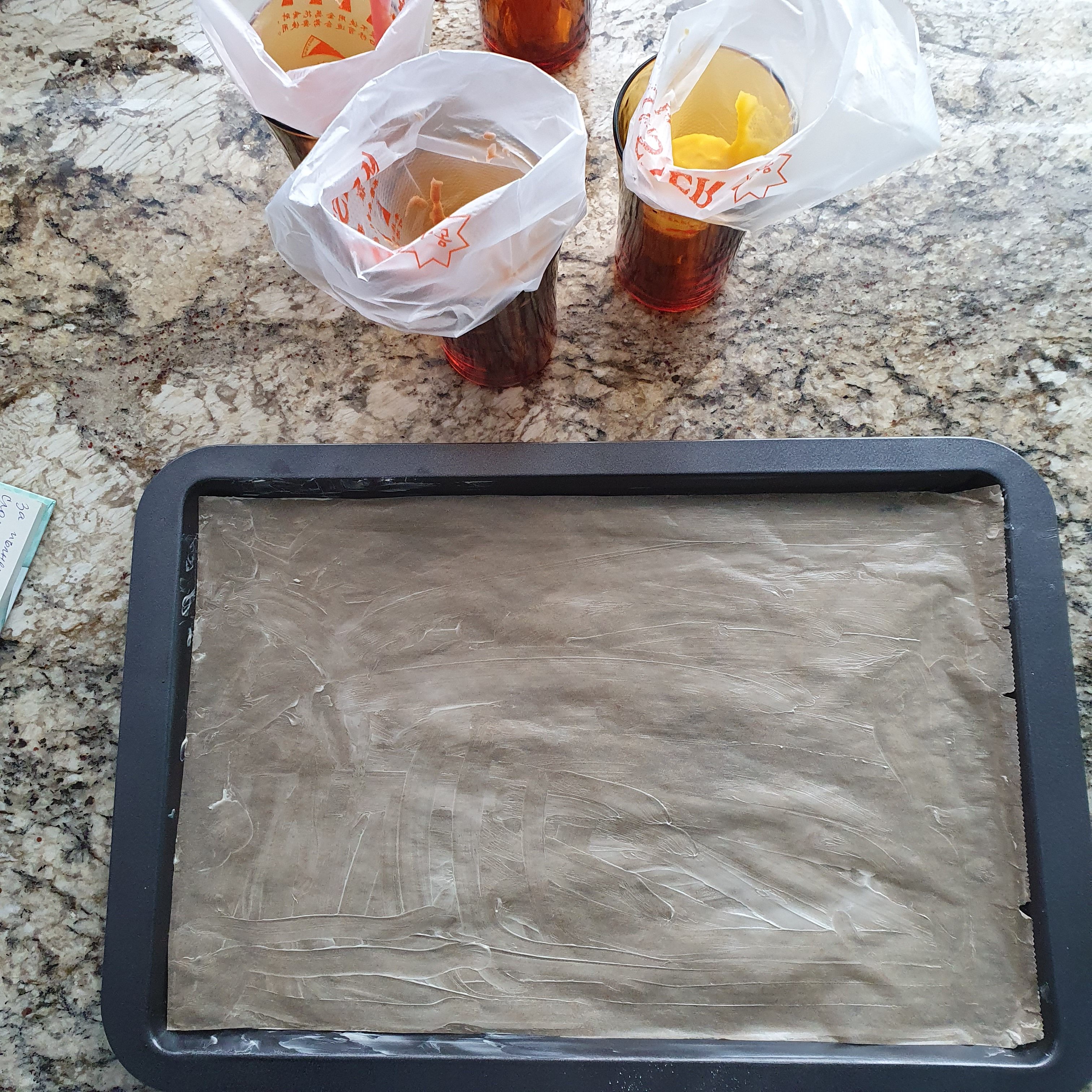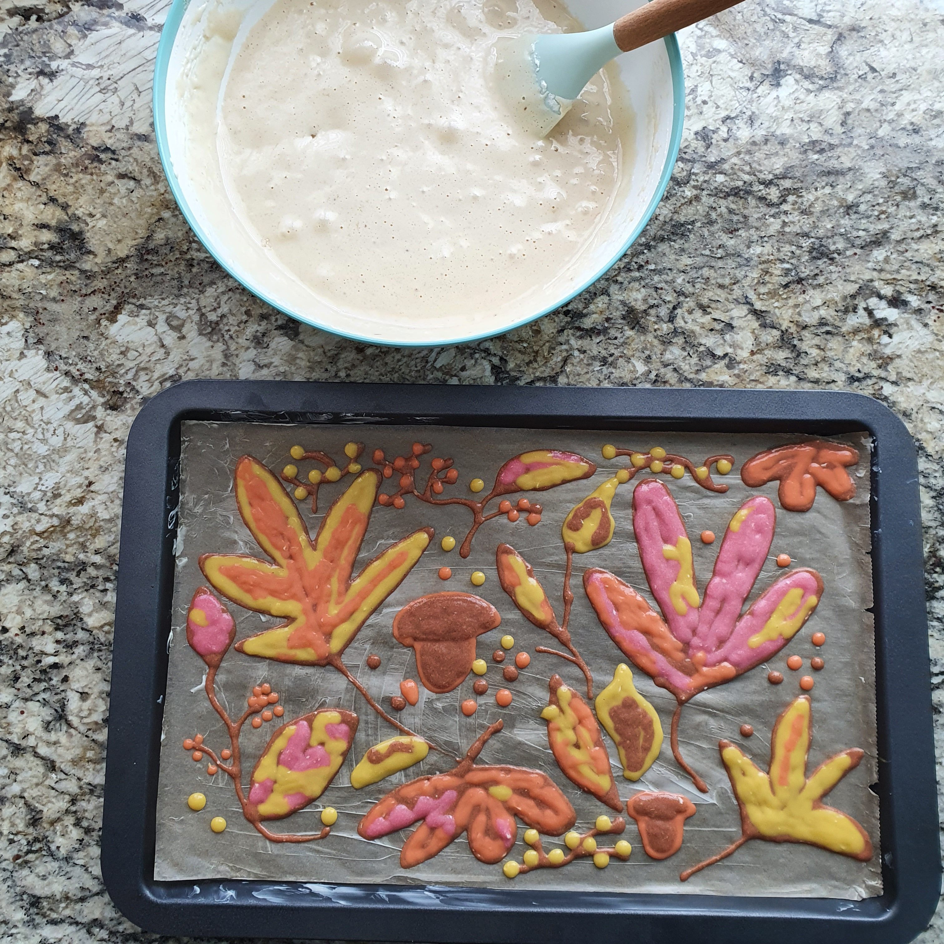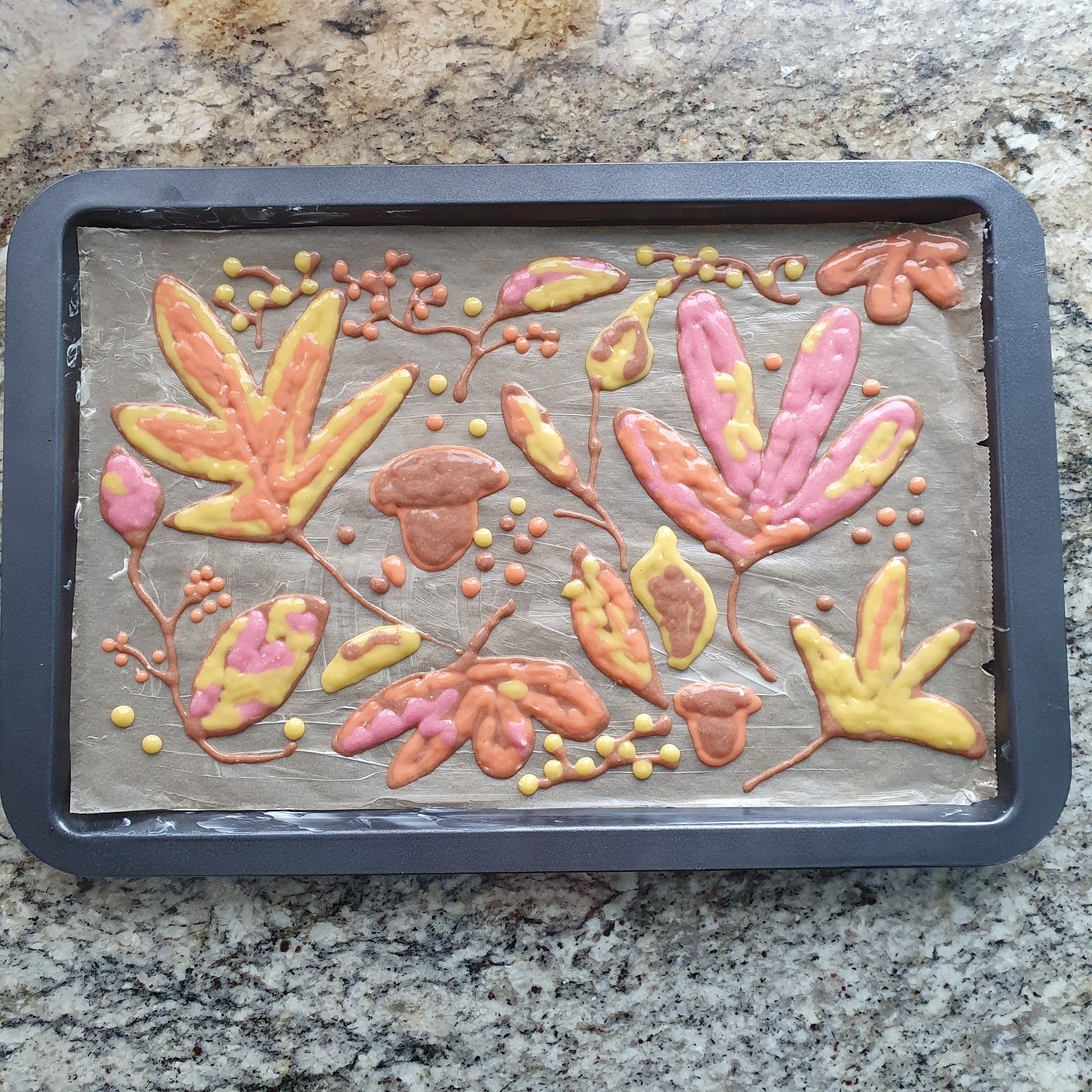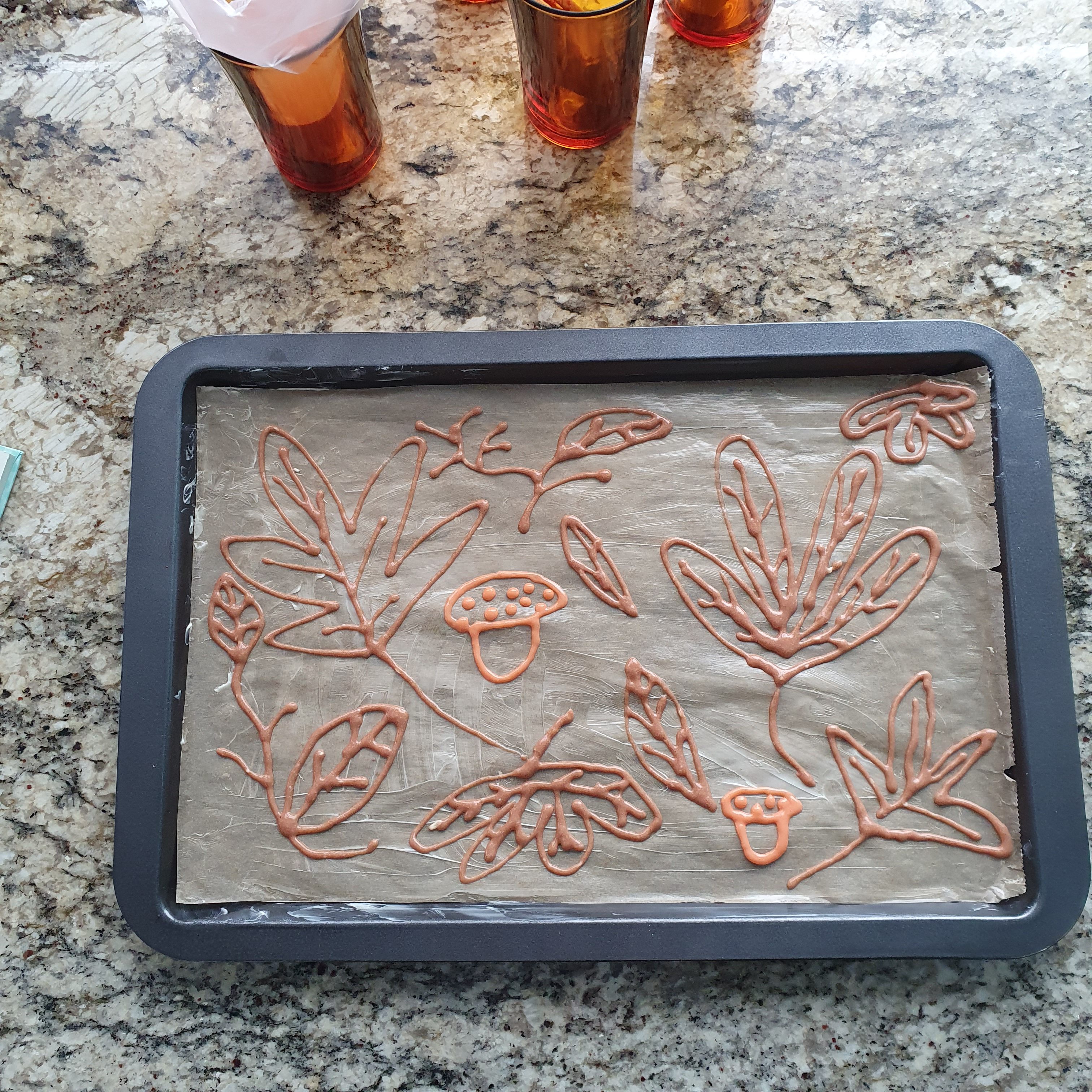 Fill 4 bags with different color mixture. I first drew the twigs and contours of the leaves and acorns. Leave the pan in the refrigerator for 20 minutes to cool.