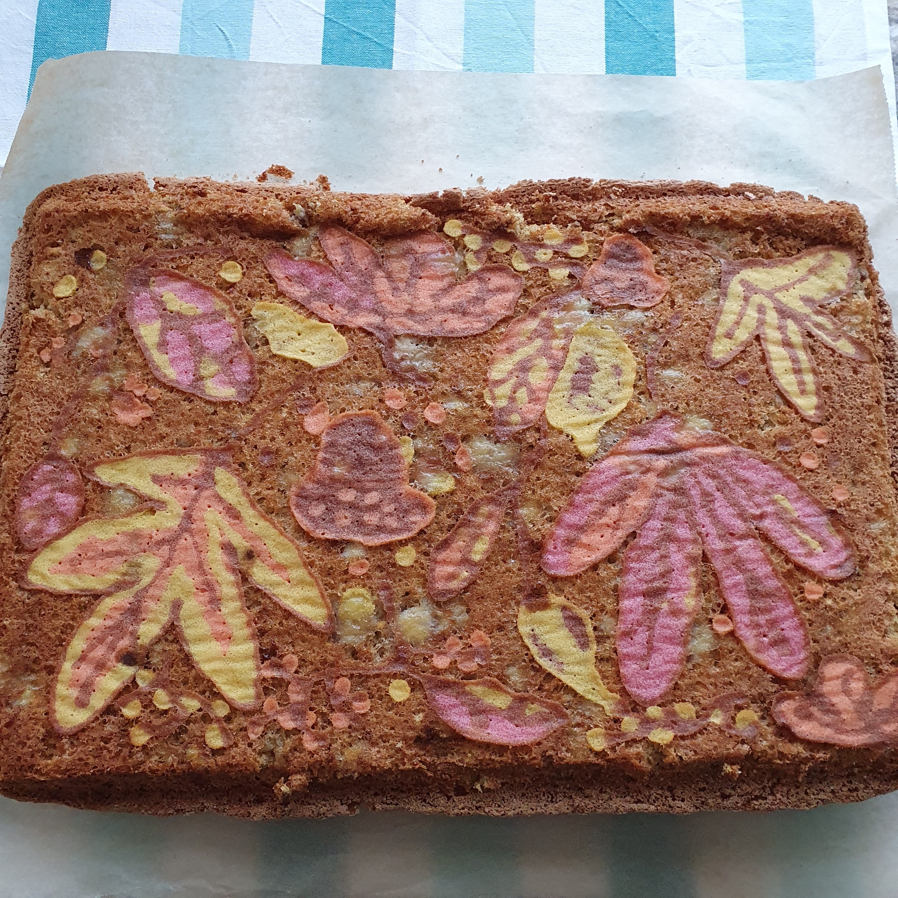 Once baked, you need to act quickly. Place a layer of baking paper on the tray and carefully turn the cake base over.