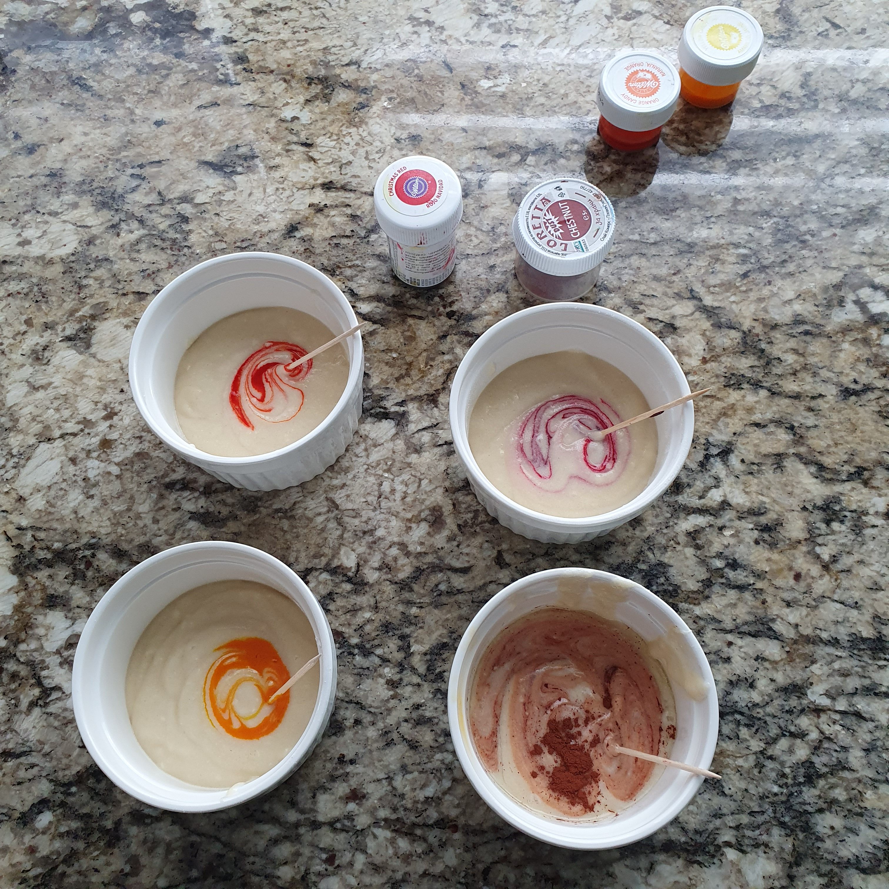 Beat the butter. Add the egg whites and sugar and beat well. Finally add the flour and mix. Divide the mixture into 4 bowls and color with confectionery paint.