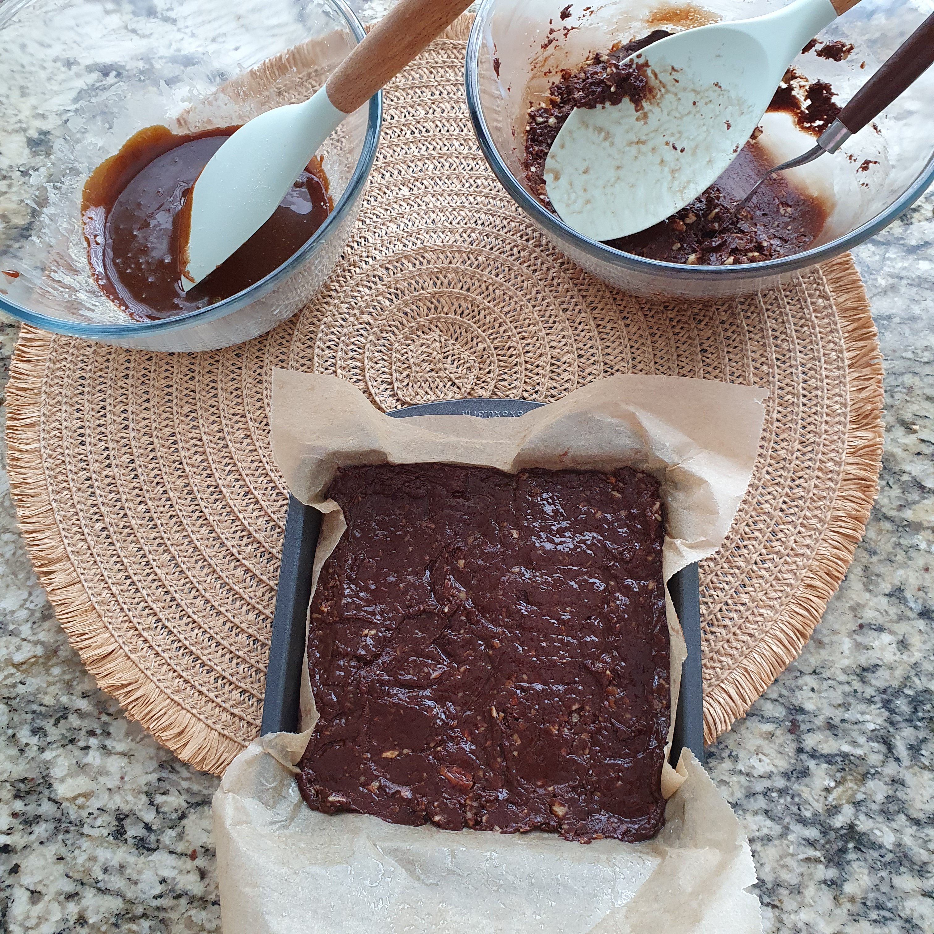 Pour half of the chocolate mixture into the pan, then the caramel mixture and finally the rest of the chocolate.