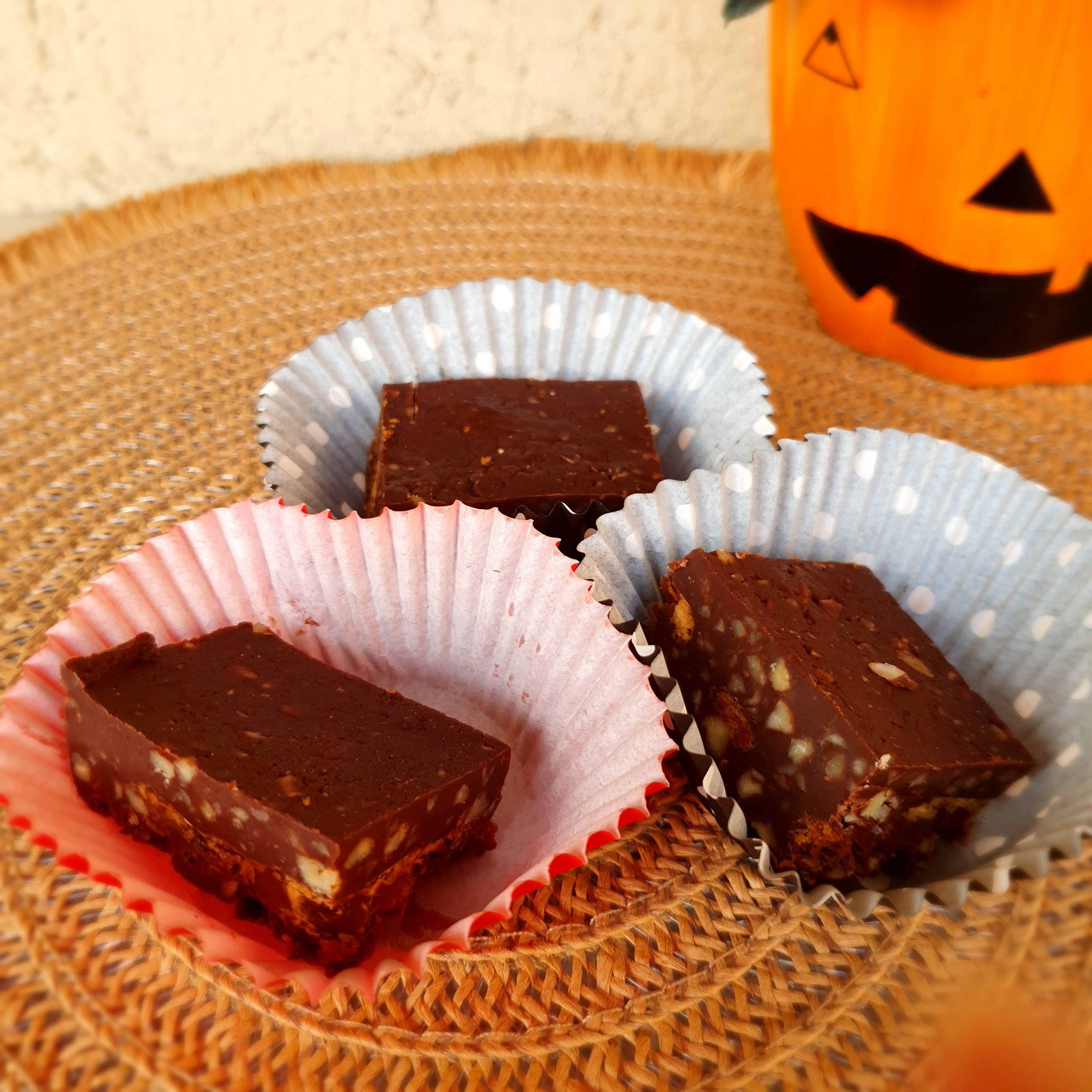 This week is Halloween. A holiday where neighbors’ children ring your doorbell and expect treats. So you can cut the fudge into small squares and give to the children. You will surely make them happy. 😉 That’s exactly what I did and now they may come.