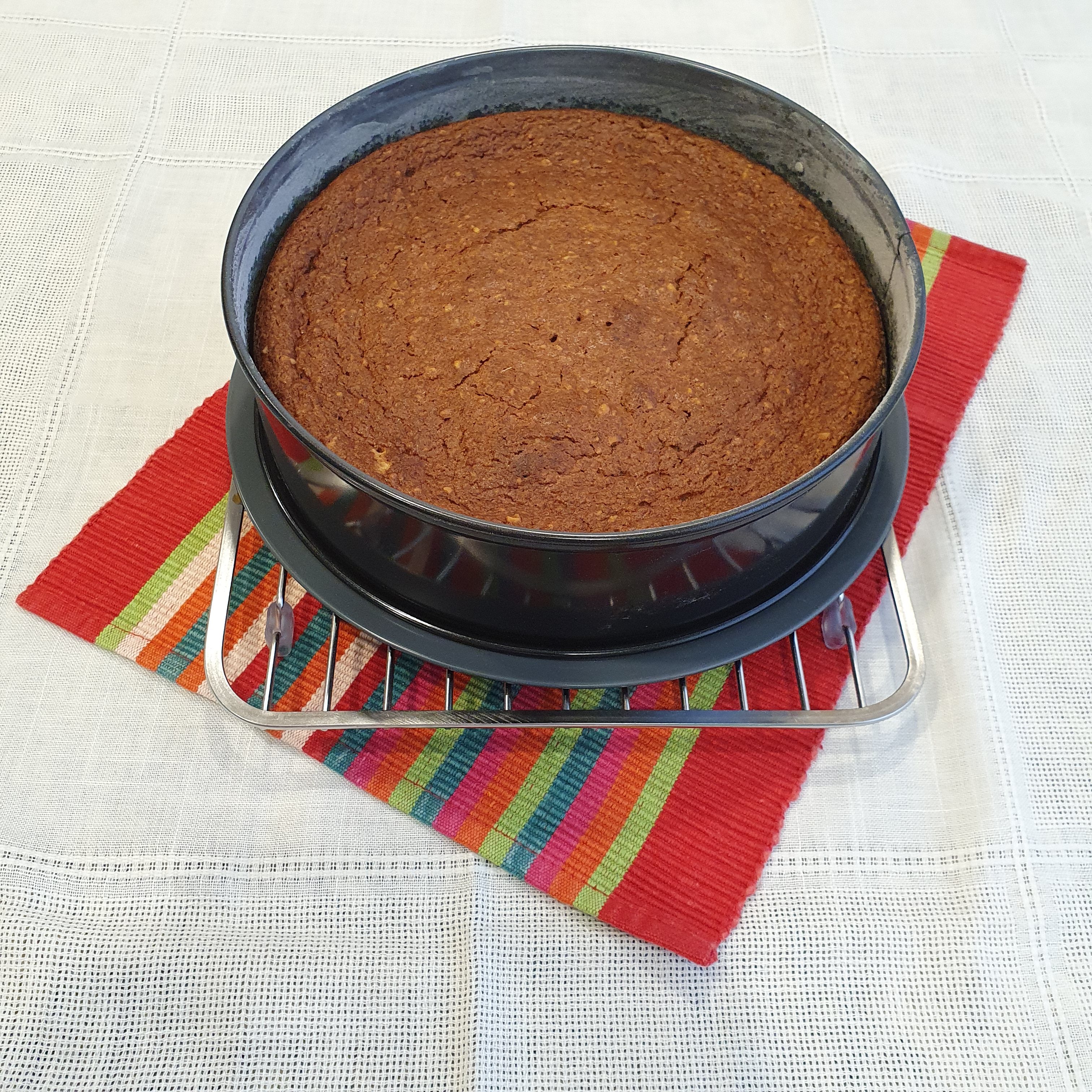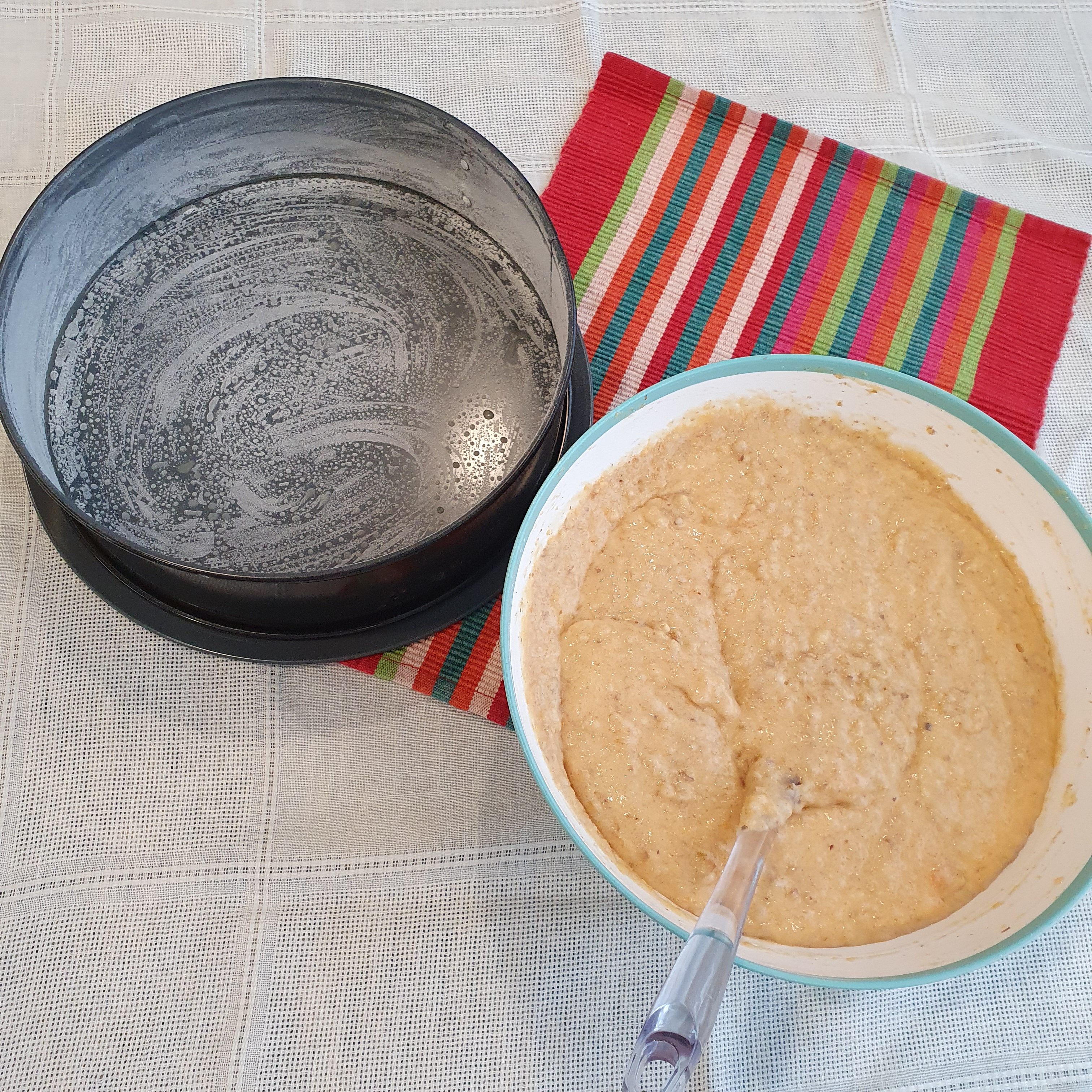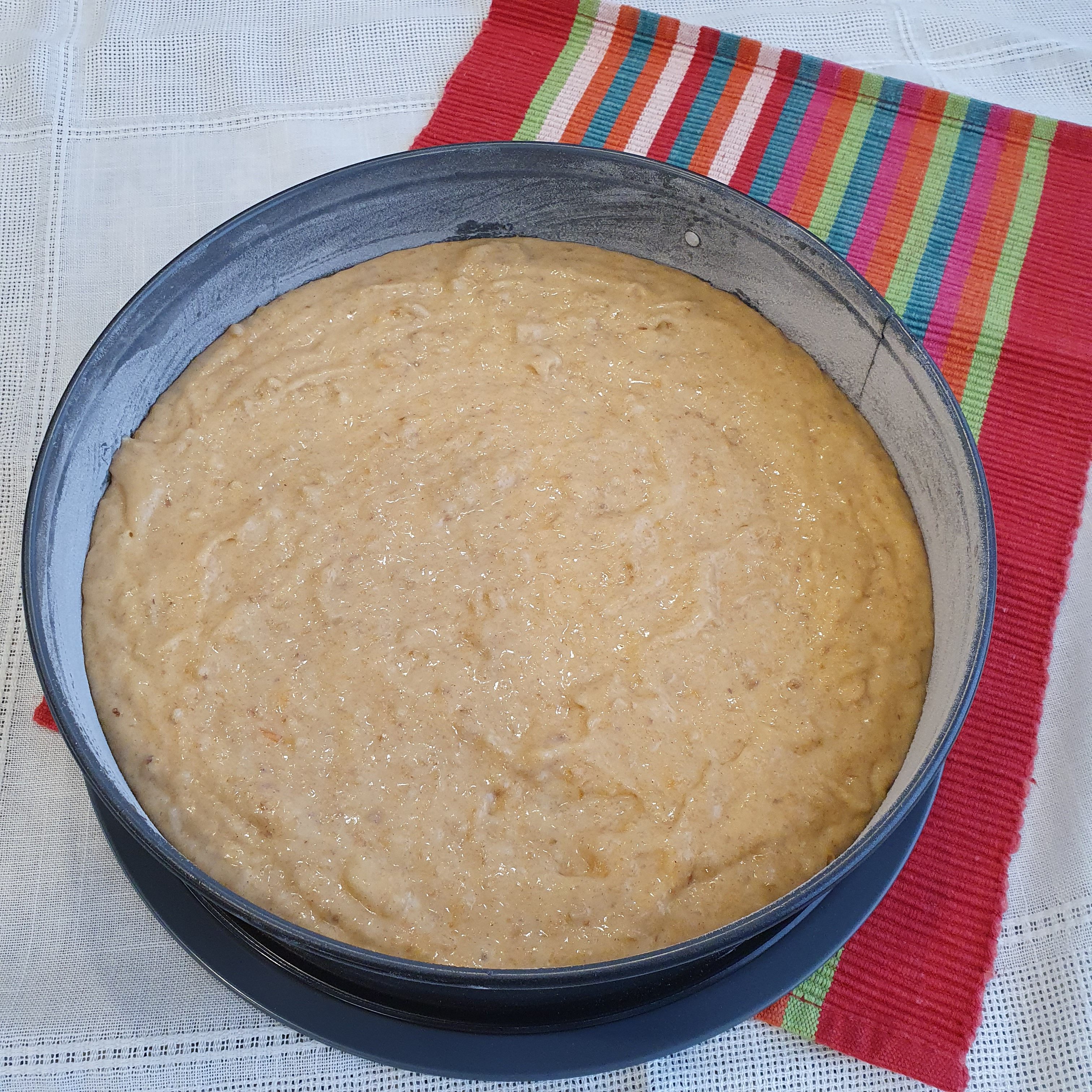 Grease the pan and sprinkle with flour. Pour the mixture and bake in a preheated 180 degree oven for 25 minutes or until done. For me, the baking time was twice as long. So check with a wooden skewer if the cake is ready.
