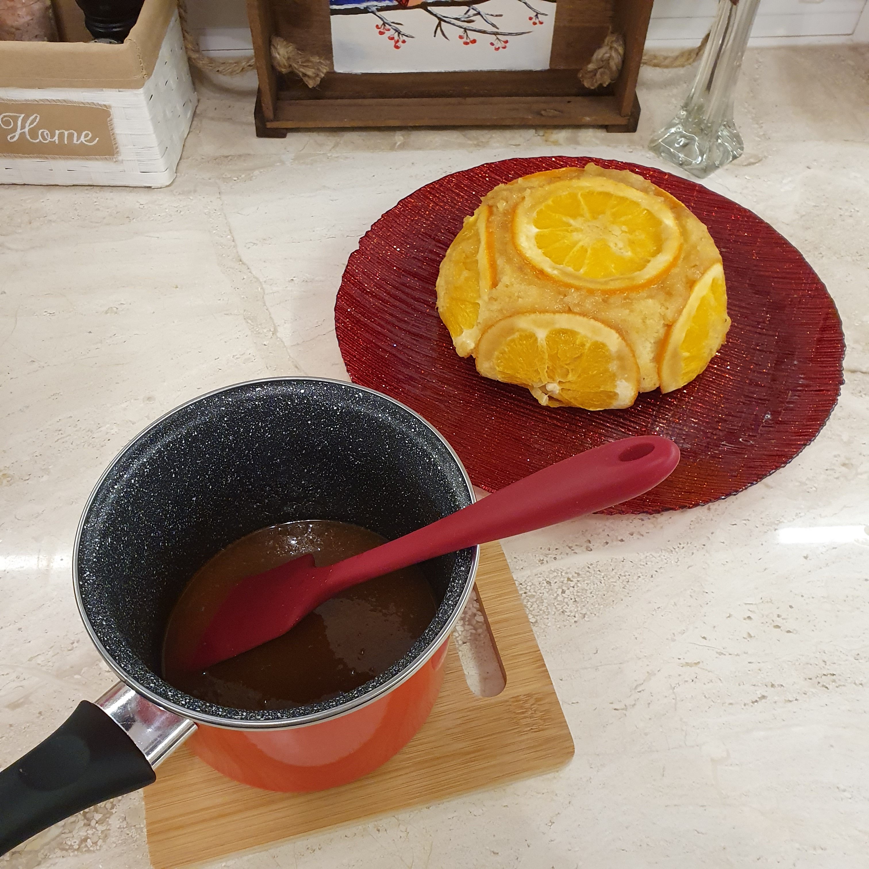Turn the cake on a serving platter and when it has cooled completely, pour the sauce over it.