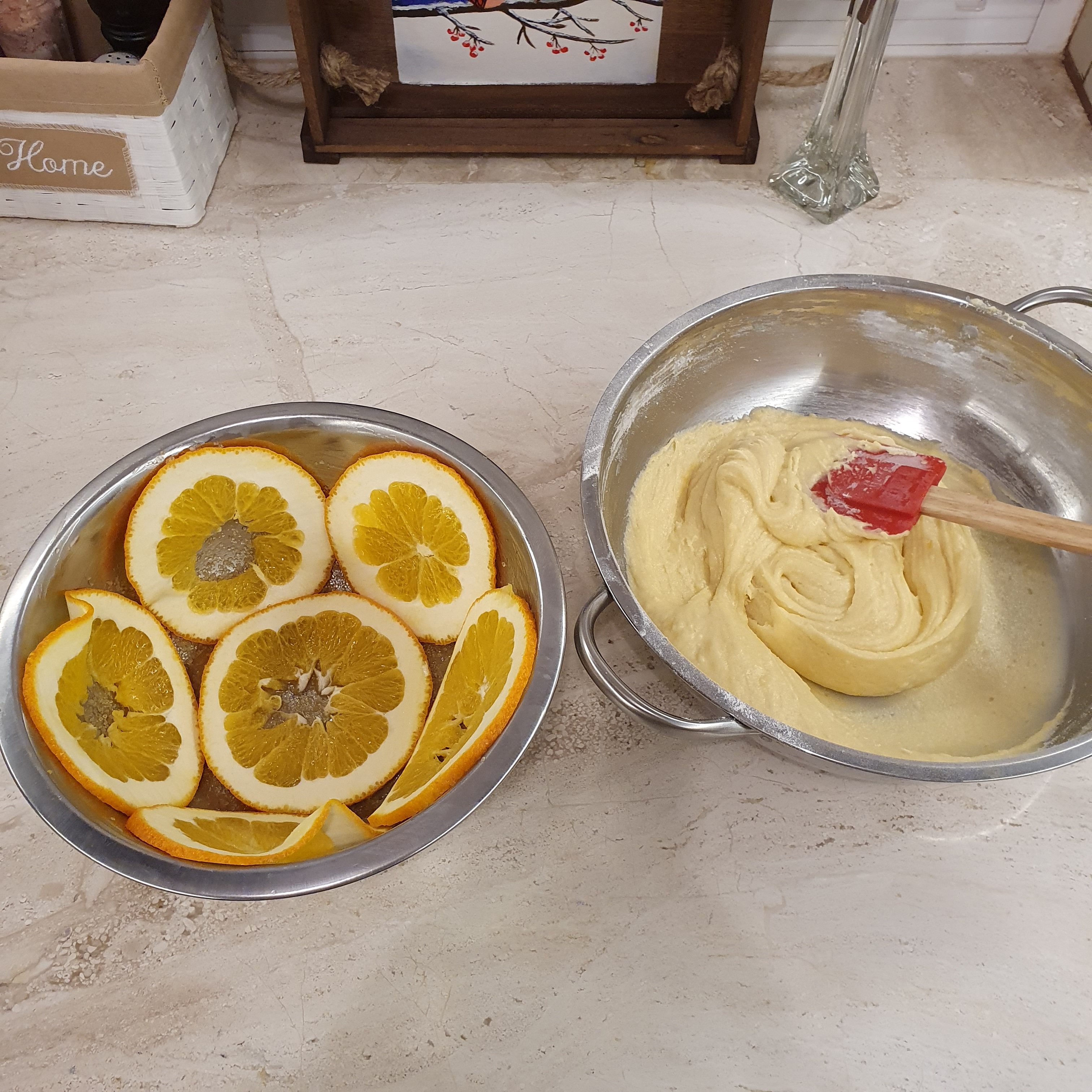 Grease the bottom and walls of a 2 liter bowl with melted butter. Sprinkle with brown sugar and try to cover everywhere. Cut the orange into 3 mm thick slices and cover the bottom and walls of the bowl.