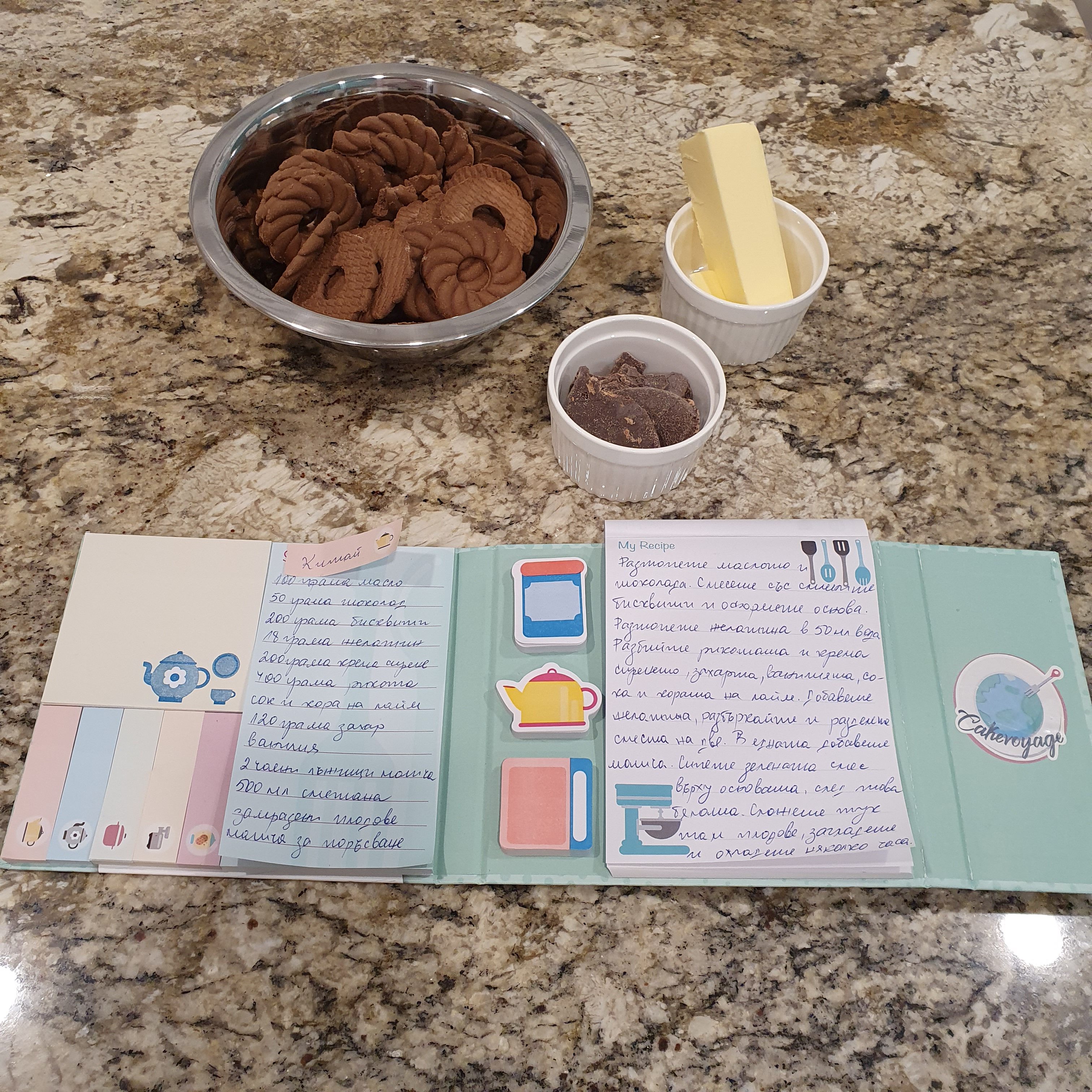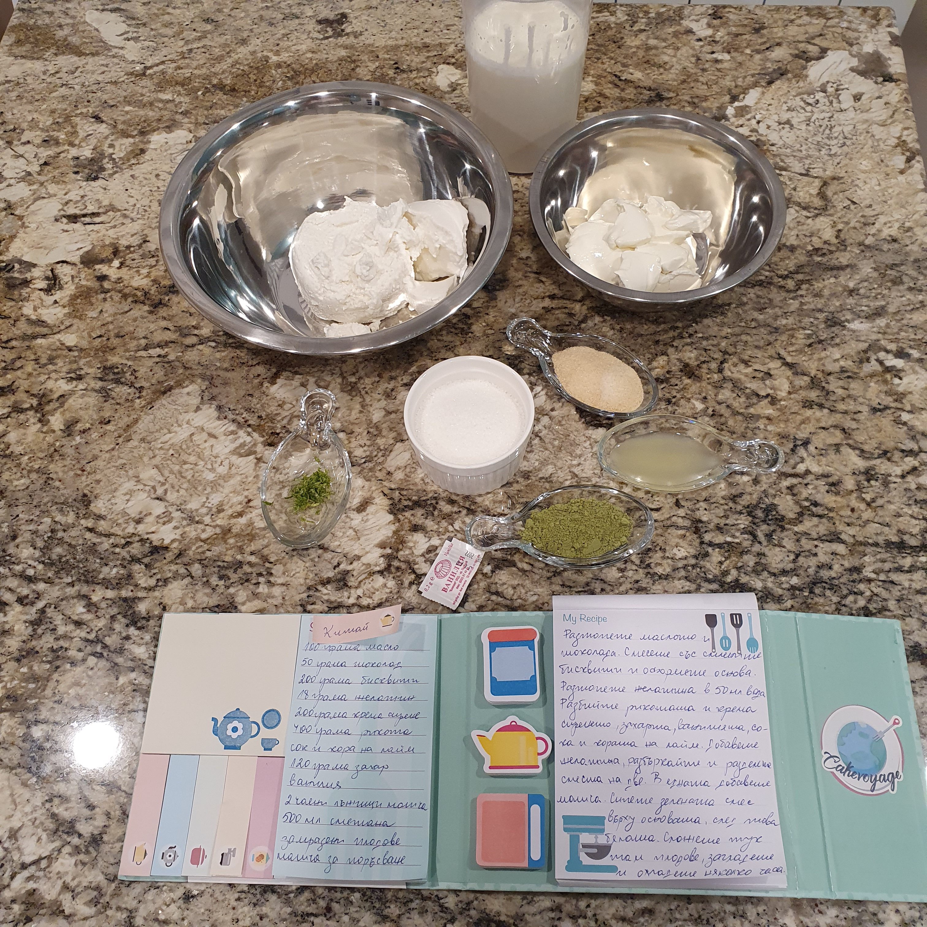 Soak gelatin in 50 ml of cold water until it swells. Beat the ricotta with the cream cheese, sugar, vanilla, lime juice and zest. Separately, whip the cream until fluffy and mix everything. Melt the gelatin in a water bath or microwave. Add it and mix well. Divide the mixture and add the match tea to one part.