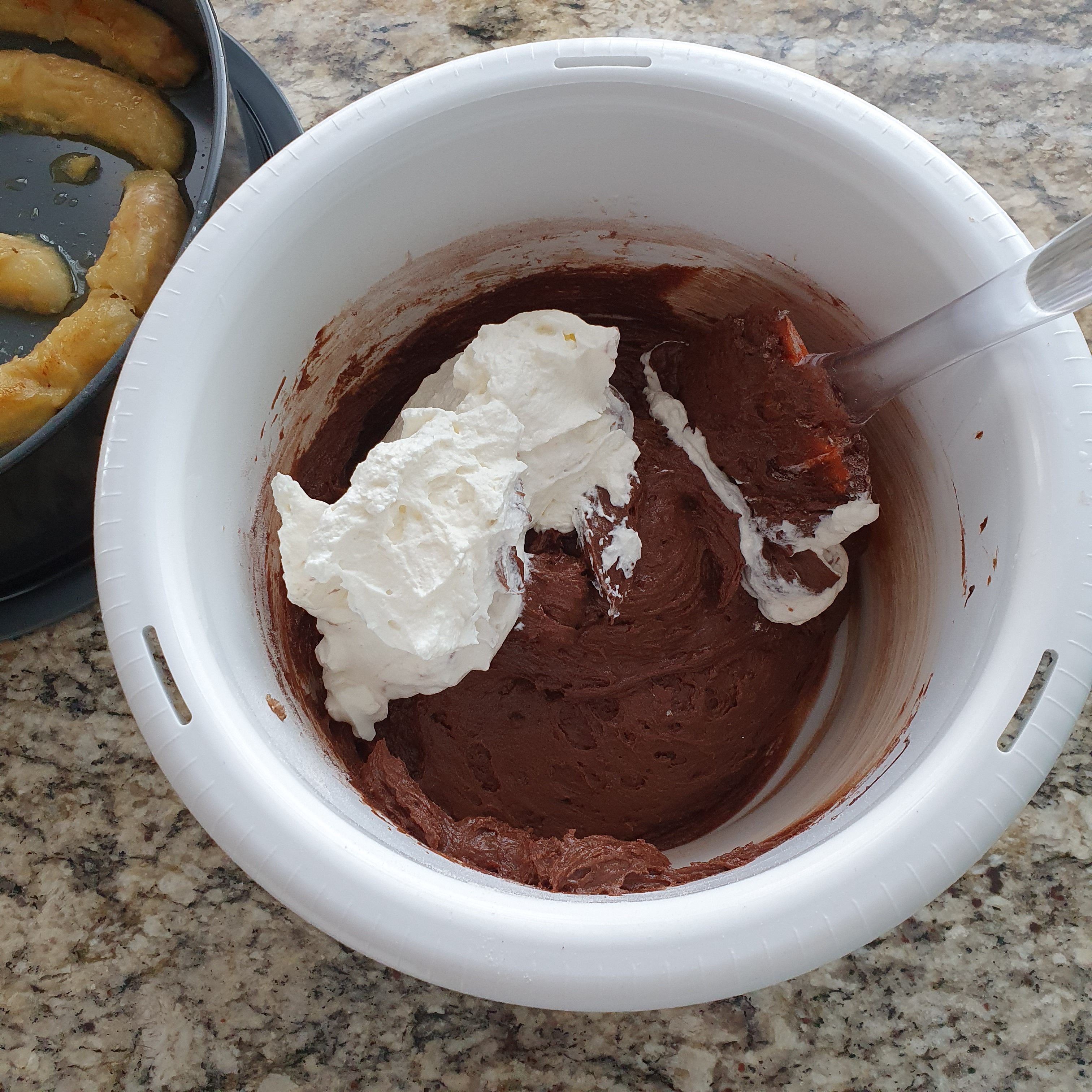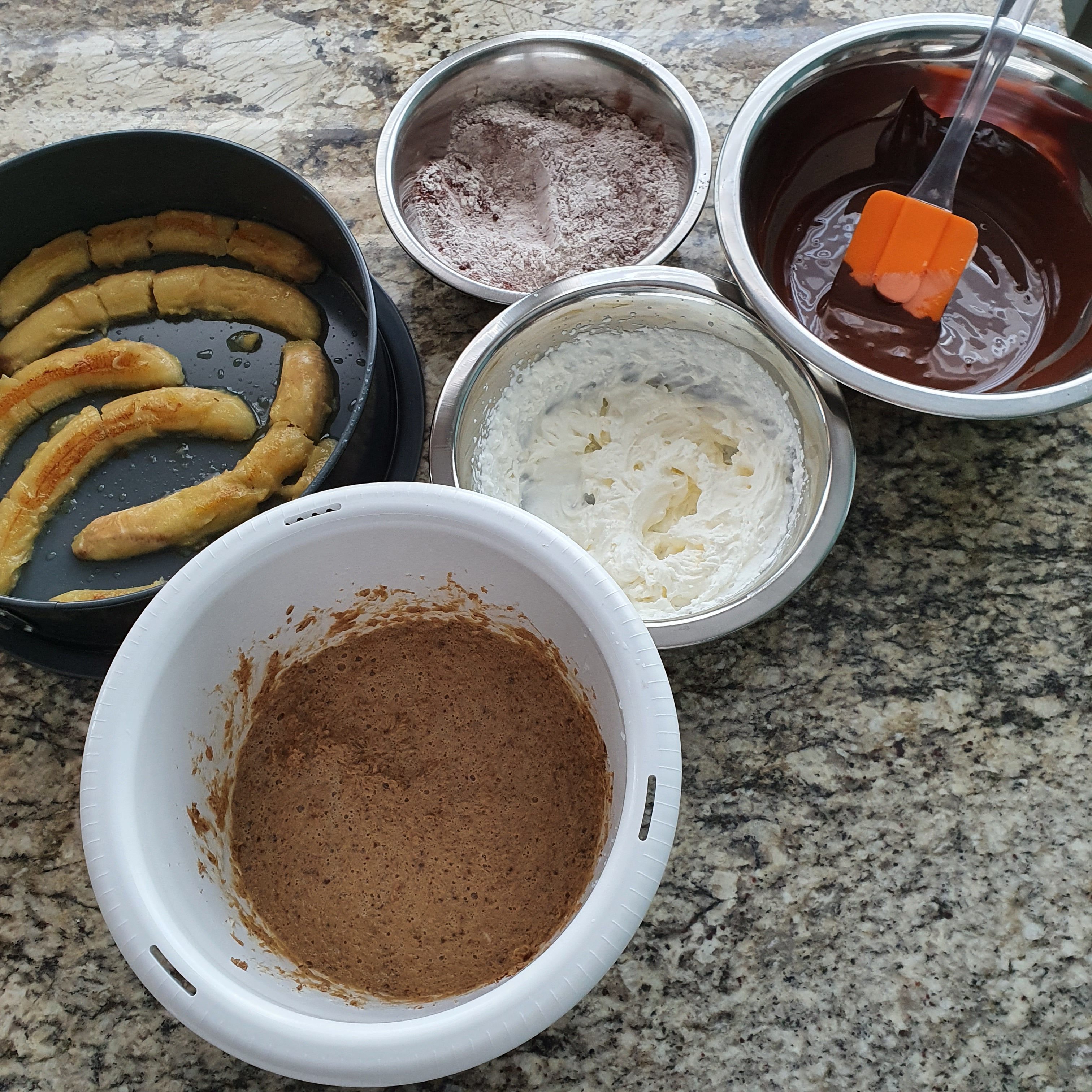 Heat the oven to 170 degrees. Grease a 22 cm diameter pan and arrange the bananas. Beat the butter with the brown sugar. Add the eggs one at a time. Separately mix the cocoa with the flour. Beat the cream and melt the chocolate in a water bath.