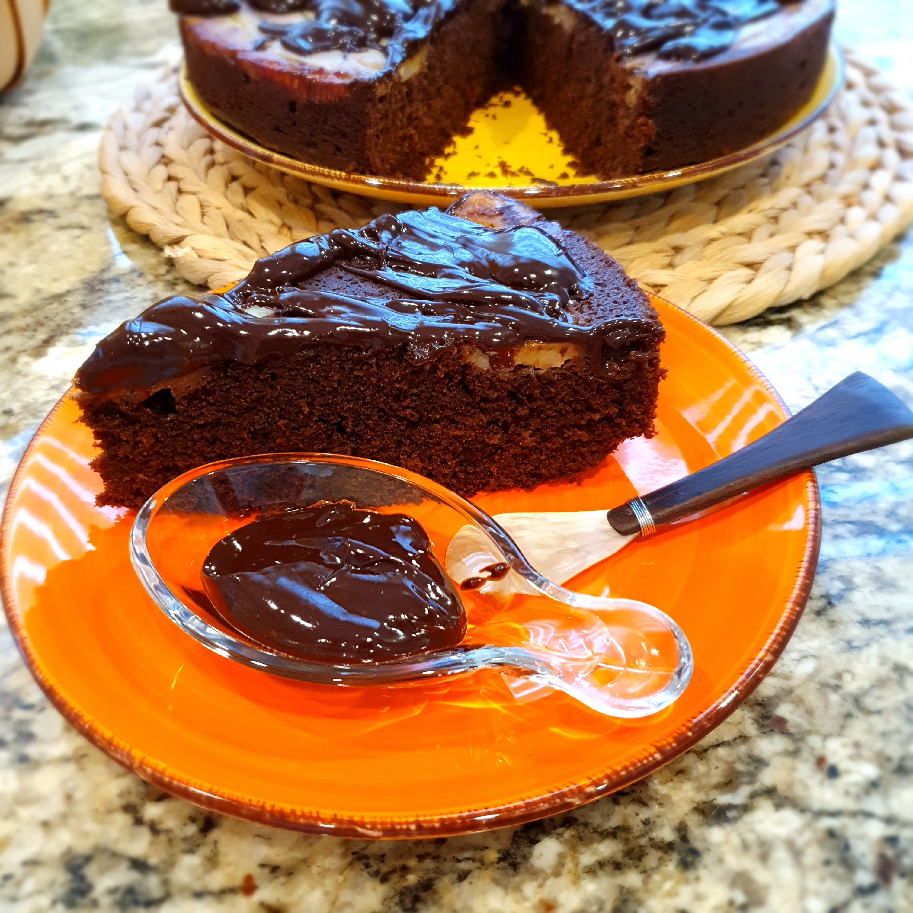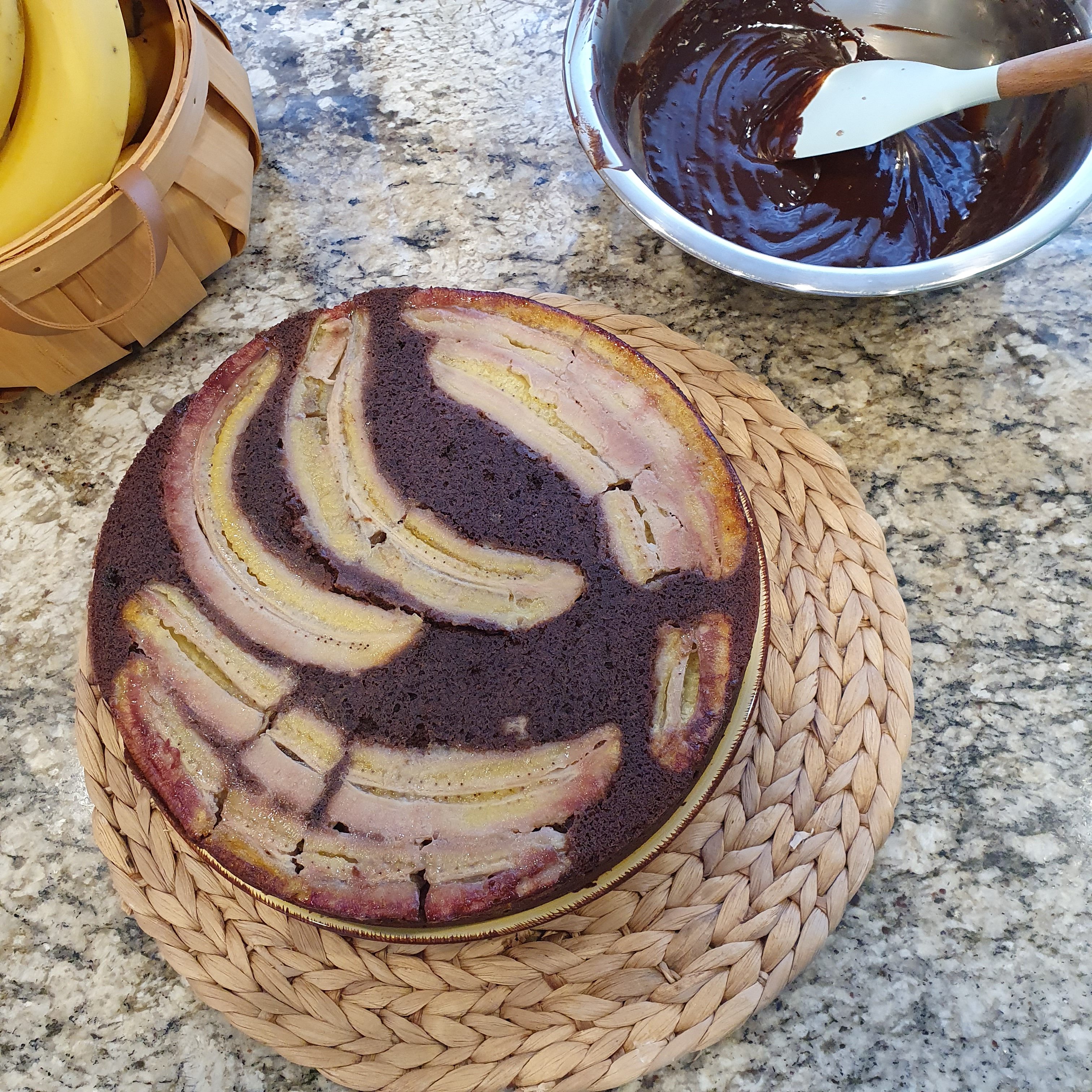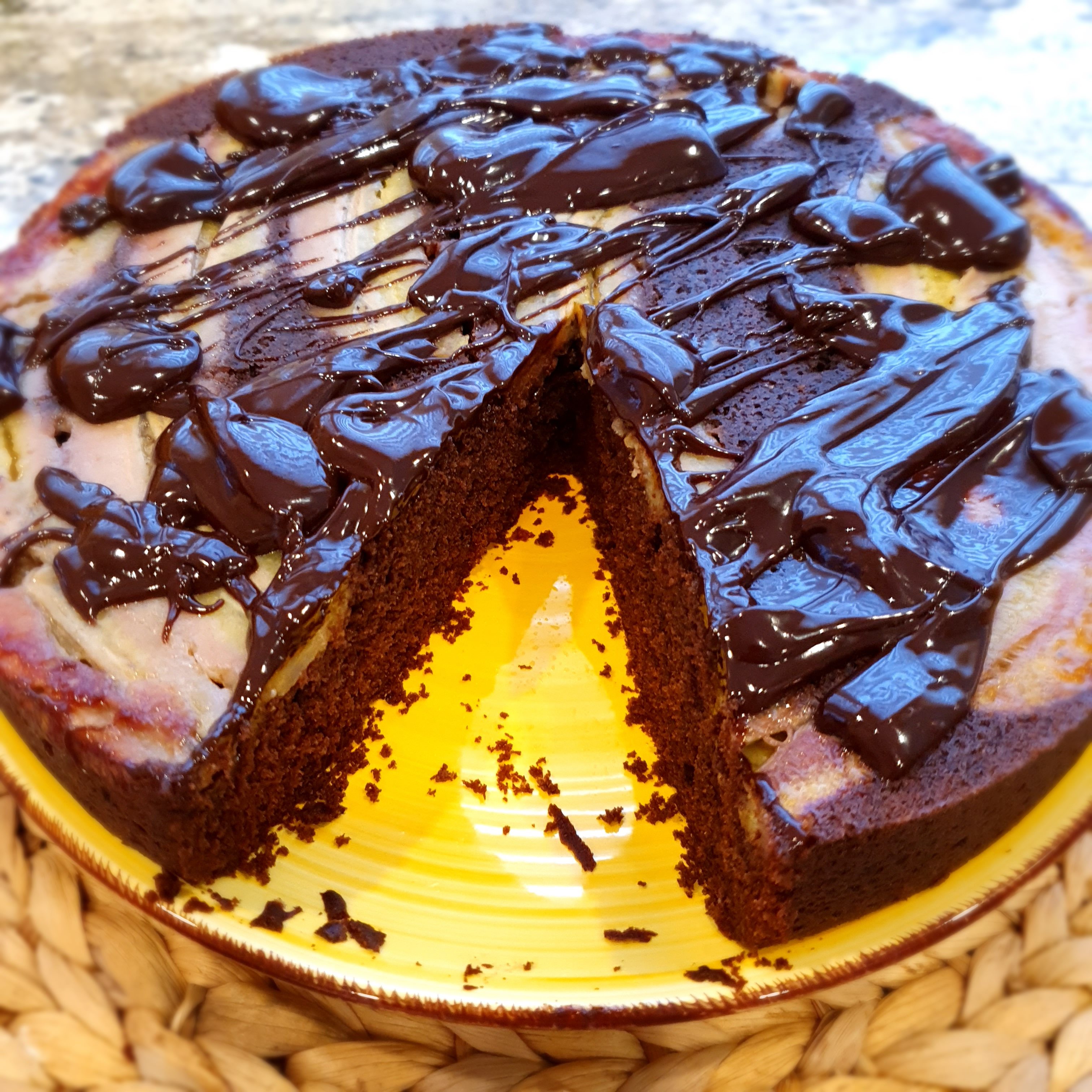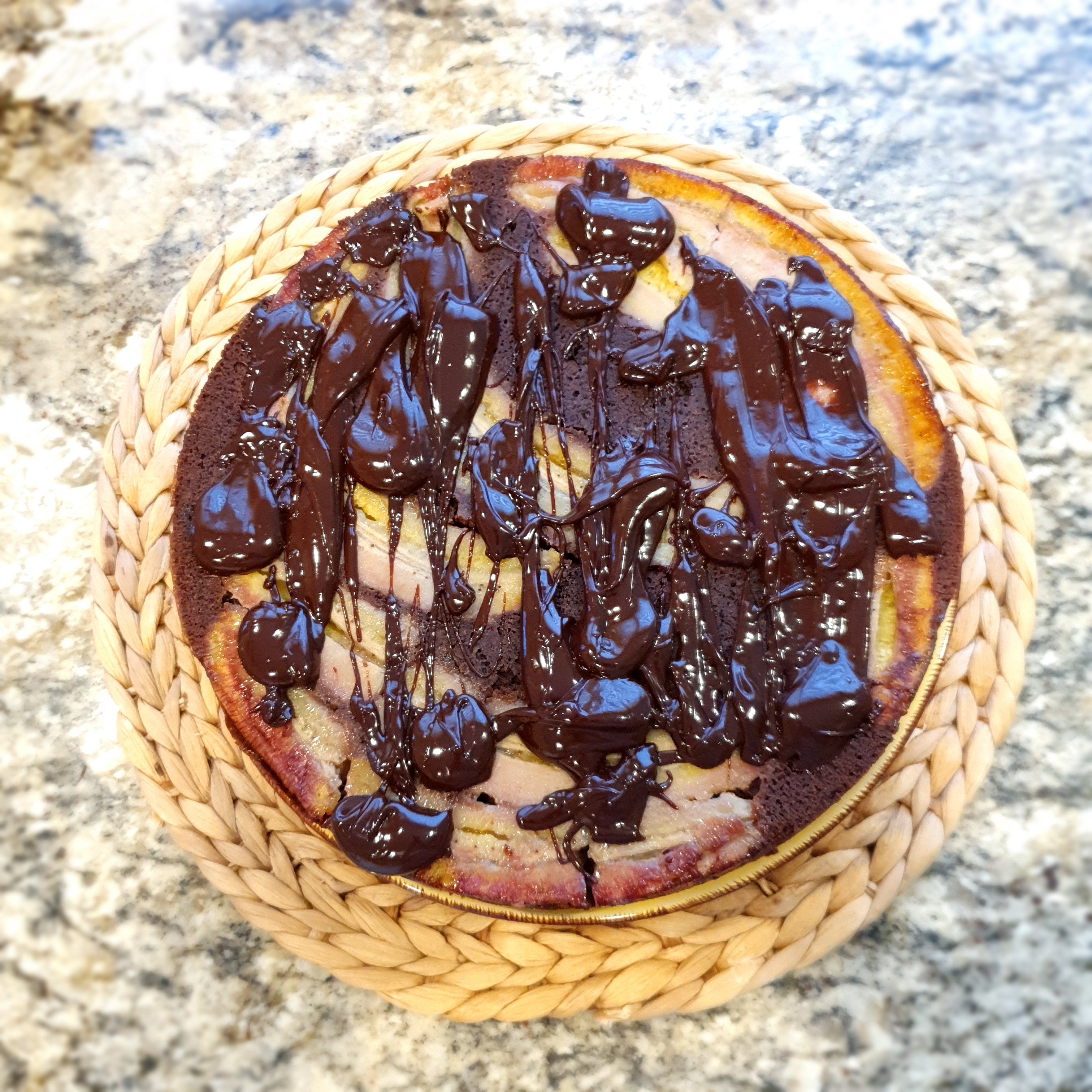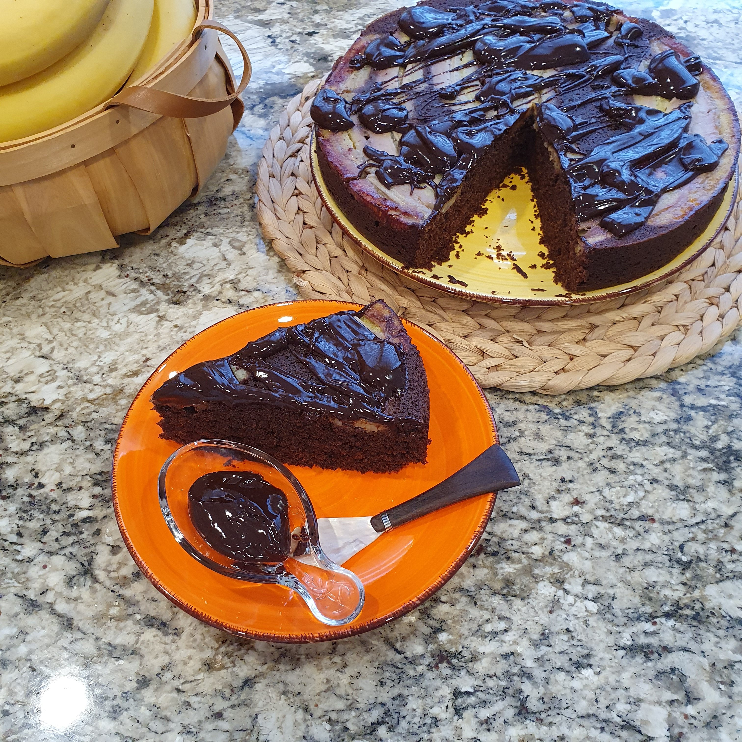 Turn the cake onto a serving plate. Make the chocolate sauce by putting the cream on the stove to boil and pouring it over the chocolate. Blend until smooth and sprinkle loosely over the bananas.