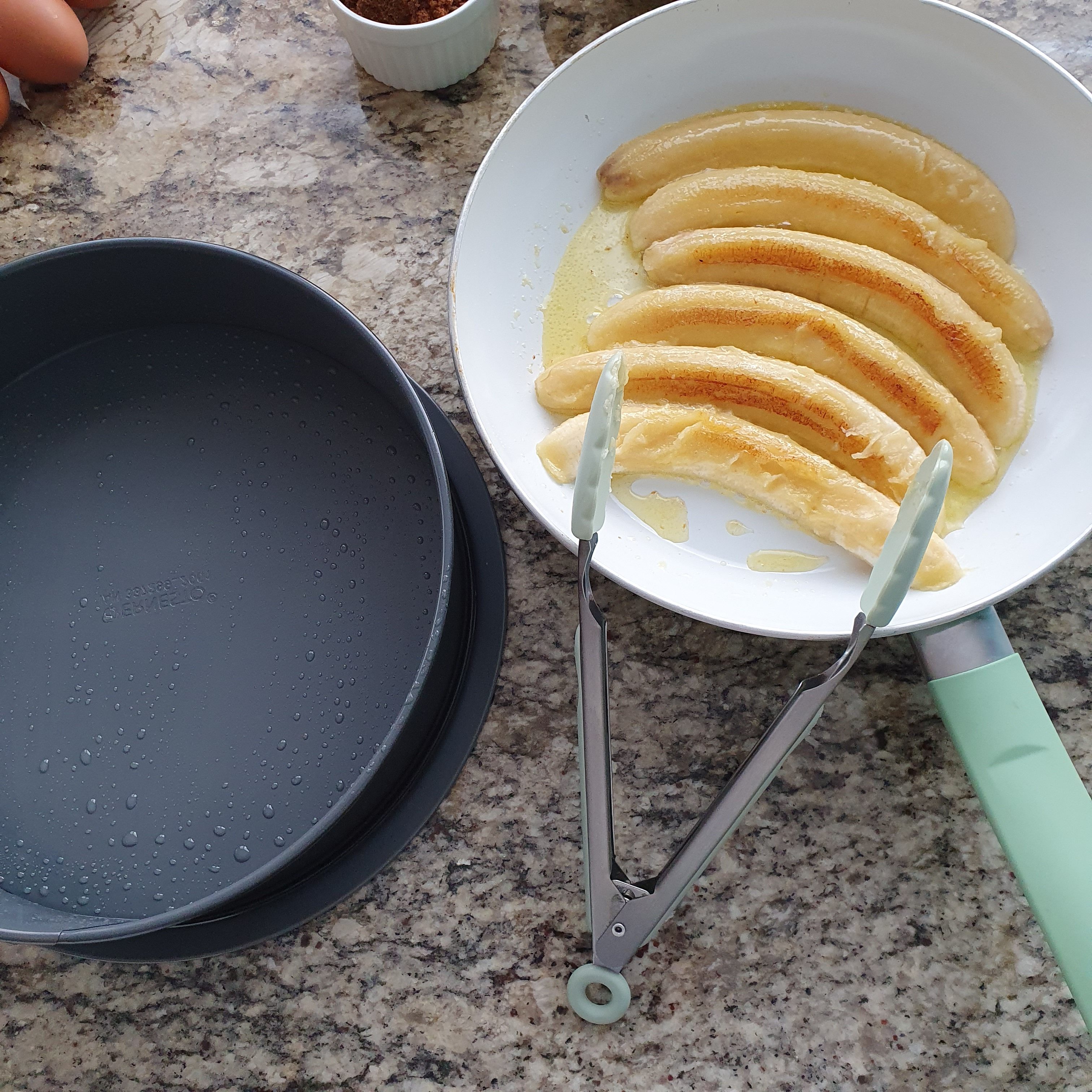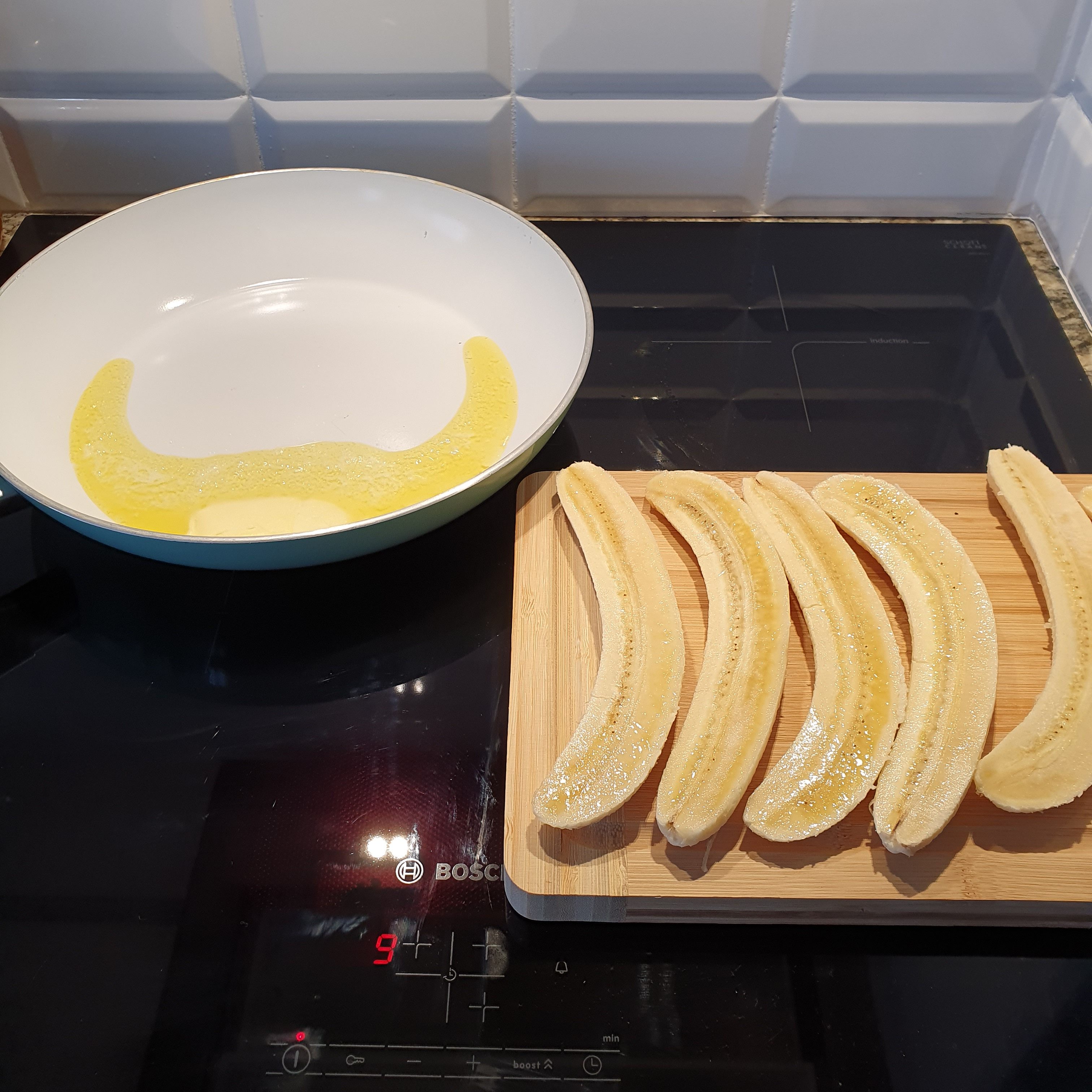 Put 25 grams of butter in a pan. Cut the bananas in half lengthwise and place them in the pan.