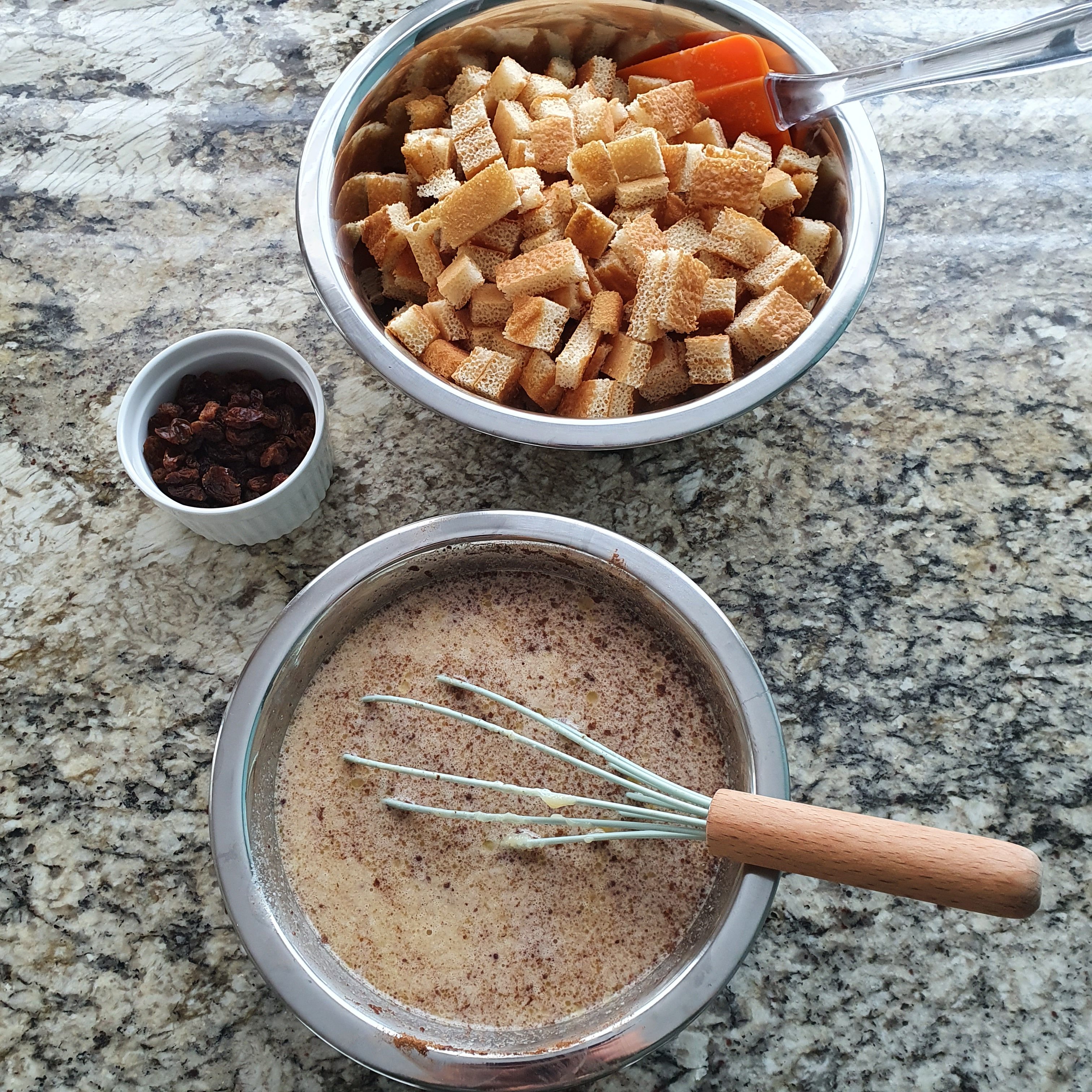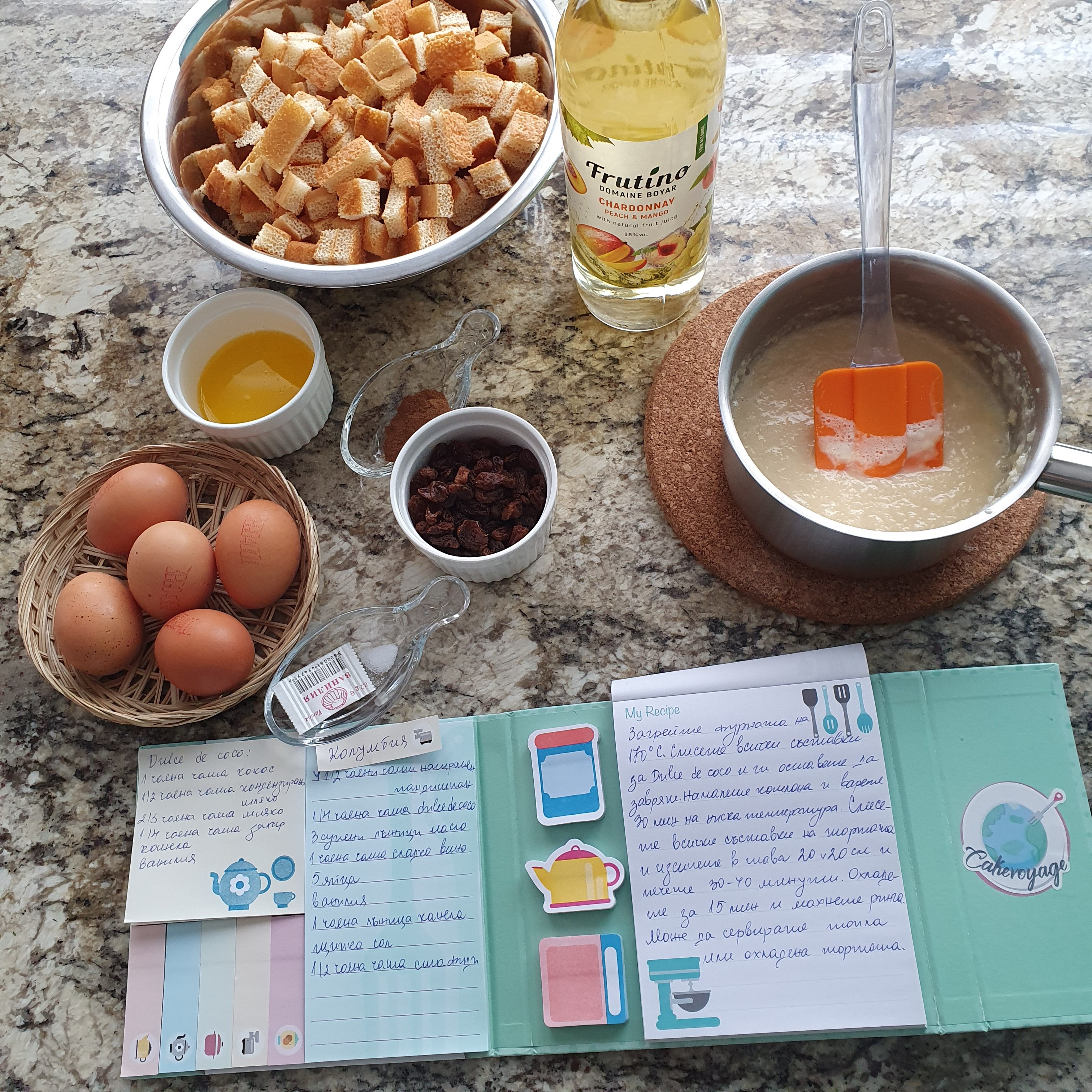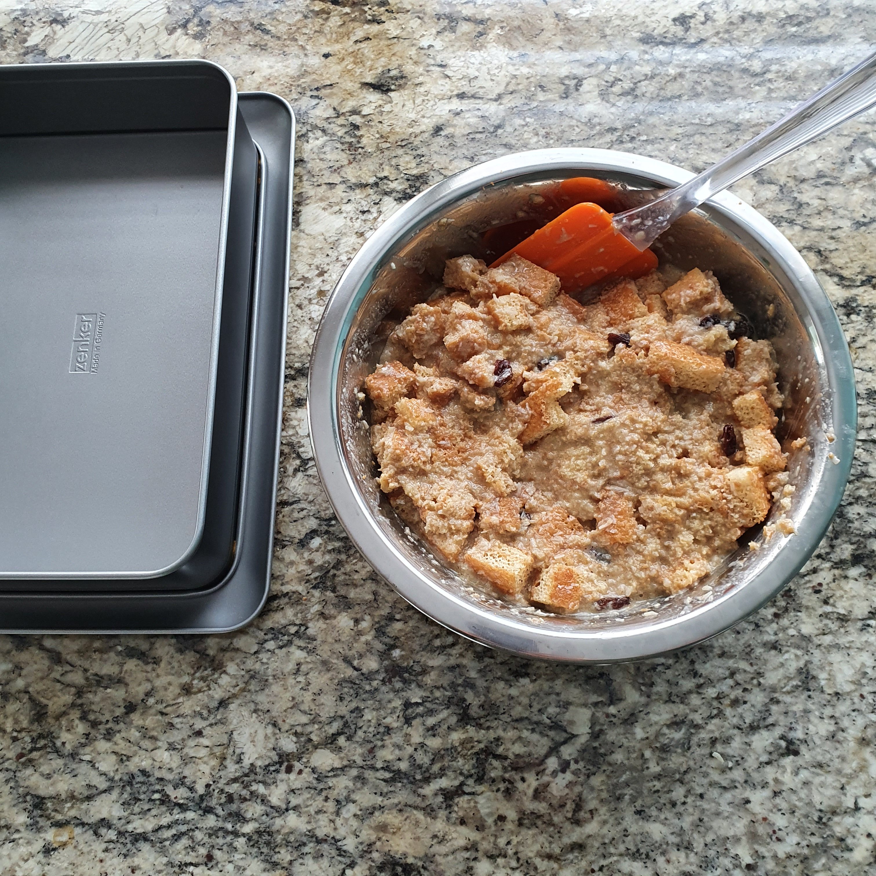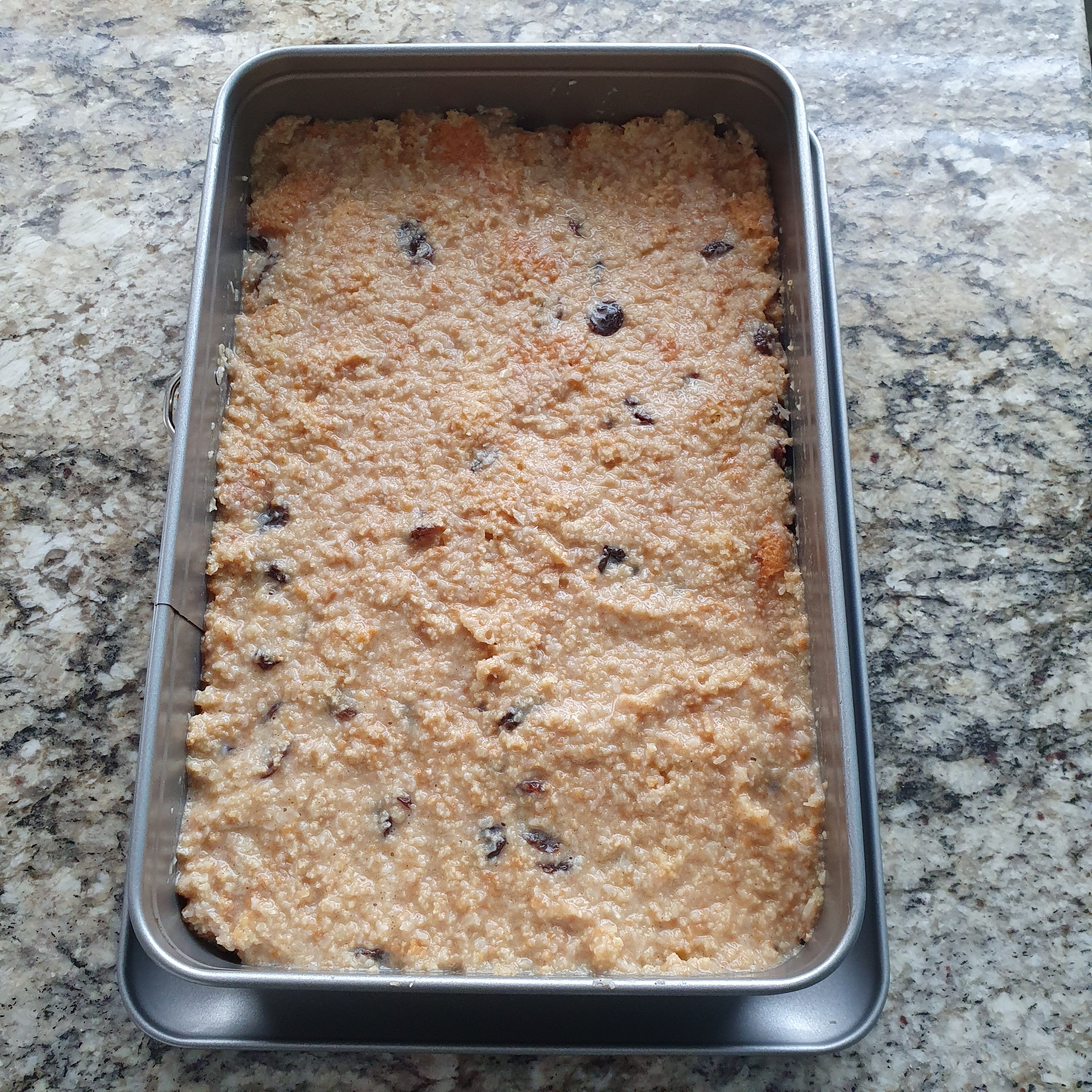 I poured it into a rectangular pan and put it in the oven preheated to 170 degrees to bake for 30-40 minutes. That’s the whole philosophy of the dessert, which looks a lot like bread pudding to me.