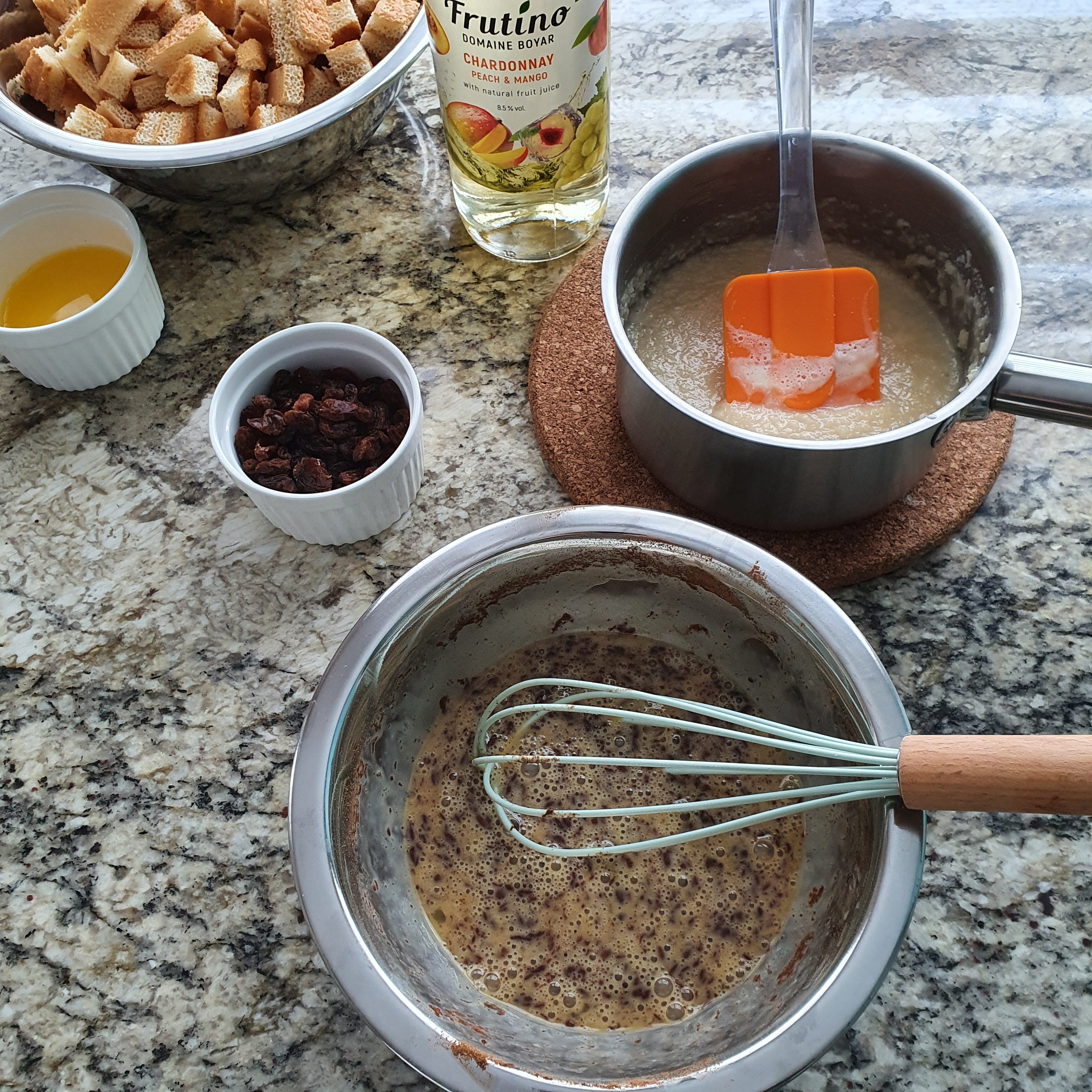 I beat the eggs lightly, added the cinnamon and vanilla, and then the wine.